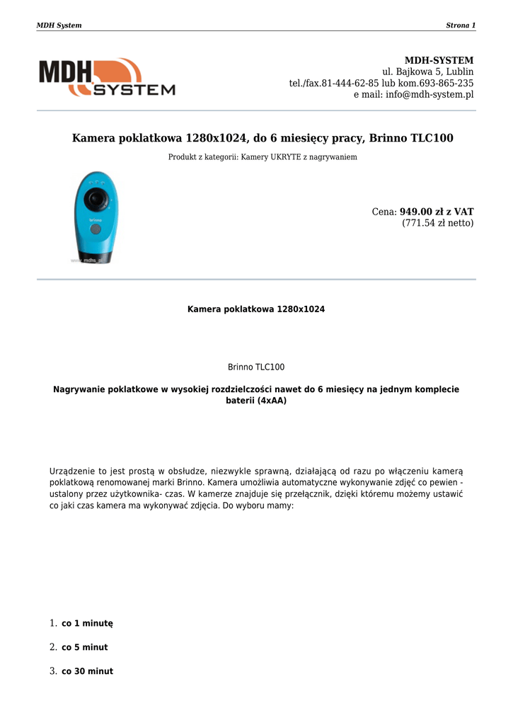 Kamera poklatkowa 1280x1024, do 6 miesięcy pracy - Mdh