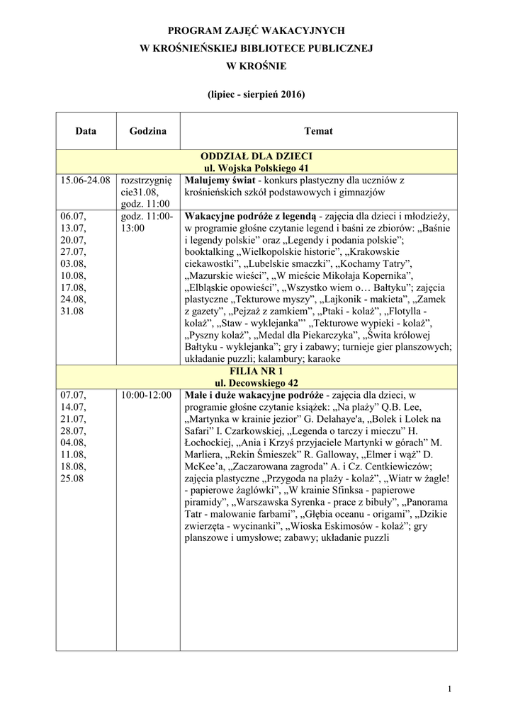 PROGRAM ZAJĘĆ WAKACYJNYCH W KROŚNIEŃSKIEJ BIBLIOTECE PUBLICZNEJ W KROŚNIE (lipiec - sierpień 2016) Data 15.06-24.08 06.07, 13.07, 20.07, 27.07, 03.08, 10.08, 17.08, 24.08, 31.08 07.07, 14.07, 21.07, 28.07, 04.08, 11.08, 18.08, 25.08 Godzina rozstrzygnię cie31.08, godz. 11:00 godz. 11:0013:00 10:00-12:00 Temat ODDZIAŁ DLA DZIECI ul. Wojska Polskiego 41 Malujemy świat - konkurs plastyczny dla uczniów z krośnieńskich szkół podstawowych i gimnazjów Wakacyjne podróże z legendą - zajęcia dla dzieci i młodzieży, w programie głośne czytanie legend i baśni ze zbiorów: „Baśnie i legendy polskie” oraz „Legendy i podania polskie”; booktalking „Wielkopolskie historie”, „Krakowskie ciekawostki”, „Lubelskie smaczki”, „Kochamy Tatry”, „Mazurskie wieści”, „W mieście Mikołaja Kopernika”, „Elbląskie opowieści”, „Wszystko wiem o… Bałtyku”; zajęcia plastyczne „Tekturowe myszy”, „Lajkonik - makieta”, „Zamek z gazety”, „Pejzaż z zamkiem”, „Ptaki - kolaż”, „Flotylla kolaż”, „Staw - wyklejanka”’ „Tekturowe wypieki - kolaż”, „Pyszny kolaż”, „Medal dla Piekarczyka”, „Świta królowej Bałtyku - wyklejanka”; gry i zabawy; turnieje gier planszowych; układanie puzzli; kalambury; karaoke FILIA NR 1 ul. Decowskiego 42 Małe i duże wakacyjne podróże - zajęcia dla dzieci, w programie głośne czytanie książek: „Na plaży” Q.B. Lee, „Martynka w krainie jezior” G. Delahaye'a, „Bolek i Lolek na Safari” I. Czarkowskiej, „Legenda o tarczy i mieczu” H. Łochockiej, „Ania i Krzyś przyjaciele Martynki w górach” M. Marliera, „Rekin Śmieszek” R. Galloway, „Elmer i wąż” D. McKee’a, „Zaczarowana zagroda” A. i Cz. Centkiewiczów; zajęcia plastyczne „Przygoda na plaży - kolaż”, „Wiatr w żagle! - papierowe żaglówki”, „W krainie Sfinksa - papierowe piramidy”, „Warszawska Syrenka - prace z bibuły”, „Panorama Tatr - malowanie farbami”, „Głębia oceanu - origami”, „Dzikie zwierzęta - wycinanki”, „Wioska Eskimosów - kolaż”; gry planszowe i umysłowe; zabawy; układanie puzzli 1 05.07, 07.07, 12.07, 14.07, 19.07, 21.07, 26.07, 28.07, 02.08. 04.08, 18.08, 23.08, 25.08 05.07, 07.07, 12.07, 14.07, 19.07, 21.07, 26.07, 28.07, 02.08, 04.08, 09.08, 11.08, 16.08, 18.08, 23.08, 25.08, 30.08 05.07, 12.07, 19.07, 26.07, 02.08, 09.08, 16.08, 23.08, 30.08 9:30-11:00 10:30-12:00 10:00-12:00 FILIA NR 2 ul. Grunwaldzka 2 Wakacje z humorem - zajęcia dla dzieci, w programie głośne czytanie fragmentów książek z cyklu „Dynastia Miziołków” J. Olech; zajęcia plastyczne „Pamiątka z zeszłorocznych wakacji”, „Smok wawelski”, „Wielka grota smoka”, „Zamek”, „Pociągiem przez wakacje”, „Kolorowe zoo”, „Mój rysunek na szkle”, „Ryby w akwarium”; gry planszowe i stolikowe; zabawy FILIA NR 3 ul. Witosa 1e Biblioteczne atrakcje - zero nudy w wakacje - zajęcia dla dzieci, w programie głośne czytanie fragmentów książek „Wielka wyprawa Ciumków” P. Beręsewicza, „Reks, szczeniak z wakacji” H. Webb; zajęcia plastyczne „Kolorowe motyle i biedronki z wakacyjnymi pozdrowieniami”, „Barwne witraże, girlandy, pompony”, „Portrety naszych literackich ulubieńców”, „Zwierzaki - śmieszaki malowane palcami”, „Wakacyjna ramka”, „Lato na obrazku”, „Schowki i kieszonki na skarby żabka, biedronka, pszczoła”, „Zoo z papieru i plasteliny”; gry planszowe, zabawy ruchowe, quizy, rozwiązywanie krzyżówek; gry literackie FILIA NR 4 ul. Krakowska 124 Wakacyjne spotkania z Kubą i Bubą - zajęcia dla dzieci i młodzieży, w programie głośne czytane fragmentów książek „Rok z Kubą i Bubą” i „Bon czy ton: savoir-vivre dla dzieci” G. Kasdepke; projekcja filmu animowanego „Fantastyczni bohaterowie zwiedzają Krosno”; zajęcia plastyczne wykonywanie rekwizytów do inscenizacji „Teleludek”, sylwetek Kuby i Buby, pocztówki z Krosna, tworzenie obrazkowego, zdrowego menu; inscenizacja „Teleludek”; gry i zabawy związane z projektem „EkoPaka - zamykamy obieg surowców”; quizy; gra planszowa „Labirynt z zagadkami po Krośnie”; zabawy integracyjne z chustą Klanzy; rozwiązywanie tangramów, krzyżówek i rebusów 2 06.07, 13.07, 20.07, 27.07, 03.08, 24.08, 30.08 06.07, 13.07, 20.07, 27.07, 03.08, 10.08, 17.08, 24.08, 31.08 07.07, 14.07, 21.07, 28.07, 04.08, 11.08, 18.08, 25.08 10:00-12:00 FILIA NR 5 ul. Kopernika 17 Wakacyjne rozmaitości - biblioteczne możliwości - zajęcia dla dzieci, w programie głośne czytanie wybranych bajek i opowiadań dla dzieci; zajęcia plastyczne - wykonywanie ilustracji do przeczytanych utworów oraz kolorowych motyli z papieru; gry stolikowe (scrabble, szachy, bierki, memory); kalambury „Jakie to zwierzę?”; układanie puzzli FILIA NR 6 - CENTRUM MULTIMEDIALNE ul. Ordynacka 8 12:00-13:00 Wakacyjne podróże - spotkania adresowane do osób dorosłych, w programie projekcja filmów W. Cejrowskiego o Etiopii, Namibii, Wenezueli, Hiszpanii, Meksyku, Madagaskarze, Amazonii, Tajlandii oraz projekcja filmu „Kobiety świata” M. Wojciechowskiej 11:00-13:00 FILIA NR 7 ul. Rzeszowska 1 Zapraszamy do Zwierzątkowa - zajęcia dla dzieci, w programie głośne czytanie fragmentów książek „Kubuś Puchatek” A.A. Milnego, „Krecik i rakieta” Z. Milera, „Franklin” P. Bourgeois, „Elmer: wielka księga przygód” D. McKee'a, „Pszczółka Maja i jej przygody” W. Bonsels, „Reksio - cztery pory roku” A. Sójki oraz książek z serii „Zwierzęta Oli” M. Doinet i wierszy J. Brzechwy; zajęcia plastyczne wykonywanie postaci zamieszkujących Stumilowy Las oraz pszczółek i motyli, budowa pojazdu kosmicznego, malowanie kolegów żółwika Franklina i niezwykłego świata dzikich zwierząt; gry i zabawy 3