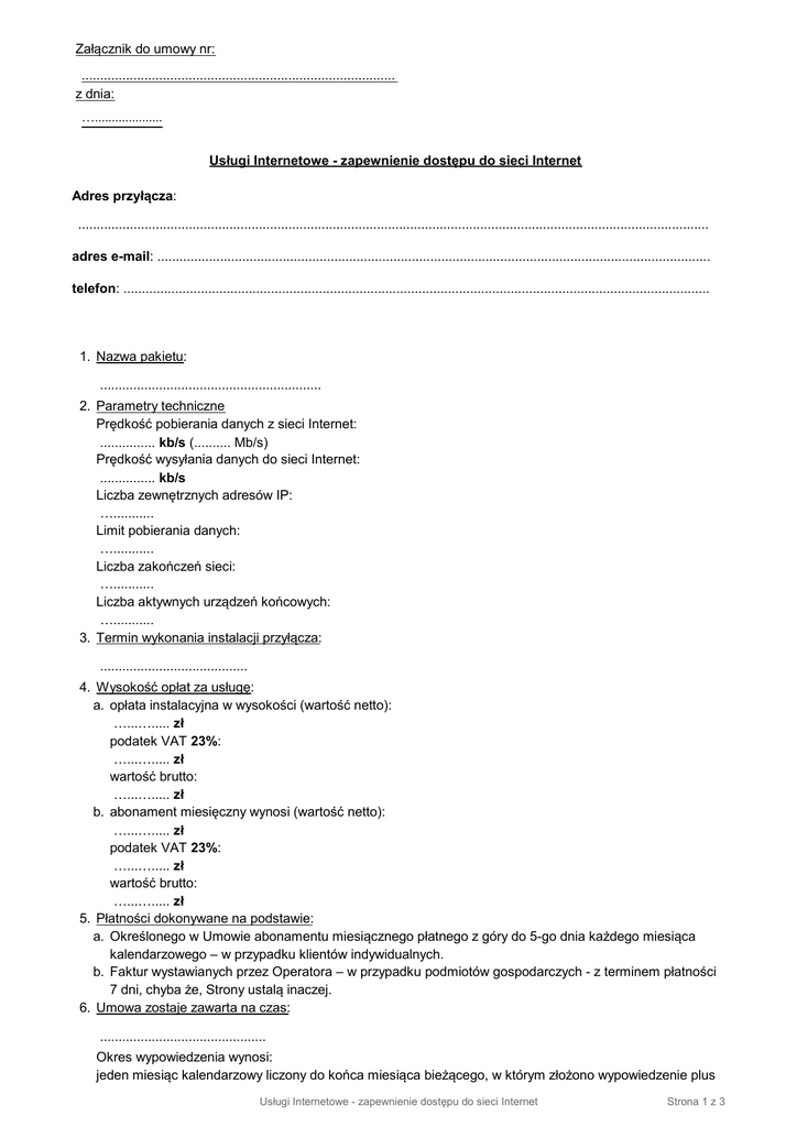 Załącznik do umowy nr: ..................................................................................... z dnia: ….................... Usługi Internetowe - zapewnienie dostępu do sieci Internet Adres przyłącza: ........................................................................................................................................................................... adres e-mail: ...................................................................................................................................................... telefon: ............................................................................................................................................................... 1. Nazwa pakietu: ............................................................ 2. Parametry techniczne Prędkość pobierania danych z sieci Internet: ............... kb/s (.......... Mb/s) Prędkość wysyłania danych do sieci Internet: ............... kb/s Liczba zewnętrznych adresów IP: …........... Limit pobierania danych: …........... Liczba zakończeń sieci: …........... Liczba aktywnych urządzeń końcowych: …........... 3. Termin wykonania instalacji przyłącza: ........................................ 4. Wysokość opłat za usługę: a. opłata instalacyjna w wysokości (wartość netto): …...…..... zł podatek VAT 23%: …...…..... zł wartość brutto: …...…..... zł b. abonament miesięczny wynosi (wartość netto): …...…..... zł podatek VAT 23%: …...…..... zł wartość brutto: …...…..... zł 5. Płatności dokonywane na podstawie: a. Określonego w Umowie abonamentu miesiącznego płatnego z góry do 5-go dnia każdego miesiąca kalendarzowego – w przypadku klientów indywidualnych. b. Faktur wystawianych przez Operatora – w przypadku podmiotów gospodarczych - z terminem płatności 7 dni, chyba że, Strony ustalą inaczej. 6. Umowa zostaje zawarta na czas: ............................................. Okres wypowiedzenia wynosi: jeden miesiąc kalendarzowy liczony do końca miesiąca bieżącego, w którym złożono wypowiedzenie plus Usługi Internetowe - zapewnienie dostępu do sieci Internet Strona 1 z 3 jeden pełny miesiąc. 7. Forma komunikacji z Abonentem, w zakresie dochodzenia należności: poczta elektroniczna - bezpłatnie poczta tradycyjna - zgodnie z obowiązującym Cennikiem wiadomości tekstowe sms - zgodnie z obowiązującym Cennikiem 8. Za świadczenie usług w miesiącu aktywacji Operator naliczy kwotę proporcjonalną do ilości dni pozostałych do końca miesiąca, liczonych od dnia następnego po dniu podpisania protokołu aktywacyjnego, w kwocie 1/28/30/31 wartości abonamentu miesięcznego za każdy dzień (w zależności od ilości dni w miesiącu). 9. Termin płatności abonamentu za niepełny miesiąc kalendarzowy oraz za opłaty aktywacyjne i instalacyjne upływa z końcem miesiąca w którym nastąpiła aktywacja usługi lub w przypadku rozliczeń na podstawie faktur - termin określony jest w fakturze. 10. Rozpoczęcie naliczania opłat za usługi następuje od dnia następnego po dniu aktywacji usług. 11. Czynności instalacyjne wykonuje Operator. 12. Sprzęt jest własnością Operatora/Abonenta*. 13. W przypadku rozwiązania Umowy przez Abonenta lub Operatora, z przyczyn leżących po stronie Abonenta, przed upływem okresu na jaki Umowa została zawarta, Abonent zostaje obciążony kosztami rozwiązania Umowy w wysokości przyznanych ulg abonamentowych i instalacyjnych, pomniejszonych o proporcjonalną ich wartość za okres od dnia zawarcia Umowy do dnia jej rozwiązania. 14. Wysokość kwoty z tytułu zwrotu ulg abonamentowych obliczana będzie według wzoru: wysokość kwoty = suma ulg abonamentowych za wszystkie okresy rozliczeniowe x liczba pełnych miesięcy pozostałych do zakończenia umowy / liczbę miesięcy na ile została zawarta Umowa. 15. Regulamin – uzupełnienie do regulaminu ogólnego: 1. Podstawową formą komunikowania się między Operatorem a Abonentem stanowi poczta elektroniczna. Wszelkie informacje dotyczące usługi internetowej, w tym indywidualna korespondencja z Abonentem, będą przesyłane na konto pocztowe przyznane Abonentowi przez Operatora. Korespondencja może być przesyłana na inne konto pocztowe wskazane przez Abonenta. 2. W dniu rozwiązania umowy konto pocztowe oraz strona www Abonenta zostają usunięte wraz z całą zawartością. 3. Jeżeli przez okres 6 miesięcy Abonent nie skorzysta z dostępu do konta pocztowego przyznanego przez Operatora, zawartość skrzynki pocztowej zostanie usunięta, jednak adres e-mail zostanie zachowany. Ponowna aktywacja konta pocztowego dokonywana będzie na wniosek Abonenta. 4. Abonent, który zawarł Umowę na czas określony, ma prawo do czasowego zawieszenia świadczenia usług na okres nie przekraczający trzech miesięcy, ze skutkiem od pierwszego dnia dnia następnego miesiąca, w każdym roku kalendarzowym. 5. Wniosek o czasowe zawieszenie usług, Abonent winien złożyć najpóźniej ostatniego dnia miesiąca, poprzedzającego okres zawieszenia. 6. W przypadku umowy na czas określony, umowa ulega przedłużeniu o okres zawieszenia świadczenia usług. 7. W okresie zawieszenia świadczenia usług Abonent zwolniony jest z obowiązku uiszczania na rzecz Operatora opłat abonamentowych. 8. Zawieszenie usług może nastąpić w przypadku nie zalegania z jakimikolwiek płatnościami wobec Operatora. 9. Okres zawieszenia świadczenia usług kończy się zawsze ostatniego dnia miesiąca. 10. Czasowe zawieszenie usług może zostać skrócone na pisemny lub telefoniczny wniosek Abonenta. 11. W przypadku umowy na czas nieokreślony Abonentowi przysługuje prawo zawieszenia świadczenia usług na okres nie dłuższy niż 3 miesiące kalendarzowe, w każdym roku kalendarzowym. Możliwe jest skorzystanie z dłuższego okresu zawieszenia, do 12 miesięcy, z tym, że ponowne zawieszenie usług może zostać dok