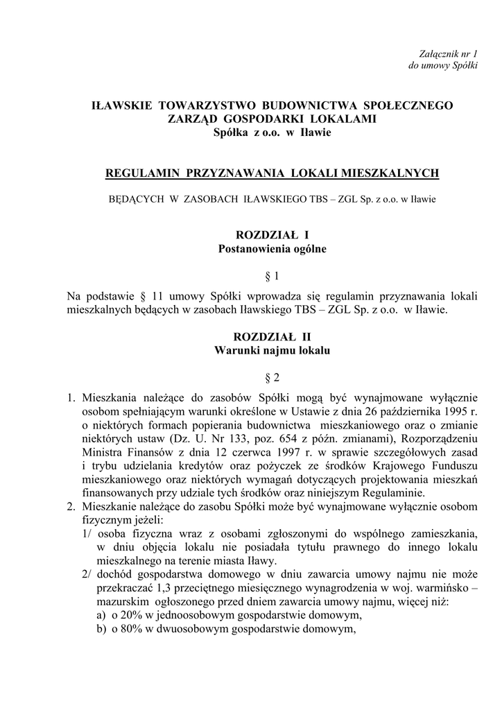 Załącznik nr 1 do umowy Spółki IŁAWSKIE TOWARZYSTWO BUDOWNICTWA SPOŁECZNEGO ZARZĄD GOSPODARKI LOKALAMI Spółka z o.o. w Iławie REGULAMIN PRZYZNAWANIA LOKALI MIESZKALNYCH BĘDĄCYCH W ZASOBACH IŁAWSKIEGO TBS – ZGL Sp. z o.o. w Iławie ROZDZIAŁ I Postanowienia ogólne §1 Na podstawie § 11 umowy Spółki wprowadza się regulamin przyznawania lokali mieszkalnych będących w zasobach Iławskiego TBS – ZGL Sp. z o.o. w Iławie. ROZDZIAŁ II Warunki najmu lokalu §2 1. Mieszkania należące do zasobów Spółki mogą być wynajmowane wyłącznie osobom spełniającym warunki określone w Ustawie z dnia 26 października 1995 r. o niektórych formach popierania budownictwa mieszkaniowego oraz o zmianie niektórych ustaw (Dz. U. Nr 133, poz. 654 z późn. zmianami), Rozporządzeniu Ministra Finansów z dnia 12 czerwca 1997 r. w sprawie szczegółowych zasad i trybu udzielania kredytów oraz pożyczek ze środków Krajowego Funduszu mieszkaniowego oraz niektórych wymagań dotyczących projektowania mieszkań finansowanych przy udziale tych środków oraz niniejszym Regulaminie. 2. Mieszkanie należące do zasobu Spółki może być wynajmowane wyłącznie osobom fizycznym jeżeli: 1/ osoba fizyczna wraz z osobami zgłoszonymi do wspólnego zamieszkania, w dniu objęcia lokalu nie posiadała tytułu prawnego do innego lokalu mieszkalnego na terenie miasta Iławy. 2/ dochód gospodarstwa domowego w dniu zawarcia umowy najmu nie może przekraczać 1,3 przeciętnego miesięcznego wynagrodzenia w woj. warmińsko – mazurskim ogłoszonego przed dniem zawarcia umowy najmu, więcej niż: a) o 20% w jednoosobowym gospodarstwie domowym, b) o 80% w dwuosobowym gospodarstwie domowym, 2 c) o dalsze 40% na każdą dodatkową osobę w gospodarstwie domowym o większej liczbie osób. 3/ Dochód gospodarstwa domowego w chwili rozpatrywania wniosku, a także w chwili zawarcia umowy najmu nie może być mniejszy niż 30% kwot z pkt. 2 ROZDZIAŁ III Zasady przyznawania lokali w najem §3 1. W przypadku spełnienia przez wszystkie osoby ubiegające się o mieszkania warunków określonych w § 2 Regulaminu pierwszeństwo do wynajmu mają osoby spełniające warunki, w następującej kolejności: a) posiadające stałą pracę na terenie miasta Iławy, b) zwalniające lokal komunalny lub miejsce na liście oczekujących na lokal komunalny, c) najemcy lokali komunalnych w budynkach przeznaczonych do rozbiórki, d) zameldowani na terenie miasta Iławy, e) mieszkający w lokalach nie spełniających warunków lokalu socjalnego przewidzianych w art. 2 Ustawy z dnia 21 czerwca 2001 r. o ochronie praw lokatorów, mieszkaniowym zasobie gminy i o zmianie Kodeksu cywilnego. ROZDZIAŁ IV Rozpatrywanie wniosków i sporządzanie list osób zakwalifikowanych do najmu w zasobach Iławskiego TBS §4 Ilość zakwalifikowanych osób do umieszczenia na liście jest uzależniona od możliwości lokalowych Iławskiego TBS. §5 1. Wnioski o wynajęcie mieszkania rozpatrywane są przez 5 osobową Komisję powołaną przez Zarząd Towarzystwa w skład, której wchodzi obligatoryjnie przedstawiciel Gminy. 2. Członkami Komisji nie mogą być osoby wchodzące w skład Rady Nadzorczej Spółki. 3. Komisja sporządza listę osób zakwalifikowanych do najmu mieszkań. §6 1. Listę osób zakwalifikowanych do najmu mieszkania podaje się do publicznej wiadomości przez wywieszenie na tablicy ogłoszeń w lokalu Spółki, na okres jednego miesiąca, wraz z pouczeniem o trybie zgłaszania i rozpatrywania odwołań od tej listy. 3 2. Ubiegający się o mieszkanie w zasobach Spółki mogą składać odwołania w ciągu miesiąca od daty wywieszenia listy do Rady Nadzorczej Spółki. Decyzje Rady Nadzorczej dotyczące odwołań są ostateczne. Po rozpatrzeniu odwołań ostateczną listę osób zakwalifikowanych do najmu w zasobach Iławskiego TBS wywiesza się na tablicy ogłoszeń w siedzibie Spółki. 3. Umieszczenie na liście nie rodzi zobowiązań Zarządu Spółki do zawarcia umowy najmu lokalu w przypadkach: a) niespełnienia kryteriów z § 2 w momencie zawierania umowy, b) zmniejszenia zasobu mieszkaniowego Iławskiego TBS o którym mowa w § 4, c) zmiany aktów prawnych regulujących działalność TBS. ROZDZIAŁ V Zasady zasiedlania mieszkań §7 1. Zarząd Spółki dokonuje wynajmu mieszkań osobom umieszczonym na liście ostatecznej po wtórnym sprawdzeniu kryteriów z § 2. 2. Przy ustaleniu propozycji mieszkań osobom umieszczonym na listach ostatecznych Zarząd Spółki uwzględnia – w miarę możliwości – potrzeby zgłoszone przez te osoby dotyczące lokalizacji, kondygnacji oraz innych cech mieszkania. 3. Osoba umieszczona na liście może zrezygnować z proponowanego mieszkania, jeżeli nie odpowiada jej wielkość mieszkania i jego kondygnacja. Spółka obowiązana jest – w miarę możliwości – uwzględnić wniosek w pierwszej kolejności, jeżeli osoba ta złożyła ponowny wniosek i zechce czekać na obraną lokalizację. §8 Osoba umieszczona na liście uprawiona jest do otrzymania mieszkania o powierzchni odpowiadającej potrzebom tej osoby, jej rodziny oraz innych osób pozostających z osobą umieszczoną na liście we wspólnym gospodarstwie domowym w chwili wynajmu mieszkania. §9 Podpisanie umowy najmu i wydanie kluczy do mieszkania, Spółka uzależnia od spełnienia, w terminie określonym przez Zarząd, wymaganych warunków finansowych oraz rozliczenia się przyszłego najemcy i osób wspólnie zamieszkujących z zajmowanych dotychczas mieszkań. Rozliczenie polega na zrzeczeniu się prawa do dotychczas zajmowanego lokalu oraz jego zwolnienie w terminie 30 dni od otrzymania kluczy do lokalu. § 10 1. Najemca powinien objąć wynajęte mieszkanie przed upływem 30 dni, licząc od daty oddania mieszkania do jego dyspozycji. 2. Przez objęcie mieszkania należy rozumieć: a) zameldowanie na pobyt stały wszystkich osób wyszczególnionych w umowie, 4 b) podpisanie przez najemcę protokołu zdawc