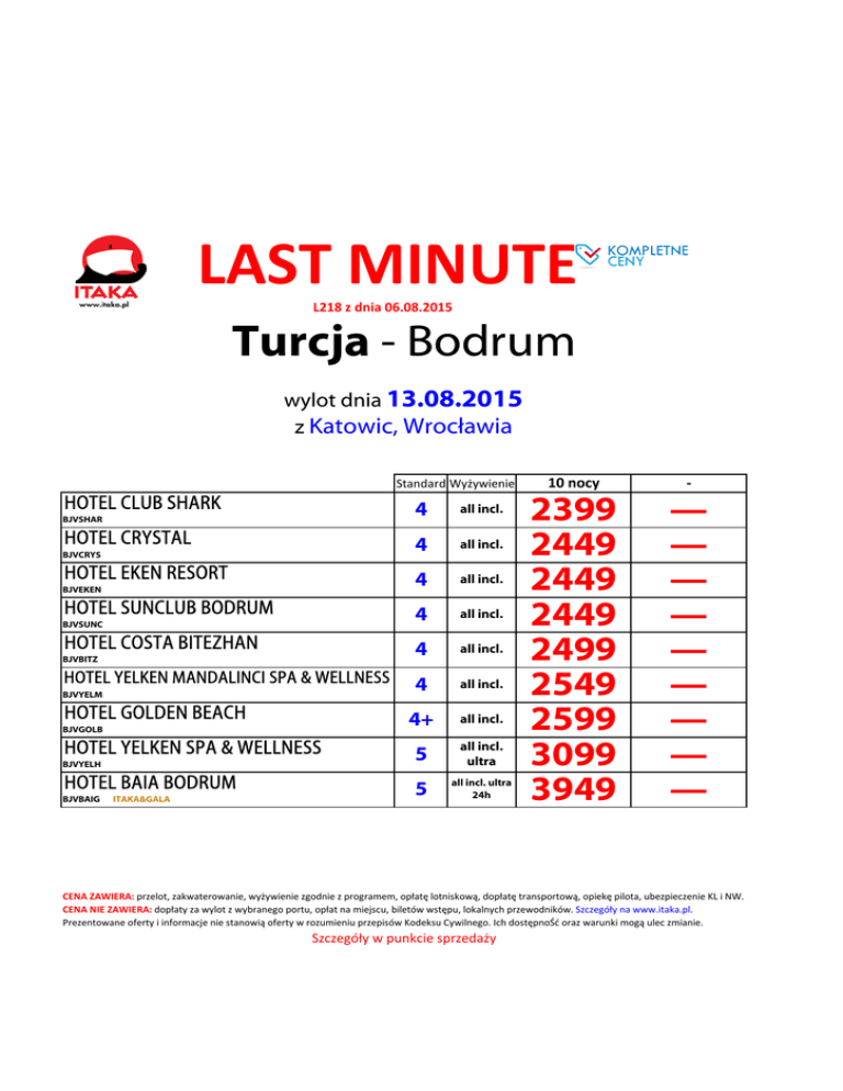 LAST MINUTE L218 z dnia 06.08.2015 Turcja - Bodrum wylot dnia 13.08.2015 z Katowic, Wrocławia Standard Wyżywienie HOTEL CLUB SHARK BJVSHAR HOTEL CRYSTAL BJVCRYS HOTEL EKEN RESORT BJVEKEN HOTEL SUNCLUB BODRUM BJVSUNC HOTEL COSTA BITEZHAN BJVBITZ HOTEL YELKEN MANDALINCI SPA & WELLNESS BJVYELM HOTEL GOLDEN BEACH BJVGOLB HOTEL YELKEN SPA & WELLNESS BJVYELH HOTEL BAIA BODRUM BJVBAIG ITAKA&GALA 4 all incl. 4 all incl. 4 all incl. 4 all incl. 4 all incl. 4 all incl. 4+ all incl. 5 all incl. ultra 5 all incl. ultra 24h 10 nocy - 2399 2449 2449 2449 2499 2549 2599 3099 3949 — — — — — — — — — CENA ZAWIERA: przelot, zakwaterowanie, wyżywienie zgodnie z programem, opłatę lotniskową, dopłatę transportową, opiekę pilota, ubezpieczenie KL i NW. CENA NIE ZAWIERA: dopłaty za wylot z wybranego portu, opłat na miejscu, biletów wstępu, lokalnych przewodników. Szczegóły na www.itaka.pl. Prezentowane oferty i informacje nie stanowią oferty w rozumieniu przepisów Kodeksu Cywilnego. Ich dostępnoŚć oraz warunki mogą ulec zmianie. Szczegóły w punkcie sprzedaży LAST MINUTE L218 z dnia 06.08.2015 Turcja - Bodrum wylot dnia 13.08.2015 z Gdańska, Krakowa, Katowic, Poznania, Warszawy, Wrocławia Standard Wyżywienie HOTEL CLUB SHARK BJVSHAR HOTEL CRYSTAL BJVCRYS HOTEL EKEN RESORT BJVEKEN HOTEL SUNCLUB BODRUM BJVSUNC HOTEL COSTA BITEZHAN BJVBITZ HOTEL YELKEN MANDALINCI SPA & WELLNESS BJVYELM HOTEL GOLDEN BEACH BJVGOLB HOTEL MIO BIANCO BJVMIOB HOTEL DRAGUT POINT SOUTH BJVPOIN HOTEL MANDARIN RESORT BJVMAND 4 all incl. 4 all incl. 4 all incl. 4 all incl. 4 all incl. 4 all incl. 4+ all incl. 4+ all incl. 4+ all incl. 5 all incl. 1 tydz. 2 tyg. 1999 1999 1999 1999 1999 2099 2099 2099 2099 2299 2949 2999 2999 2999 — 3249 3299 3299 3299 3599 CENA ZAWIERA: przelot, zakwaterowanie, wyżywienie zgodnie z programem, opłatę lotniskową, dopłatę transportową, opiekę pilota, ubezpieczenie KL i NW. CENA NIE ZAWIERA: dopłaty za wylot z wybranego portu, opłat na miejscu, biletów wstępu, lokalnych przewodników. Szczegóły na www.itaka.pl. Prezentowane oferty i informacje nie stanowią oferty w rozumieniu przepisów Kodeksu Cywilnego. Ich dostępnoŚć oraz warunki mogą ulec zmianie. Szczegóły w punkcie sprzedaży LAST MINUTE L218 z dnia 06.08.2015 Turcja - Bodrum wylot dnia 13.08.2015 z Gdańska, Krakowa, Katowic, Poznania, Warszawy, Wrocławia HOTEL YELKEN SPA & WELLNESS BJVYELH HOTEL ARMONIA HOLIDAY VILLAGE BJVARMO HOTEL BAIA BODRUM BJVBAIG ITAKA&GALA Standard Wyżywienie all incl. ultra 5 5 all incl. 24h 5 all incl. ultra 24h 1 tydz. 2 tyg. 2399 4049 2599 4299 2999 5199 CENA ZAWIERA: przelot, zakwaterowanie, wyżywienie zgodnie z programem, opłatę lotniskową, dopłatę transportową, opiekę pilota, ubezpieczenie KL i NW. CENA NIE ZAWIERA: dopłaty za wylot z wybranego portu, opłat na miejscu, biletów wstępu, lokalnych przewodników. Szczegóły na www.itaka.pl. Prezentowane oferty i informacje nie stanowią oferty w rozumieniu przepisów Kodeksu Cywilnego. Ich dostępnoŚć oraz warunki mogą ulec zmianie. Szczegóły w punkcie sprzedaży LAST MINUTE L218 z dnia 06.08.2015 Turcja - Didyma wylot dnia 13.08.2015 z Gdańska, Krakowa, Katowic, Poznania, Warszawy, Wrocławia Standard Wyżywienie HOTEL GARDEN OF SUN SPA & WELLNESS BJVGARD HOTEL BUYUK ANADOLU DIDIM RESORT BJVBUYU 5 all incl. 5 all incl. 1 tydz. 2 tyg. 2299 3599 2349 3699 CENA ZAWIERA: przelot, zakwaterowanie, wyżywienie zgodnie z programem, opłatę lotniskową, dopłatę transportową, opiekę pilota, ubezpieczenie KL i NW. CENA NIE ZAWIERA: dopłaty za wylot z wybranego portu, opłat na miejscu, biletów wstępu, lokalnych przewodników. Szczegóły na www.itaka.pl. Prezentowane oferty i informacje nie stanowią oferty w rozumieniu przepisów Kodeksu Cywilnego. Ich dostępnoŚć oraz warunki mogą ulec zmianie. Szczegóły w punkcie sprzedaży
