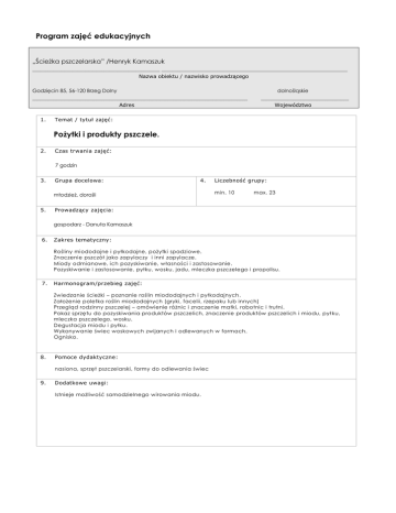 Program zajęć edukacyjnych „Ścieżka pszczelarska” /Henryk Kamaszuk ________________________________________________ ______________________________________________________________________ Nazwa obiektu / nazwisko prowadzącego Godzięcin 85, 56-120 Brzeg Dolny _________________________________________________________________________________ Adres 1. dolnośląskie _________________________________ Województwo Temat / tytuł zajęć: Pożytki i produkty pszczele. 2. Czas trwania zajęć: 7 godzin 3. Grupa docelowa: 4. młodzież, dorośli 5. Liczebność grupy: min. 10 max. 23 Prowadzący zajęcia: gospodarz - Danuta Kamaszuk 6. Zakres tematyczny: Rośliny miododajne i pyłkodajne, pożytki spadziowe. Znaczenie pszczół jako zapylaczy i inni zapylacze. Miody odmianowe, ich pozyskiwanie, własności i zastosowanie. Pozyskiwanie i zastosowanie, pyłku, wosku, jadu, mleczka pszczelego i propolisu. 7. Harmonogram/przebieg zajęć: Zwiedzanie ścieżki – poznanie roślin miododajnych i pyłkodajnych. Założenie poletka roślin miododajnych (gryki, facelii, rzepaku lub innych) Przegląd rodzinny pszczelej – omówienie różnic i znaczenie matki, robotnic i trutni. Pokaz sprzętu do pozyskiwania produktów pszczelich, znaczenie produktów pszczelich i miodu, pył ku, mleczka pszczelego, wosku. Degustacja miodu i pyłku. Wykonywanie świec woskowych zwijanych i odlewanych w formach. Ognisko. 8. Pomoce dydaktyczne: nasiona, sprzęt pszczelarski, formy do odlewania świec 9. Dodatkowe uwagi: Istnieje możliwość samodzielnego wirowania miodu.