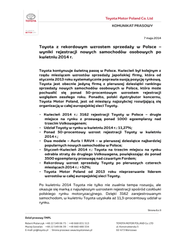 7 maja 2014 Toyota z rekordowym wzrostem sprzedaży w Polsce – wyniki rejestracji nowych samochodów osobowych po kwietniu 2014 r. Toyota kontynuuje świetną passę w Polsce. Kwiecień był kolejnym z rzędu miesiącem wzrostów sprzedaży japońskiej firmy, która od stycznia 2013 roku systematycznie poprawia swoją pozycję rynkową. Toyota jest obecnie jedyną firmą z pierwszej dziesiątki rankingu sprzedaży nowych samochodów osobowych w Polsce, która może pochwalić się ponad 50-procentowym wzrostem rejestracji względem zeszłego roku. Ponadto, polski dystrybutor koncernu, Toyota Motor Poland, jest od miesięcy najszybciej rozwijającą się organizacją w całej europejskiej sieci Toyoty. • Kwiecień 2014 r.: 3162 rejestracji Toyoty w Polsce – drugie miejsce na rynku z przewagą ponad 1000 egzemplarzy nad trzecim Volkswagenem; • Udział Toyoty w rynku w kwietniu 2014 r.: 11,27%; • Ponad 50-procentowy wzrost rejestracji Toyoty w kwietniu 2014 r.; • Dwa modele – Auris i RAV4 – w pierwszej dziesiątce najbardziej popularnych nowych samochodów w Polsce; • Styczeń-Kwiecień 2014 r.: Toyota na trzecim miejscu na rynku odrabia straty do drugiego Volkswagena, powiększając do ponad 3500 egzemplarzy przewagę nad czwartym Fordem; • Rekordowy wzrost sprzedaży Toyoty po pierwszych czterech miesiącach 2014 r.: +52%; • Toyota Motor Poland od 2013 roku nieprzerwanie liderem wzrostów w całej europejskiej sieci Toyoty. Po kwietniu 2014 Toyota nie tylko nie zwalnia tempa rozwoju, ale okazuje się marką z największym wzrostem rejestracji spośród czołówki polskiego rynku motoryzacyjnego. Dzięki 3162 zarejestrowanym samochodom, w kwietniu Toyota uzyskała aż 11,3-procentowy udział w rynku. Strona 1 z 3 - Jesteśmy obecnie jedyną liczącą się firmą w Polsce, która po zakończeniu okna kratkowego w marcu, jest w stanie utrzymywać rejestracje nowych samochodów na tak wysokim poziomie i przy tak wielkich – ponad 50-procentowych – wzrostach – powiedział Jacek Pawlak, Prezes Toyota Motor Poland. W kwietniu dwa modele Toyoty znalazły się w pierwszej dziesiątce najczęściej wybieranych nowych pojazdów. Kompaktowy Auris z liczbą 915 zarejestrowanych egzemplarzy był drugim najczęściej wybieranym pojazdem w Polsce, ze stratą zaledwie jednego egzemplarza do miejsca pierwszego. Ikona SUV-ów, model RAV4, znalazł się na 8. miejscu w kwietniu (626 zarejestrowanych sztuk), będąc tym samym najlepiej sprzedającym się SUV-em w Polsce. Po czterech miesiącach 2014 roku Toyota wypracowała ponad 3,5tysięczną przewagę nad czwartym na rynku Fordem, oraz atakuje pozycję drugiego Volkswagena, do którego po kwietniu traci zaledwie 612 egzemplarzy. - W całym 2014 roku Toyota ma rekordowy dla czołówki rynku wzrost – aż 52%. Po kwietniu jest jasne, że rosnąca popularność Toyoty wynika przede wszystkim z uznania klientów dla naszych nowych modeli, co jest długotrwałym trendem. Coraz szersza grupa decyduje się również na zakup hybrydowych Toyot. To u nas sprawdzona i rozwijana już od ponad 17 lat technologia. Dziś obecna także pod maskami popularnych Yarisów i Aurisów. Jeszcze 3 lata temu sprzedawaliśmy rocznie zaledwie około 200 hybryd. Rok 2013 zakończyliśmy wynikiem sprzedaży ponad 2000 tych aut (głównie Aurisów i Yarisów). W 2014 roku przekroczymy kolejny próg – 3000 sprzedanych hybryd – kontynuuje Jacek Pawlak. W okresie styczeń-kwiecień 2014 roku dwa modele Toyoty znalazły się w pierwszej dziesiątce najlepiej sprzedających się samochodów: Auris (3808 egzemplarzy), oraz Yaris (2581 egzemplarzy). Kolejną Toyotą w rankingu popularności jest Avensis, który odnotowuje 47-procentowy wzrost rejestracji względem zeszłego roku. - W 2013 roku wprowadziliśmy na rynek nowe wersje bardzo ważnych dla Toyoty i rynku modeli. Pojawił się zupełnie nowy Auris, także w Strona 2 z 3 wersji kombi i z pełnym napędem hybrydowym, nowa generacja światowego bestsellera Corolli, czy czwarta odsłona pioniera SUV-ów, modelu RAV4. Wszystkie nowe Toyoty mają to, z czego słynie nasza marka, czyli legendarną jakość i niezawodność, a teraz wyróżniają się także zupełnie nowym, bardzo atrakcyjnym stylem. Dzięki temu stały się tak pożądane przez Polaków – wyjaśnia źródła sukcesu marki Jacek Pawlak. Dzięki temu Toyota Motor Poland jest od miesięcy najszybciej rozwijającym się przedstawicielstwem krajowym w całej europejskiej sieci Toyoty. 2013 rok polski oddział koncernu zakończył z największym wzrostem sprzedaży w Europie. Doskonałe wyniki po pierwszych czterech miesiącach 2014 roku pozwalają Toyocie Motor Poland utrzymywać pozycję europejskiego lidera wzrostów. W kolejnych miesiącach Toyota nie zwolni tempa. Po ofensywie kompaktowej z 2013 roku, w 2014 roku przyjdzie czas na nowe modele w segmencie A i B. Już w czerwcu na rynku zadebiutuje zupełnie nowe AYGO, które wyznacza standardy stylu samochodu miejskiego, a w sierpniu gruntownie zmodernizowany hit segmentu B – Yaris. Strona 3 z 3