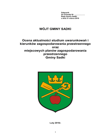 Załącznik do Uchwały Nr ……………… Rady Gminy Sadki z dnia 31 marca 2016 WÓJT GMINY SADKI Ocena aktualności studium uwarunkowań i kierunków zagospodarowania przestrzennego oraz miejscowych planów zagospodarowania przestrzennego Gminy Sadki Luty 2016r. 1 I WPROWADZENIE 1. Podstawa prawna opracowania 2. Cel opracowania 3. Metoda opracowania II OCENA AKTUALNOŚCI OBOWIĄZUJĄCEGO STUDIUM UWARUNKOWAŃ I KIERUNKÓW ZAGOSPODAROWANIA PRZESTRZENNEGO 1. Ogólna ocena zgodności studium z przepisami ustawy o planowaniu i zagospodarowaniu przestrzennym 2. Ocena zgodności studium z przepisami odrębnymi 3. Ocena aktualności studium w zakresie zmian w zagospodarowaniu przestrzennym gminy oraz w oparciu o wnioski złożone do studium III OCENA AKTUALNOŚCI OBOWIĄZUJĄCYCH MIEJSCOWYCH PLANÓW ZAGOSPODAROWANIA PRZESTRZENNEGO 1. Status prawny planu miejscowego 2. Skutki prawne uchwalenia planu miejscowego oraz korzyści płynące z posiadania planów miejscowych. 3. Procedura sporządzania planu miejscowego 4. Ocena aktualności obowiązujących planów miejscowych IV WNIOSKI V WIELOLETNI PROGRAM SPORZĄDZANIA PLANÓW MIEJSCOWYCH VI ZAŁĄCZNIK GRAFICZNY DO OCENY AKTUALNOŚCI 2 I WPROWADZENIE 1. Podstawa prawna opracowania Art. 32 ust. 1 ustawy z dnia 27 marca 2003 r. o planowaniu i zagospodarowaniu przestrzennym stwierdza, że „W celu oceny aktualności studium i planów miejscowych wójt, burmistrz albo prezydent miasta dokonuje analizy zmian w zagospodarowaniu przestrzennym gminy, ocenia postępy w opracowywaniu planów miejscowych i opracowuje wieloletnie programy ich sporządzania w nawiązaniu do ustaleń studium, z uwzględnieniem decyzji zamieszczonych w rejestrach, o których mowa w art. 57 ust. 1-3 i w art. 67, oraz wniosków w sprawie sporządzenia lub zmiany planu miejscowego.” W związku z powyższym dokonano analizy zachodzących zmian w zagospodarowaniu przestrzennym gminy oraz przedkłada się Radzie Gminy Sadki wyniki analiz, po uzyskaniu opinii gminnej komisji urbanistyczno – architektonicznej w celu podjęcia przez Radę Gminy Sadki uchwały w sprawie aktualności studium uwarunkowań i kierunków zagospodarowania przestrzennego oraz obowiązujących planów miejscowych. Konieczność sporządzenia analizy wynika nie tylko z przepisów prawa, ale przede wszystkim z potrzeby uzyskania aktualnej wiedzy na temat stanu zagospodarowania przestrzennego. Dokonanie analizy daje możliwość spojrzenia na zmiany jakie zaszły w przestrzeni w ostatnim czasie oraz na aktualność zapisów obowiązujących aktów planistycznych funkcjonujących zarówno jako wytyczne do prawa miejscowego jak i prawo miejscowe . 2. Cel opracowania Celem opracowania analizy zmian w zagospodarowaniu przestrzennym jest wskazanie zmian, jakie zaszły w przestrzeni gminy oraz ocena dokumentów planistycznych ze względu na ich przydatność w realizacji celu, jakim jest kształtowanie ładu przestrzennego. 3. Metoda opracowania Przyjęta metoda analizy polega na dokonaniu oceny aktualnego stanu zagospodarowania przestrzennego gminy oraz oczekiwanych przez mieszkańców gminy procesów zmiany zagospodarowania. Zachodzące procesy przeanalizowano w oparciu o wnioski oraz uwagi złożone do uchwalonego w ostatnim czasie studium uwarunkowań i kierunków zagospodarowania przestrzennego. Zidentyfikowano obszary o największym ruchu inwestycyjnym, wymagające szczególnego monitorowania i aktualizowania planów miejscowych. Podjęto próbę spojrzenia w nakreślone w Studium kierunki zagospodarowania przestrzennego gminy w kontekście zaistniałych nowych uwarunkowań oraz w kontekście złożonych wniosków w sprawie zmiany studium i miejscowego planu. Przeanalizowano również zgodność planów miejscowych z wymaganiami określonymi w obowiązujących przepisach. W oparciu o w/w analizy dokonano oceny aktualności planów miejscowych oraz określono obszary 3 wymagające działań planistycznych i zaproponowano wieloletni harmonogram takich prac. II OCENA AKTUALNOŚCI OBOWIĄZUJĄCEGO STUDIUM UWARUNKOWAŃ I KIERUNKÓW ZAGOSPODAROWANIA PRZESTRZENNEGO 1. Ogólna ocena zgodności studium z przepisami ustawy o planowaniu i zagospodarowaniu przestrzennym. Aktualnie obowiązujące Studium uwarunkowań i kierunków zagospodarowania przestrzennego gminy Sadki zostało sporządzone w trybie ustawy z dnia 27 marca 2003 r. o planowaniu i zagospodarowaniu przestrzennym (Dz. U. z 2015r. poz. 199 z późn. zm.) oraz przyjęte uchwałą Rady Gminy Sadki nr X/56/2015 z dnia 3 września 2015r. W pierwszej kolejności przeprowadzono analizę zgodności studium z przepisami ustawy z dnia 23 marca 2003 r. o planowaniu i zagospodarowaniu przestrzennym (Dz. U. z 2015 r. poz. 199 z późn. zm.), w szczególności z art. 10 ust. 1 i 2 ustawy oraz Rozporządzeniem Ministra Infrastruktury z dnia 28 kwietnia 2004 r. w sprawie zakresu projektu studium uwarunkowań i kierunków zagospodarowania przestrzennego gminy (Dz. U. 2004 Nr 118 poz. 1233). Część tekstowa Studium uwarunkowań i kierunków zagospodarowania przestrzennego gminy Sadki, pomimo aktualności w zakresie wyznaczenia terenów inwestycyjnych, nie wypełnia całej treści aktualnie obowiązującego art. 10 ust. 1 ustawy o planowaniu i zagospodarowaniu przestrzennym. Dnia 18 listopada 2015r. weszła w życie Ustawy o rewitalizacji z dnia 9 października 2015, która nie zawiera zapisów o uwzględnieniu terminów przejściowych, więc od dnia wejścia w życie Ustawy o rewitalizacji, w tym zmian wprowadzonych tą ustawą do Ustawy o planowaniu i zagospodarowaniu przestrzennym, wszystkie w przyszłości sporządzane opracowania planistyczne będą musiały być dostosowane do zmienionych zapisów ustawy. W zakresie Studium Gminy Sadki należy przy ewentualnie dokonywanej zmianie studium przeprowadzić pełną analizę: ekonomiczne, środowiskowe i społeczne jak również prognozy demograficzne, w tym uwzględniające, tam gdzie to uzasadnione, migracje w ramach m