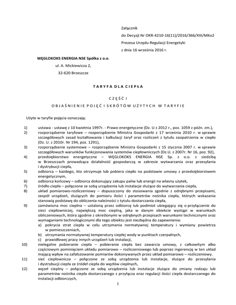 Załącznik do Decyzji Nr OKR-4210-16(11)/2016/366/XIII/MKo2 Prezesa Urzędu Regulacji Energetyki z dnia 16 września 2016 r. WĘGLOKOKS ENERGIA NSE Spółka z o.o. ul. A. Mickiewicza 2, 32-620 Brzeszcze TARYFA DLA CIEPŁA CZĘŚĆ I OBJAŚNIENIE POJĘĆ I SKRÓTÓW UŻYTYCH W TARYFIE Użyte w taryfie pojęcia oznaczają: 1) 2) 3) 4) 5) 6) 7) 8) 9) 10) 11) 12) ustawa - ustawę z 10 kwietnia 1997r. - Prawo energetyczne (Dz. U z 2012 r., poz. 1059 z późn. zm.), rozporządzenie taryfowe – rozporządzenie Ministra Gospodarki z 17 września 2010 r. w sprawie szczegółowych zasad kształtowania i kalkulacji taryf oraz rozliczeń z tytułu zaopatrzenia w ciepło (Dz. U. z 2010r. Nr 194, poz. 1291), rozporządzenie systemowe – rozporządzenie Ministra Gospodarki z 15 stycznia 2007 r. w sprawie szczegółowych warunków funkcjonowania systemów ciepłowniczych (Dz.U. z 2007r. Nr 16, poz. 92), przedsiębiorstwo energetyczne – WĘGLOKOKS ENERGIA NSE Sp. z o.o. z siedzibą w Brzeszczach prowadząca działalność gospodarczą w zakresie wytwarzania oraz przesyłania i dystrybucji ciepła, odbiorca – każdego, kto otrzymuje lub pobiera ciepło na podstawie umowy z przedsiębiorstwem energetycznym, odbiorca końcowy – odbiorca dokonujący zakupu paliw lub energii na własny użytek, źródło ciepła – połączone ze sobą urządzenia lub instalacje służące do wytwarzania ciepła, układ pomiarowo-rozliczeniowy – dopuszczony do stosowania zgodnie z odrębnymi przepisami, zespół urządzeń, służących do pomiaru ilości i parametrów nośnika ciepła, których wskazania stanowią podstawę do obliczenia należności z tytułu dostarczania ciepła, zamówiona moc cieplna – ustaloną przez odbiorcę lub podmiot ubiegający się o przyłączenie do sieci ciepłowniczej, największą moc cieplną, jaka w danym obiekcie wystąpi w warunkach obliczeniowych, która zgodnie z określonymi w odrębnych przepisach warunkami technicznymi oraz wymaganiami technologicznymi dla tego obiektu jest niezbędna do zapewnienia: a) pokrycia strat ciepła w celu utrzymania normatywnej temperatury i wymiany powietrza w pomieszczeniach, b) utrzymania normatywnej temperatury ciepłej wody w punktach czerpalnych, c) prawidłowej pracy innych urządzeń lub instalacji, nielegalne pobieranie ciepła – pobieranie ciepła bez zawarcia umowy, z całkowitym albo częściowym pominięciem układu pomiarowo – rozliczeniowego lub poprzez ingerencję w ten układ mającą wpływ na zafałszowanie pomiarów dokonywanych przez układ pomiarowo – rozliczeniowy. sieć ciepłownicza – połączone ze sobą urządzenia lub instalacje, służące do przesyłania i dystrybucji ciepła ze źródeł ciepła do węzłów cieplnych, węzeł cieplny – połączone ze sobą urządzenia lub instalacje służące do zmiany rodzaju lub parametrów nośnika ciepła dostarczanego z przyłącza oraz regulacji ilości ciepła dostarczanego do instalacji odbiorczych, 1 13) 14) grupowy węzeł cieplny – węzeł cieplny obsługujący więcej niż jeden obiekt, instalacja odbiorcza – połączone ze sobą urządzenia lub instalacje, służące do transportowania ciepła lub ciepłej wody z węzłów cieplnych lub źródeł ciepła do odbiorników ciepła lub punktów poboru ciepłej wody w obiekcie, zewnętrzna instalacja odbiorcza – odcinki instalacji odbiorczych łączące grupowy węzeł cieplny lub źródło ciepła z instalacjami odbiorczymi w obiektach, w tym w obiektach, w których zainstalowany jest grupowy węzeł cieplny lub źródło ciepła, obiekt – budowla lub budynek wraz z instalacjami odbiorczymi, taryfa – zbiór cen i stawek opłat oraz warunków ich stosowania, opracowany przez przedsiębiorstwo energetyczne i wprowadzany jako obowiązujący dla określonych w nim odbiorców w trybie określonym ustawą, grupa taryfowa – grupa odbiorców korzystających z usług związanych z zaopatrzeniem w ciepło, z którymi rozliczenia są prowadzone na podstawie tych samych cen i stawek opłat oraz warunków ich stosowania. 15) 16) 17) 18) C Z Ę Ś Ć II ZAKRES DZIAŁALNOŚCI GOSPODARCZEJ ZWIĄZANEJ Z ZAOPATRZENIEM W CIEPŁO Przedsiębiorstwo energetyczne prowadzi działalność gospodarczą zgodnie z udzielonymi koncesjami: - w zakresie wytwarzania ciepła nr WCC/387/366/U/OT-2/98/BM z dnia 30.10.1998r.(z późn. zm.), - w zakresie przesyłania i dystrybucji ciepła nr PCC/407/366/U/OT-2/98/BM z dnia 30.10.1998r. (z późn. zm.). C Z Ę Ś Ć III PODZIAŁ ODBIORCÓW NA GRUPY TARYFOWE Podziału odbiorców na grupy taryfowe dokonano zgodnie z § 10 rozporządzenia taryfowego. OBJAŚNIENIE SYMBOLIKI GRUP TARYFOWYCH: pozycja pierwsza symbolu – skrót nazwy kotłowni: B Kotłownia zlokalizowana na terenie KWK „Brzeszcze” w Brzeszczach ZG Kotłownia zlokalizowana na terenie KWK „Ziemowit ” w Lędzinach C Kotłownia zlokalizowana na terenie KWK „Piast” Ruch II w Woli J Kotłownia zlokalizowana na terenie Zakładu Górniczego „Janina” w Libiążu TAURON Wydobycie S.A. P Kotłownia zlokalizowana na terenie KWK „Piast” w Bieruniu 2 pozycja druga symbolu – rodzaj nośnika ciepła: W Nośnik ciepła gorąca woda pozycja trzecia symbolu – oznaczenie cyfrowe: nr sieci ciepłowniczej zgodny z koncesją w zakresie przesyłania i dystrybucji ciepła pozycja czwarta symbolu – wskazanie miejsca dostarczania: Wi Odbiorcy pobierający ciepło z węzła cieplnego Wg Odbiorcy pobierający ciepło z grupowego węzła cieplnego Io Odbiorcy pobierający ciepło z zewnętrznej instalacji odbiorczej pozycja piąta symbolu – określenie własności majątku ciepłowniczego: w Węzeł cieplny, zewnętrzna instalacja odbiorcza stanowi własność przedsiębiorstwa energetycznego WYKAZ GRUP TARYFOWYCH: 1. Symbol grupy taryfowej BW1 2. B W 1 Wi w 3. B W 1 Wg Io w 4. ZG W 3 5. ZG W 3 Wi w 6. ZG W 3 Wg Io w Lp. Charakterystyka odbiorcy Odbiorca pobierający ciepło wytworzone w źródle ciepła, stanowiącym włas