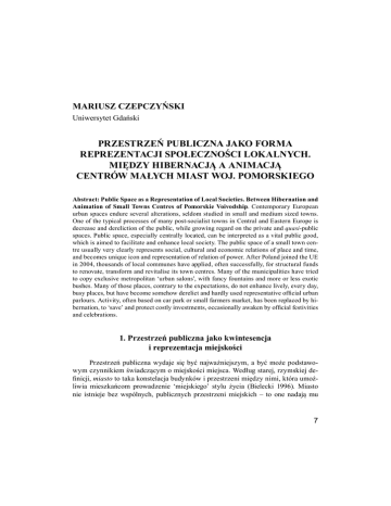 MARIUSZ CZEPCZYŃSKI Uniwersytet Gdański PRZESTRZEŃ PUBLICZNA JAKO FORMA REPREZENTACJI SPOŁECZNOŚCI LOKALNYCH. MIĘDZY HIBERNACJĄ A ANIMACJĄ CENTRÓW MAŁYCH MIAST WOJ. POMORSKIEGO Abstract: Public Space as a Representation of Local Societies. Between Hibernation and Animation of Small Towns Centres of Pomorskie Voivodship. Contemporary European urban spaces endure several alterations, seldom studied in small and medium sized towns. One of the typical processes of many post-socialist towns in Central and Eastern Europe is decrease and dereliction of the public, while growing regard on the private and quasi-public spaces. Public space, especially centrally located, can be interpreted as a vital public good, which is aimed to facilitate and enhance local society. The public space of a small town centre usually very clearly represents social, cultural and economic relations of place and time, and becomes unique icon and representation of relation of power. After Poland joined the UE in 2004, thousands of local communes have applied, often successfully, for structural funds to renovate, transform and revitalise its town centres. Many of the municipalities have tried to copy exclusive metropolitan ‘urban salons’, with fancy fountains and more or less exotic bushes. Many of those places, contrary to the expectations, do not enhance lively, every day, busy places, but have become somehow derelict and hardly used representative official urban parlours. Activity, often based on car park or small farmers market, has been replaced by hibernation, to ‘save’ and protect costly investments, occasionally awaken by official festivities and celebrations. 1. Przestrzeń publiczna jako kwintesencja i reprezentacja miejskości Przestrzeń publiczna wydaje się być najważniejszym, a być może podstawowym czynnikiem świadczącym o miejskości miejsca. Według starej, rzymskiej definicji, miasto to taka konstelacja budynków i przestrzeni między nimi, która umożliwia mieszkańcom prowadzenie ‘miejskiego’ stylu życia (Bielecki 1996). Miasto nie istnieje bez wspólnych, publicznych przestrzeni miejskich – to one nadają mu 7 charakter, to tam doświadczamy ‘miejskości’, to tam spotykamy ‘obcego’ i negocjujemy relacje społeczne i kulturowe, to tam zachodzą podstawowe interakcje społeczne i par excellance miastotwórcze. Teren bez używanych, wielopoziomowych, aktywnych przestrzeni publicznych pozostaje co najwyżej osiedlem, może osadą. Miasto i jego przestrzeń mogą być zatem rozpatrywane jako styl życia, a także określona, społeczna i interakcyjna wizja rozwoju. Przestrzeń ta tworzona jest przez różnych aktorów przestrzeni publicznej, z których do najważniejszych można zaliczyć polityków czy decydentów, którzy podejmują decyzje kierunkowe i ogólne; architektów i planistów, często roszczących sobie prawa do bycia demiurgami przestrzeni, którzy nadają kształt przestrzeni oraz mieszkańcy miasta, przyjezdni, turyści, jego użytkownicy, którzy tę przestrzeń zapełniają, tworzą w niej relacje oraz nieustannie interpretują i odczytują. Przestrzeń ta jest ukształtowana przez ciąg wydarzeń historycznych, przy czym współdziałanie różnych grup aktorów jest zawsze uwarunkowane przeszłością. Urbanistyka odzwierciedla wszystkie podstawowe zróżnicowania społeczności, jednocześnie struktura i funkcjonowanie społeczeństwa podlega wpływom aktualnej zabudowy miasta. Przestrzeń miejską tworzą dwa autonomiczne, ale organicznie powiązane i współdziałające na zasadzie sprzężeń zwrotnych podsystemy: urbanistyczny, złożony z materialnych, antropogenicznych i naturalnych elementów miasta, które składają się na jego strukturę przestrzenną, społeczny, będący zbiorowością użytkowników miasta, ich opinii i znaczeń, których podstawową strukturę tworzą jego mieszkańcy. Podsystem urbanistyczny zmienia się z reguły wolniej niż społeczny, ‘zostaje w tyle’, odzwierciedlając potrzeby społeczne formułowane wczoraj (Wallis 1977, s. 80). Żyjemy więc zazwyczaj we ‘wczorajszych przestrzeniach’, reprezentujących ‘wczorajsze’ potrzeby i ‘wczorajszych’ aktorów. Przestrzeń miejska, a zwłaszcza centra miast są specyficzną przestrzenią społeczną i urbanistyczną, którą można określić jako przestrzeń dialogowaną, tworzoną przez nieustanną interakcję między formami, funkcjami, ich znaczeniami oraz odbiorcami. Pozostaje ona nie tylko ‘plastycznie widoczna’ w przestrzeni, ale także ‘narracyjnie widoczna’ w czasie (Bakhin, za Folch-Serrra 1990). Przestrzeń pośredniczy, zarówno symbolicznie, jak i materialnie, między społeczno-przestrzennym zróżnicowaniem kapitału rządzącego się prawami wolnego rynku oraz społeczną homogenicznością rynku pracy (Zukin 1993). Przestrzeń miast jest szczególnego rodzaju symbolem, częścią kultury zarazem i najbardziej chyba widocznym jej transmiterem, wyrażającym hierarchie wartości, sposoby myślenia i doświadczenia dominującej grupy społecznej. Zarządzanie przestrzenią publiczną jest jednym z priorytetowych zadań decydentów lokalnych, przy czym przestrzenie centralne, ze względu na ich położenie i znaczenie, są często ‘oczkiem w głowie’ miejscowych włodarzy. Przestrzeń i krajobraz centrów miast reprezentują stosunki społeczne i kulturowe w danym miejscu i czasie, stając się swoistą ikoną i reprezentacją władzy. Przestrzeń miejska, jako 8 produkt wartości, znaczeń i symboli dominujących w danej grupie społecznej, odzwierciedla aspiracje władzy, jak również chwalebną i tragiczną historię, a także możliwości, marzenia, ograniczenia i obawy, oraz poziom edukacji estetycznej, wykształcenie czy szeroko rozumiane horyzonty i wzorce kulturowe zapisane w systemie symboli i znaków (Czepczyński 2008). Komunikaty kodowane w przestrzeni są zazwyczaj bardzo czytelne dla większości odbiorców, dl
