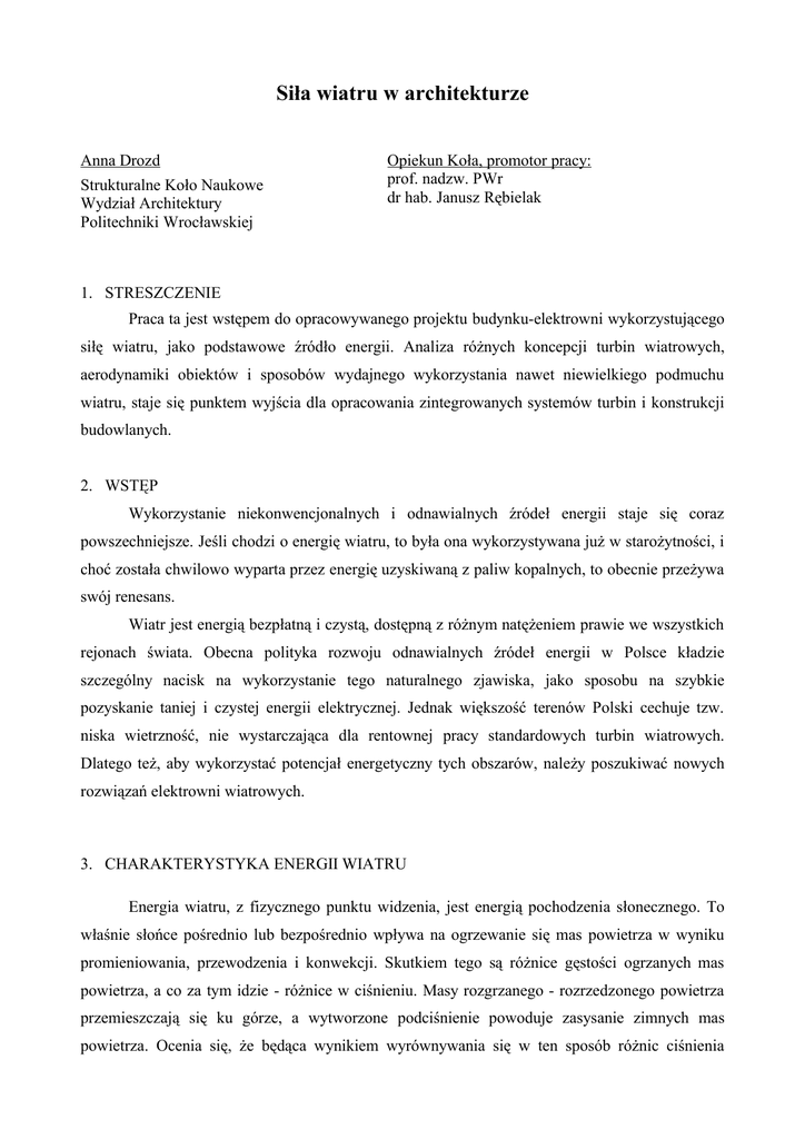 Siła wiatru w architekturze Anna Drozd Strukturalne Koło Naukowe Wydział Architektury Politechniki Wrocławskiej Opiekun Koła, promotor pracy: prof. nadzw. PWr dr hab. Janusz Rębielak 1. STRESZCZENIE Praca ta jest wstępem do opracowywanego projektu budynku-elektrowni wykorzystującego siłę wiatru, jako podstawowe źródło energii. Analiza różnych koncepcji turbin wiatrowych, aerodynamiki obiektów i sposobów wydajnego wykorzystania nawet niewielkiego podmuchu wiatru, staje się punktem wyjścia dla opracowania zintegrowanych systemów turbin i konstrukcji budowlanych. 2. WSTĘP Wykorzystanie niekonwencjonalnych i odnawialnych źródeł energii staje się coraz powszechniejsze. Jeśli chodzi o energię wiatru, to była ona wykorzystywana już w starożytności, i choć została chwilowo wyparta przez energię uzyskiwaną z paliw kopalnych, to obecnie przeżywa swój renesans. Wiatr jest energią bezpłatną i czystą, dostępną z różnym natężeniem prawie we wszystkich rejonach świata. Obecna polityka rozwoju odnawialnych źródeł energii w Polsce kładzie szczególny nacisk na wykorzystanie tego naturalnego zjawiska, jako sposobu na szybkie pozyskanie taniej i czystej energii elektrycznej. Jednak większość terenów Polski cechuje tzw. niska wietrzność, nie wystarczająca dla rentownej pracy standardowych turbin wiatrowych. Dlatego też, aby wykorzystać potencjał energetyczny tych obszarów, należy poszukiwać nowych rozwiązań elektrowni wiatrowych. 3. CHARAKTERYSTYKA ENERGII WIATRU Energia wiatru, z fizycznego punktu widzenia, jest energią pochodzenia słonecznego. To właśnie słońce pośrednio lub bezpośrednio wpływa na ogrzewanie się mas powietrza w wyniku promieniowania, przewodzenia i konwekcji. Skutkiem tego są różnice gęstości ogrzanych mas powietrza, a co za tym idzie - różnice w ciśnieniu. Masy rozgrzanego - rozrzedzonego powietrza przemieszczają się ku górze, a wytworzone podciśnienie powoduje zasysanie zimnych mas powietrza. Ocenia się, że będąca wynikiem wyrównywania się w ten sposób różnic ciśnienia atmosferycznego, energia kinetyczna wiatru to około 1÷ 2% energii promieniowania słonecznego, czyli w przeliczeniu na moc ok. 2700 TW darmowej, naturalnej i powszechnej energii. Z tego (po uwzględnieniu strat) obecne możliwości i standardy instalowania siłowni wiatrowych na powierzchni lądów, mają potencjał energetyczny o mocy 40 TW. 4. OGÓLNA SYTUACJA ENERGETYKI WIATROWEJ W POLSCE Wśród specjalistów funkcjonują dwie rozbieżne opinie dotyczące rentowności elektrowni wiatrowych lokalizowanych na terenie Polski. Pierwsza, tłumaczona jest tym, że jak dotąd wykorzystanie energii wiatru okazało się największym sukcesem w produkcji energii pochodzącej z odnawialnych źródeł. Uzyskanie w krótkim przedziale czasu bardzo dużych korzyści w tej dziedzinie było spowodowane wprowadzeniem na polski rynek już wysoko zaawansowanych technologicznie turbin. Przez co, w krótkim czasie i bez konieczności poszukiwania nowych technologii, zwiększono udział odnawialnych źródeł energii w zaspokojeniu zapotrzebowania na energię pierwotną. Opierając się na tych doświadczeniach opracowano nawet „Strategię Rozwoju Energetyki Odnawialnej w zakresie wzrostu produkcji energii elektrycznej ze źródeł odnawialnych ze szczególnym uwzględnieniem energetyki wiatrowej na lata 2003-2005”. Zawarto w niej raport wg, którego oceniono, że w perspektywie krótko i średnio okresowej, wśród wielu sposobów pozyskiwania „zielonej energii”, największe możliwości zwiększenia podaży może zapewnić energetyka wiatrowa. Druga opinia, dotycząca rentowności elektrowni wiatrowych w Polsce, podważa ich opłacalność, opierając się na analizie wietrzności. Mimo, że atlas pokazuje, iż na większości obszarów panują korzystne warunki wiatrowe, to praktycznie siła wiatru przekracza na tych terenach 4m/sek tylko sezonowo, a wartość tą uznaje się za minimum potrzebne do pracy urządzeń prądotwórczych standardowych wiatraków energetycznych. T. Kowalik twierdzi nawet, że takich obszarów jest zdecydowanie mniej, a przeważają tereny o niskiej wietrzności. Konsekwencją takich warunków wiatrowych może być dosyć niska rentowność elektrowni wiatrowych w Polsce, jak twierdzą np. specjaliści z Politechniki Szczecińskiej. Ponieważ tereny, które cechują wyższe i bardziej korzystne warunki wiatrowe, stanowią niewielką część powierzchni kraju (w większości jedynie terenu Pomorza), rola energii wiatrowej w bilansie energetycznym Polski (wg drugiej opinii) będzie w przyszłości pomijalnie mała, a obecny wzrost rentowności tej gałęzi energetyki był jedynie krótkotrwały. 5. PRZYSZŁOŚCIOWE KONCEPCJE WYKORZYSTANIA ENERGII WIATRU Fakt, iż duży potencjał wiatrowy cechuje jedynie niewielką część obszarów Polski, co znacznie ogranicza możliwości lokalizowania standardowych elektrowni wiatrowych oraz ich rentowność, nie pomyślnego rozwoju powinien przekreślać wykorzystania tego „surowca” naturalnego w Polsce. Obecnie za przyszłościowe uważa się technologie wykorzystujące siłę wiatru o prędkości niższej niż 4m/s. I choć do tej pojawiły się nieliczne opracowania na ten temat, a w porównaniu z tradycyjnymi rozwiązaniami stanowią one wciąż niewielki Rysunek 1. Strefy energetyczne wiatru w Polsce. Mapa opracowana przez prof. H. Lorenc na podstawie danych pomiarowych z lat 1971-2000. procent obecnych instalacji, to w najbliższej przyszłości, mogą stać się one prostym wydajnym i powszechnym sposobem pozyskiwania „czystej” energii. 5.1 Zastosowanie turbin wiatrowych o pionowej osi obrotu Turbiny o pionowej osi obrotu nieraz znajdują duże uznanie jako opozycja dla konstrukcji o poziomej osi obrotu. Ponieważ prace nad tego typu wiatrakami nie postępowały w takim tempie jak nad tradycyjnymi „śmigłami”, obecnie istnieją niezbyt liczne za