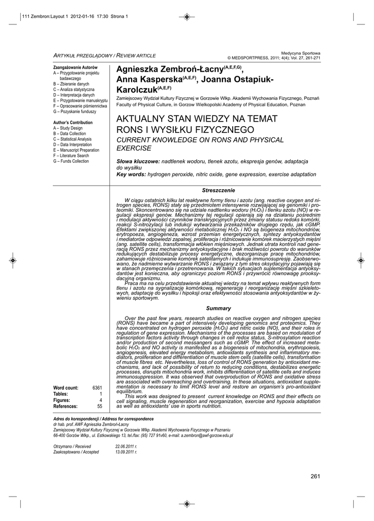 111 Zembron:Layout 1 2012-01-16 17:30 Strona 1 ARTYKUŁ PRZEGLĄDOWY / REVIEW ARTICLE Zaangażowanie Autorów A – Przygotowanie projektu badawczego B – Zbieranie danych C – Analiza statystyczna D – Interpretacja danych E – Przygotowanie manuskryptu F – Opracowanie piśmiennictwa G – Pozyskanie funduszy Author’s Contribution A – Study Design B – Data Collection C – Statistical Analysis D – Data Interpretation E – Manuscript Preparation F – Literature Search G – Funds Collection Medycyna Sportowa © MEDSPORTPRESS, 2011; 4(4); Vol. 27, 261-271 Agnieszka Zembroń-Łacny(A,E,F,G), Anna Kasperska(A,E,F), Joanna OstapiukKarolczuk(A,E,F) Zamiejscowy Wydział Kultury Fizycznej w Gorzowie Wlkp. Akademii Wychowania Fizycznego, Poznań Faculty of Physical Culture, in Gorzow Wielkopolski Academy of Physical Education, Poznan AKTUALNY STAN WIEDZY NA TEMAT RONS I WYSIŁKU FIZYCZNEGO CURRENT KNOWLEDGE ON RONS AND PHYSICAL EXERCISE Słowa kluczowe: nadtlenek wodoru, tlenek azotu, ekspresja genów, adaptacja do wysiłku Key words: hydrogen peroxide, nitric oxide, gene expression, exercise adaptation Streszczenie W ciągu ostatnich kilku lat reaktywne formy tlenu i azotu (ang. reactive oxygen and nitrogen species, RONS) stały się przedmiotem intensywnie rozwijającej się genomiki i proteomiki. Skoncentrowano się na udziale nadtlenku wodoru (H2O2) i tlenku azotu (NO) w regulacji ekspresji genów. Mechanizmy tej regulacji opierają się na działaniu pośrednim i modulacji aktywności czynników transkrypcyjnych przez zmiany statusu redoks komórki, reakcji S-nitrozylacji lub indukcji wytwarzania przekaźników drugiego rzędu, jak cGMP. Efektami zwiększonej aktywności metabolicznej H2O2 i NO są biogeneza mitochondriów, erytropoeza, angiogeneza, wzrost przemian energetycznych, syntezy antyoksydantów i mediatorów odpowiedzi zapalnej, proliferacja i różnicowanie komórek macierzystych mięśni (ang. satellite cells), transformacja włókien mięśniowych. Jednak utrata kontroli nad generacją RONS przez mechanizmy antyoksydacyjne i brak możliwości powrotu do warunków redukujących destabilizuje procesy energetyczne, dezorganizuje pracę mitochondriów, zahamowuje różnicowanie komórek satelitarnych i indukuje immunosupresję. Zaobserwowano, że nadmierne wytwarzanie RONS i związany z tym stres oksydacyjny pojawiają się w stanach przemęczenia i przetrenowania. W takich sytuacjach suplementacja antyoksydantów jest konieczna, aby ograniczyc poziom RONS i przywrócić równowagę prooksydacyjną organizmu. Praca ma na celu przedstawienie aktualnej wiedzy na temat wpływu reaktywnych form tlenu i azotu na sygnalizację komórkową, regenerację i reorganizację mięśni szkieletowych, adaptację do wysiłku i hipoksji oraz efektywności stosowania antyoksydantów w żywieniu sportowym. Summary Word count: Tables: Figures: References: 6361 1 4 55 Over the past few years, research studies on reactive oxygen and nitrogen species (RONS) have became a part of intensively developing genomics and proteomics. They have concentrated on hydrogen peroxide (H2O2) and nitric oxide (NO), and their roles in regulation of gene expression. Mechanisms of the processes are based on modulation of transcription factors activity through changes in cell redox status, S-nitrosylation reaction and/or production of second messangers such as cGMP. The effect of increased metabolic H2O2 and NO activity is manifested as a biogenesis of mitochondria, erythropoiesis, angiogenesis, elevated energy metabolism, antioxidants synthesis and inflammatory mediators, proliferation and differentiation of muscle stem cells (satellite cells), transformation of muscle fibres etc. Nevertheless, loss of control of RONS generation by antioxidant mechanisms, and lack of possibility of return to reducing conditions, destabilizes energetic processes, disrupts mitochondria work, inhibits differentiation of satellite cells and induces immunosuppression. It was observed that overproduction of RONS and oxidative stress are associated with overreaching and overtraining. In these situations, antioxidant supplementation is necessary to limit RONS level and restore an organism’s pro-antioxidant equilibrium. This work was designed to present current knowledge on RONS and their effects on cell signaling, muscle regeneration and reorganization, exercise and hypoxia adaptation as well as antioxidants’ use in sports nutrition. Adres do korespondencji / Address for correspondence dr hab. prof. AWF Agnieszka Zembroń-Łacny Zamiejscowy Wydział Kultury Fizycznej w Gorzowie Wlkp. Akademii Wychowania Fizycznego w Poznaniu 66-400 Gorzów Wlkp., ul. Estkowskiego 13, tel./fax: (95) 727 91v60, e-mail: [email protected] Otrzymano / Received Zaakceptowano / Accepted 22.06.2011 r. 13.09.2011 r. 261 111 Zembron:Layout 1 2012-01-16 17:30 Strona 2 Zembroń-Łacny A. i wsp., RONS a wysiłek fizyczny Wstęp Background W ciągu ostatnich 50 lat, temat reaktywnych form tlenu i azotu (ang. reactive oxygen and nitrogen species, RONS) jest jednym z częściej podejmowanych przez naukowców. W biochemii sportu pojawił się głównie dzięki badaniom Daviesa i wsp. [1], którzy za pomocą spektroskopii EPR wykazali generację RONS w mięśniach szkieletowych i związany z tym spadek zdolności oddechowych mitochondriów. Kolejne lata badań dostarczyły dowodów, że wytwarzane podczas wysiłku fizycznego RONS pochodzą nie tylko z komórek mięśniowych, ale także z erytrocytów, komórek śródbłonka naczyń krwionośnych oraz komórek immunologicznych, a ich źródłem są reakcje katalizowane m.in. przez oksydoreduktazę NADH, oksydazę α-hydroksykwasów, lipooksygenazę, cyklooksygenazę, oksydazę ksantynową, peroksydazę kwasu arachidonowego, syntazę tlenku azotu, oksydazę NADPH oraz reakcje autooksydacji takich cząsteczek jak tiole, katecholaminy i białka oddechowe [2]. W tym okresie zjawisko generacji reaktywnych form tlenu i 