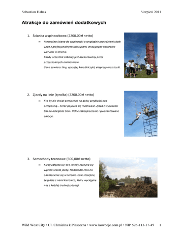 Sebastian Habas Sierpień 2011 Atrakcje do zamówień dodatkowych 1. Ścianka wspinaczkowa (2200,00zł netto) • Przenośna ściana do wspinaczki o wyglądzie prawdziwej skały wraz z profesjonalnymi uchwytami imitującymi naturalne warunki w terenie. Każdy uczestnik zabawy jest asekurowany przez przeszkolonych animatorów. Cena zawiera: liny, uprzęże, karabińczyki, ekspresy oraz kaski. 2. Zjazdy na linie (tyrolka) (2200,00zł netto) • Kto by nie chciał przejechać na dużej prędkości nad przepaścią... teraz pojawia się możliwość. Zjazd z wysokości 8m na odległość 50m. Pełne zabezpieczenie i gwarantowane emocje. 3. Samochody terenowe (500,00zł netto) • Kiedy załącza się 4x4, wtedy zaczyna się wyższa szkoła jazdy. Nadchodzi czas na odnalezienie się w terenie. Całe szczęście, że jedzie z nami kierowca, który wyciągnie nas z każdej trudnej sytuacji. Wild West City • Ul. Chmielna k.Piaseczna • www.kowboje.com.pl • NIP 526-113-17-49 1 Sebastian Habas Sierpień 2011 4. Paintball (45,00zł netto / 1 osoba) • Smak adrenaliny i wspaniała integracja na profesjonalnym polu paintballowym. Ścianki, bunkry i wieżyczki. Bronimy i przejmujemy obiekty, flagi i osoby. Liczy się komunikacja, stąd integracja jest gwarantowana 5. Przejazd Piaseczyńską Koleją Wąskotorową (25,00zł netto / 1 osoba) • Para bucha, koła zaczynają się kręcić, szyny prowadzą nas na miejsce imprezy. Zwiedzamy okolicę, czujemy wiatr we włosach, nucimy by wsiąść do pociągu byłe jakiego 6. Przejażdżka drezynami (5,00zł netto / 1 osoba) • Do wyboru mamy siłowe wyzwanie na drezynie mechanicznej, tradycyjnej z epoki. Alternatywę stanowi drezyna spalinowa, prawie dwukrotnie szybsza, aż czuć dreszczyk adrenaliny! 7. Winnetou (1600,00zł netto) • Zabawa w Indian i kowbojów stanowi nierozłączny element dzieciństwa. Zjeżdżalnia wykorzystuje motywy rodem z Dzikiego Zachodu. Zjazd odbywa się pod kątem 60° Wild West City • Ul. Chmielna k.Piaseczna • www.kowboje.com.pl • NIP 526-113-17-49 2 Sebastian Habas Sierpień 2011 8. Saloon (1200,00zł netto) • Zamek przenosi bawiące się dzieci w Świat Dzikiego Zachodu. Jest niezwykle kolorowy, z elementami oddającymi charakter epoki (imitacja wahadłowych drzwi, rewolwery czy też samotny sęp) 9. Symulator rodeo (1950,00zł netto) • Smak prawdziwego Dzikiego Zachodu. Super atrakcja nie tylko w plenerze, ale także wewnątrz pomieszczeń. Kilka programów automatycznych i tryb ręczny to gwarancja niezapomnianej zabawy! Możliwość przeprowadzania konkursów 10. Bungy – trampolina (2950,00zł netto) • Ekstremalne przeżycie dla wszystkich. Cztery batuty potrafią wynieść uczestnika nawet na wysokość 10m. Maksymalne wrażenia gwarantowane! 11. Pojedynek Kowbojów (1000,00zł netto) • Dwaj świeżo upieczeni kowboje stają naprzeciw siebie wyposażeni w wystrzałowe rewolwery MAVERICK. Na sygnał dobywają broni i... zwycięzca jest tylko jeden! Wild West City • Ul. Chmielna k.Piaseczna • www.kowboje.com.pl • NIP 526-113-17-49 3 Sebastian Habas Sierpień 2011 12. Drabinki Colorado (1500,00zł netto) • Oto malownicze urządzenie, w którym dwie osoby rywalizują ze sobą na sznurowanych drabinkach zawieszonych nad „przepaścią”. Wymaga to nie tylko zręczności, ale również niezwykłego zmysłu równowagi i wyczucia, gdyż każdy fałszywy ruch to ryzyko upadku... na szczęście na poduszkę pneumatyczną. 13. Segway PT (800,00zł netto) • Segway PT jest wyjątkowym eko pojazdem. Gwarantujemy, że już sam kontakt z nim sprawi ogromną przyjemność i zapadnie wszystkim głęboko w pamięć. Jazda na segway-u nie jest podobna do jazdy na żadnym innym pojeździe, nie jest to kolejna „hulajnoga”. Najważniejsza różnica polega na tym, że to nie my próbujemy utrzymać równowagę, tylko, że segway dopasowuje się do nas, a sterowanie odbywa się w sposób intuicyjny przy pomocy ruchów ciała użytkownika 14. Cymbergaj (1000,00zł netto) • Popularna gra stołowa, zwana też „Air Hockey” , wykorzystująca do zabawy efekt „poduszki powietrznej” , dzięki temu krążek utrzymuje się w powietrzu i może osiągnąć dużą prędkość podczas uderzenia. Wymagany refleks i szybka ręka Wild West City • Ul. Chmielna k.Piaseczna • www.kowboje.com.pl • NIP 526-113-17-49 4 Sebastian Habas Sierpień 2011 15. Mini Kasyno (2400,00zł netto) • Zabawa w kasyno. Repliki popularnych stołów do Ruletki, Black Jacka, Kości. Mniejsze rozmiary stołów sprawiają, że można je zainstalować praktycznie wszędzie. Duże emocje, silna dawka adrenaliny. Wszystko jest tu prawdziwe .. poza pieniędzmi. Uwaga: Jest to tylko zabawa w kasyno na replikach stołów przy zastosowaniu fikcyjnej waluty (opcjonalnie). Na tym urządzeniu nie możemy przeprowadzać prawdziwych gier hazardowych. Cena zawiera wynajem 3 stołów wraz z obsługą. Istnieje możliwość zorganizowania większej ilości stanowisk. 16. Kasyno Pro (3950,00zł netto) • Zabawa w super kasyno. Repliki popularnych stołów do Ruletki, Black Jacka, Kości i Pokera. Duże emocje, silna dawka adrenaliny. Wszystko jest tu prawdziwe .. poza pieniędzmi. Uwaga: Jest to tylko zabawa w kasyno na replikach stołów przy zastosowaniu fikcyjnej waluty (opcjonalnie). Na tym urządzeniu nie ma możliwości przeprowadzania prawdziwych gier hazardowych. Stoły mają wielkość standardową. Przy każdym może się bawić jednocześnie do 6 osób. Cena zawiera wynajem 3 stołów - Ruletka, Black Jack, Kości/Poker wraz z profesjonalną obsługą. Dodatkowo można zamówić czwarty stół - Poker Texas Holdem w cenie 1200 zł 17. Stół Poker Texas Hold’em (1500,00zł netto) • Zabawa w kasyno. Replika stołu do Pokera Texas Holdem. Duże emocje, silna dawka adrenaliny. Wszystko jest tu prawdziwe .. poza pieniędzmi. Uwaga: Jest to tylko zabawa w kasyno na replikach stołów przy zastosowaniu fikcyjnej waluty (opcjonalnie). Na 