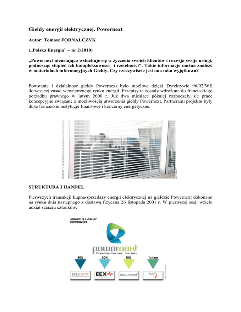 Giełdy energii elektrycznej. Powernext Autor: Tomasz FORNALCZYK („Polska Energia” – nr 2/2010) „Powernext nieustająco wsłuchuje się w życzenia swoich klientów i rozwija swoje usługi, podnosząc stopień ich kompleksowości i rzetelności". Takie informacje można znaleźć w materiałach informacyjnych Giełdy. Czy rzeczywiście jest ona taka wyjątkowa? Powstanie i działalność giełdy Powernext było możliwe dzięki Dyrektywie 96/92/WE dotyczącej zasad wewnętrznego rynku energii. Przepisy te zostały wdrożone do francuskiego porządku prawnego w lutym 2000 r. Już dwa miesiące później rozpoczęły się prace koncepcyjne związane z możliwością utworzenia giełdy Powernext. Partnerami projektu były duże francuskie instytucje finansowe i koncerny energetyczne. STRUKTURA I HANDEL Pierwszych transakcji kupna-sprzedaży energii elektrycznej na giełdzie Powernext dokonano na rynku dnia następnego z dostawą fizyczną 26 listopada 2001 r. W pierwszej sesji wzięło udział sześciu członków. Kolejnym krokiem było uruchomienie w 2004 r. rynku kontraktów terminowych dla energii elektrycznej. Podobnie jak w przypadku innych giełd, rynek ten stanowić miał uzupełnienie rynku dnia następnego i minimalizować ryzyko cenowe zawieranych na nim kontraktów. Od 2008 r. handel energią elektryczną na rynku dnia następnego dla obszaru Francji został przeniesiony do spółki EPEX Spot SE utworzonej wspólnie z niemiecką giełdą EEX. Rynek kontraktów terminowych dla energii elektrycznej w 2009 r. również został wytransferowany do jednej ze spółek działającej w strukturach spółki EEX – EEX Power Derivatives GmbH. Na giełdzie Powernext działał też rynek uprawnień do emisji CO2. Powstał on w czerwcu 2005 r. Parkiet uprawnień nie funkcjonował jednak zbyt długo w strukturach Powernext. Handel uprawnieniami został wykupiony w 2007 r. przez giełdę NYSE Euronext – czołowego europejskiego operatora rynku uprawnień do emisji CO2. Silna pozycja giełdy Powernext została więc dość szybko poważnie nadszarpnięta. Obecnie stanowi ona jedynie znaczącą platformę handlu gazem ziemnym. Ta stosunkowo nowa aktywność (rynek uruchomiony w 2007 r.) wydaje się wspierana przez władze Powernext. W tym zakresie na giełdzie Powernext działają dwa rynki: kontraktów z dostawą fizyczną oraz rynek terminowy. Na każdym z nich oferowanych jest kilka produktów różniących się między sobą głównie terminem realizacji kontraktu. W przypadku Powernext trudno o aktualne statystyki dotyczące handlu energią elektryczną. Pamiętajmy, że te aktywności prowadzone są przez jednostki wchodzące w skład giełdy EEX. Dane dotyczące cen i wolumenów z parkietów handlu energią elektryczną nie są publikowane na stronach Powernext. Wiadomo natomiast, że w roku 2008 na rynku dnia następnego handlowało aktywnie 70 uczestników giełdy. Po-wernext próbuje zatem rozwijać inne aktywności (oprócz handlu gazem). Wykorzystując swoje doświadczenie oraz infrastrukturę informatyczną, giełda ta próbuje również działalności konsultingowej. W ofercie Powernext znajdują się działania polegające na organizowaniu i prowadzeniu różnego rodzaju aukcji, zarówno w sektorze energetycznym, jak i innych zajmujących się handlem. Ta działalność oferowana przez Powernext daje kompleksowe wsparcie, począwszy od opracowania algorytmu i oprogramowania aukcji, poprzez sprzęt, aż do procedur związanych z płatnością i dostawą towaru. UDZIAŁOWCY, NADZÓR I REGULACJA Pierwszymi udziałowcami Powernext byli HGRT, Euronext, EDF, Société Généra-le, BNP Paribas, TotalFinalElf and Elec-trabel. Obecnie kapitał giełdy wynoszący 11 741 680 euro, podzielony jest między 10 udziałowców. Największym z nich jest Holding of Transmission System Operators (HGRT). HGRT tworzą operatorzy sieci przesyłowych Francji (RTE) – 25 proc. udziałów, Belgii (Elia) – 12,5 proc. oraz Holandii (TenneT) – 12,5 proc. Pozostali to światowe koncerny działające w branży elektroenergetycznej, gazowej i paliwowej. Powernext zobowiązana jest prowadzić swoją działalność, realizując postulat równoważenia interesów kupujących i sprzedających oraz wprowadzając zasady umożliwiające niedyskryminujący handel. Instytucjami uprawnionymi do nadzoru i kontrolowania giełdy Powernext są Urząd ds. Rynków Finansowych (Autorite des Marches Financiers – AMF) oraz odpowiednik polskiego Urzędu Regulacji Energetyki – Komisja Regulacji Energetyki (Commission de Regulation de l’Energie – CRE). AMF jest odpowiedzialny za poprawność i przejrzystość działań prowadzonych przez różnego rodzaju instytucje na rynkach finansowych, w tym giełd. Urząd ten ma dość szerokie uprawnienia. Oprócz funkcji polegających na monitorowaniu przestrzegania obowiązujących przepisów, może również wprowadzać nowe regulacje oraz zatwierdzać procedury implementowane przez podlegające jego nadzorowi instytucje. Urząd jest także uprawniony do prowadzenia dochodzeń i nakładania sankcji. CRE odpowiada za nadzór nad funkcjonowaniem regulowanych sektorów rynku elektroenergetycznego: systemów dystrybucyjnych i przesyłowych energii elektrycznej oraz gazu. Zadaniem CRE jest zapewnienie niedyskryminowanego dostępu do sieci (elektroenergetycznej i gazowej) dla wszystkich konsumentów i wytwórców tych dóbr. CRE wspiera również rozwój konkurencyjnego rynku energii elektrycznej i gazu, m.in. poprzez wsparcie przy wprowadzaniu nowych produktów oraz akcje edukacyjne dla klientów.
