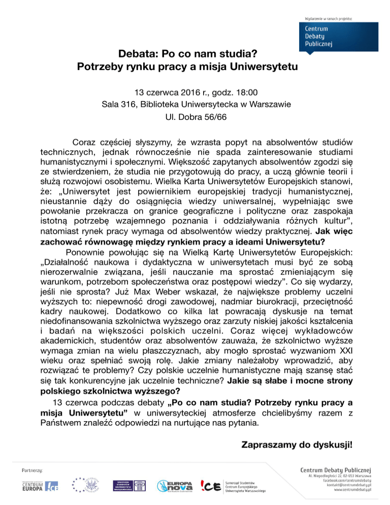Debata: Po co nam studia? Potrzeby rynku pracy a misja Uniwersytetu 13 czerwca 2016 r., godz. 18:00 Sala 316, Biblioteka Uniwersytecka w Warszawie Ul. Dobra 56/66 Coraz częściej słyszymy, że wzrasta popyt na absolwentów studiów technicznych, jednak równocześnie nie spada zainteresowanie studiami humanistycznymi i społecznymi. Większość zapytanych absolwentów zgodzi się ze stwierdzeniem, że studia nie przygotowują do pracy, a uczą głównie teorii i służą rozwojowi osobistemu. Wielka Karta Uniwersytetów Europejskich stanowi, że: „Uniwersytet jest powiernikiem europejskiej tradycji humanistycznej, nieustannie dąży do osiągnięcia wiedzy uniwersalnej, wypełniając swe powołanie przekracza on granice geograficzne i polityczne oraz zaspokaja istotną potrzebę wzajemnego poznania i oddziaływania różnych kultur”, natomiast rynek pracy wymaga od absolwentów wiedzy praktycznej. Jak więc zachować równowagę między rynkiem pracy a ideami Uniwersytetu? Ponownie powołując się na Wielką Kartę Uniwersytetów Europejskich: „Działalność naukowa i dydaktyczna w uniwersytetach musi być ze sobą nierozerwalnie związana, jeśli nauczanie ma sprostać zmieniającym się warunkom, potrzebom społeczeństwa oraz postępowi wiedzy”. Co się wydarzy, jeśli nie sprosta? Już Max Weber wskazał, że największe problemy uczelni wyższych to: niepewność drogi zawodowej, nadmiar biurokracji, przeciętność kadry naukowej. Dodatkowo co kilka lat powracają dyskusje na temat niedofinansowania szkolnictwa wyższego oraz zarzuty niskiej jakości kształcenia i badań na większości polskich uczelni. Coraz więcej wykładowców akademickich, studentów oraz absolwentów zauważa, że szkolnictwo wyższe wymaga zmian na wielu płaszczyznach, aby mogło sprostać wyzwaniom XXI wieku oraz spełniać swoją rolę. Jakie zmiany należałoby wprowadzić, aby rozwiązać te problemy? Czy polskie uczelnie humanistyczne mają szansę stać się tak konkurencyjne jak uczelnie techniczne? Jakie są słabe i mocne strony polskiego szkolnictwa wyższego? 13 czerwca podczas debaty „Po co nam studia? Potrzeby rynku pracy a misja Uniwersytetu” w uniwersyteckiej atmosferze chcielibyśmy razem z Państwem znaleźć odpowiedzi na nurtujące nas pytania. Zapraszamy do dyskusji! Formuła dyskusji Aby zapewnić swobodę dyskusji i atmosferę dialogu organizatorzy zdecydowali przyjąć następującą formułę dyskusji: Wypowiedź wprowadzająca do debaty Prelegenci wygłaszają przygotowane wcześniej wypowiedzi na zadane przez organizatorów zagadnienie Dyskusja i komentarze do wypowiedzi Odnosząc się do początkowych wypowiedzi, prelegenci dyskutują na wskazane przez moderatora obszary 30 min 30 min Włączenie publiczności do debaty Publiczność otrzymuje możliwość skomentowania wcześniejszej dyskusji oraz zadania prelegentom dodatkowych pytań 30 min Do pierwszej części debaty pt. „Po co nam studia? Potrzeby rynku pracy a misja Uniwersytetu” prosilibyśmy o przygotowanie krótkiej wypowiedzi prezentującej dwie słabe oraz dwie mocne strony polskiego szkolnictwa wyższego (około 5 minut). Zachęcamy do aktywnego uczestnictwa w debacie, konfrontacji poglądów, wymiany argumentów i zadawania pytań! Organizatorzy: Centrum Europejskie Uniwersytetu Warszawskiego, Stowarzyszenie Studentów i Absolwentów Centrum Europa !CE, Samorząd Studentów Centrum Europejskiego UW oraz Koło Naukowe Europa Nova. O projekcie Centrum Debaty Publicznej: Centrum Debaty Publicznej, to więcej niż forum publicznej dyskusji. To platforma wymiany myśli zbudowana w oparciu o tradycyjną rolę uczelni wyższych jako animatorów dyskursu publicznego ufundowana na zasadzie swobody wymiany poglądów i reprezentowania szerokiego spektrum opinii. Wybierając istotne społecznie tematy, zniekształcane często przez media i polityczną narrację, staramy się budować przestrzeń rzetelnej i głębokiej refleksji, a poprzez jednoczesne zaangażowanie środowisk studenckich współtworzyć nowoczesną polską humanistykę i kształtować odpowiedzialność obywatelską. W oparciu o 9 lat doświadczeń przygotowujemy konferencje, debaty i publikacje łączące w sobie akademicką tradycję intelektualną z potrzebą aktywnego uczestnictwa w sporach kształtujących współczesną Polskę, Europę i świat.