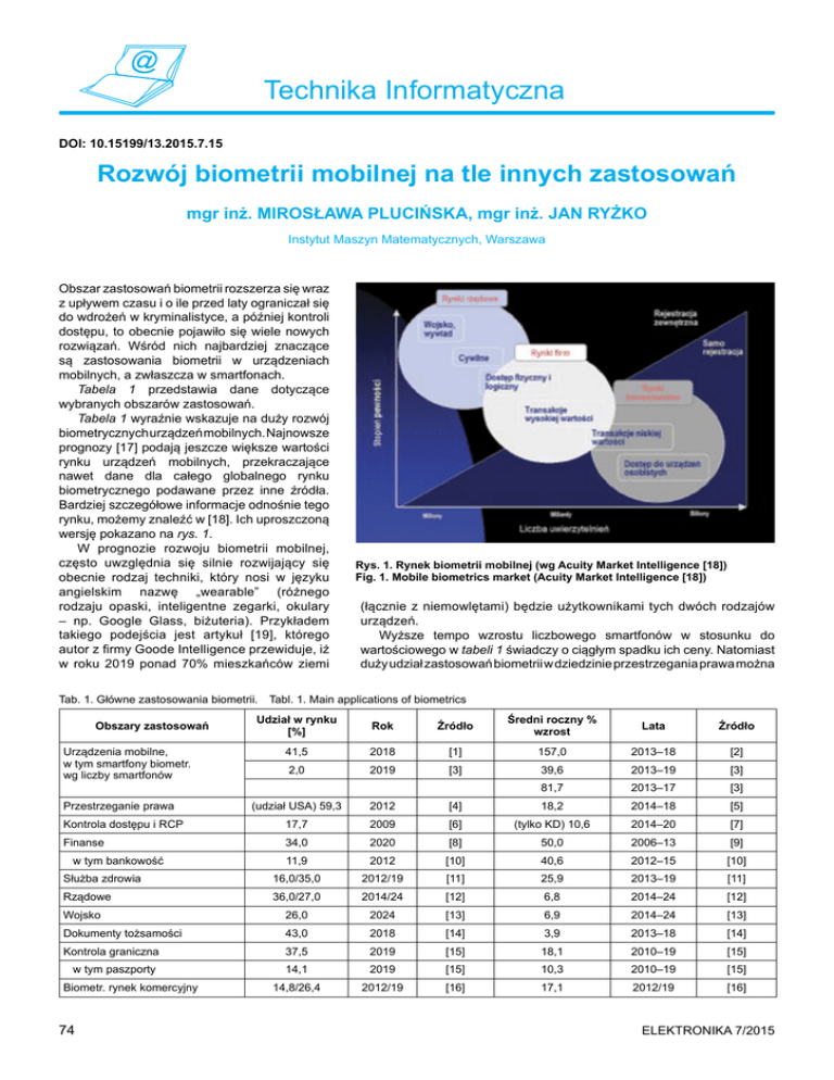 Technika Informatyczna DOI: 10.15199/13.2015.7.15 Rozwój biometrii mobilnej na tle innych zastosowań mgr inż. Mirosława Plucińska, mgr inż. Jan Ryżko Instytut Maszyn Matematycznych, Warszawa Obszar zastosowań biometrii rozszerza się wraz z upływem czasu i o ile przed laty ograniczał się do wdrożeń w kryminalistyce, a później kontroli dostępu, to obecnie pojawiło się wiele nowych rozwiązań. Wśród nich najbardziej znaczące są zastosowania biometrii w urządzeniach mobilnych, a zwłaszcza w smartfonach. Tabela 1 przedstawia dane dotyczące wybranych obszarów zastosowań. Tabela 1 wyraźnie wskazuje na duży rozwój biometrycznych urządzeń mobilnych. Najnowsze prognozy [17] podają jeszcze większe wartości rynku urządzeń mobilnych, przekraczające nawet dane dla całego globalnego rynku biometrycznego podawane przez inne źródła. Bardziej szczegółowe informacje odnośnie tego rynku, możemy znaleźć w [18]. Ich uproszczoną wersję pokazano na rys. 1. W prognozie rozwoju biometrii mobilnej, często uwzględnia się silnie rozwijający się obecnie rodzaj techniki, który nosi w języku angielskim nazwę „wearable” (różnego rodzaju opaski, inteligentne zegarki, okulary – np. Google Glass, biżuteria). Przykładem takiego podejścia jest artykuł [19], którego autor z firmy Goode Intelligence przewiduje, iż w roku 2019 ponad 70% mieszkańców ziemi Rys. 1. Rynek biometrii mobilnej (wg Acuity Market Intelligence [18]) Fig. 1. Mobile biometrics market (Acuity Market Intelligence [18]) (łącznie z niemowlętami) będzie użytkownikami tych dwóch rodzajów urządzeń. Wyższe tempo wzrostu liczbowego smartfonów w stosunku do wartościowego w tabeli 1 świadczy o ciągłym spadku ich ceny. Natomiast duży udział zastosowań biometrii w dziedzinie przestrzegania prawa można Tab. 1. Główne zastosowania biometrii. Tabl. 1. Main applications of biometrics Obszary zastosowań Urządzenia mobilne, w tym smartfony biometr. wg liczby smartfonów Przestrzeganie prawa Udział w rynku [%] Rok Źródło Średni roczny % wzrost Lata Źródło 41,5 2018 [1] 157,0 2013–18 [2] 2,0 2019 [3] 39,6 2013–19 [3] 81,7 2013–17 [3] (udział USA) 59,3 2012 [4] 18,2 2014–18 [5] Kontrola dostępu i RCP 17,7 2009 [6] (tylko KD) 10,6 2014–20 [7] Finanse 34,0 2020 [8] 50,0 2006–13 [9] 11,9 2012 [10] 40,6 2012–15 [10] Służba zdrowia 16,0/35,0 2012/19 [11] 25,9 2013–19 [11] Rządowe w tym bankowość 36,0/27,0 2014/24 [12] 6,8 2014–24 [12] Wojsko 26,0 2024 [13] 6,9 2014–24 [13] Dokumenty tożsamości 43,0 2018 [14] 3,9 2013–18 [14] Kontrola graniczna 37,5 2019 [15] 18,1 2010–19 [15] 14,1 2019 [15] 10,3 2010–19 [15] 14,8/26,4 2012/19 [16] 17,1 2012/19 [16] w tym paszporty Biometr. rynek komercyjny 74 Elektronika 7/2015 tłumaczyć nieostrymi podziałami między poszczególnymi zastosowaniami. Problemem okazało się również znalezienie aktualnych danych odnośnie zastosowań w kontroli dostępu i rejestracji czasu pracy, mimo spotykanych stwierdzeń [20], że to właśnie zapotrzebowanie na kontrolę dostępu pobudza rynek biometryczny. Można też łatwo znaleźć doniesienia o osiągnięciach chińskiej firmy ZKTeco w obszarze rejestracji czasu pracy [21]. Znaczny postęp można zaobserwować w zastosowaniach finansowych, wykorzystujących głównie technikę rozpoznawania głosu [22], choć nie brakuje również prób uwierzytelniania za pomocą techniki rozpoznawania oka [23]. Jak pokazano w tabeli 1 tempo wzrostu w tym obszarze jest wysokie i oczekuje się jego dalszego silnego przyśpieszenia [9]. Czynione są również próby wykorzystania narodowych dowodów tożsamości do ułatwienia przeprowadzania transakcji finansowych [24]. W bankach sytuacja wygląda podobnie jak w całym sektorze finansowym. Raport firmy Research and Markets [25] przewiduje tu średni roczny wzrost w wysokości 9,4% w latach 2014–19. W tych zastosowaniach również udział techniki rozpoznawania głosu jest najbardziej widoczny. Technikę rozpoznawania głosu głównie dostarcza firma Nuance Communications, której produkty zostały wdrożone w Banco Santander w Meksyku [26]. Brytyjski bank Barclays wykorzystuje technikę rozpoznawania naczyń krwionośnych palca [27], podobnie jak Getin Bank w Polsce, dostarczoną przez firmy Hitachi Europe i Wincor Nixdorf [28]. Rząd Pakistanu również podejmują działania, aby zmniejszyć oszustwa w bankowości [29] dzięki zastosowaniu biometrii. Dziedziną, w której udział zastosowań biometrycznych zdecydowanie wzrasta jest służba zdrowia. Pokazuje to tabela 1, według której procentowy udział tych zastosowań ma wzrosnąć ponad dwukrotnie w ciągu 7 lat. Zmiany, jakie tu zachodzą, polegają na tym, że dostęp do danych medycznych i kontrola nad nimi przechodzi od dostawców usług do samych pacjentów [30]. Najwięcej doniesień o osiągnięciach w tej dziedzinie pochodzi z USA w związku z rozbudowywanym tam systemem ubezpieczeń zdrowotnych. Wykorzystywane są tu różne techniki od rozpoznawania tęczówki (system RightPatient) po rozpoznawanie naczyń krwionośnych dłoni (PalmSecure) [31]. Opracowywane są specjalne urządzenia do zabezpieczania danych medycznych [32] i wykorzystuje się technikę rozpoznawania głosu do utrzymania integralności danych pacjenta [33]. Ostatnio opublikowane dane [34] wskazują na jeszcze wyższe tempo rozwoju zastosowań biometrii w służbie zdrowia, a wśród firm dostarczających rozwiązania biometryczne najczęściej wymieniane są: Nuance Communications, jeśli chodzi o rozpoznawanie głosu oraz BIO-key i GenKey z rozwiązaniami opartymi na odciskach palców. Wspomniany już system RightPatient jest produktem firmy M2SYS, która ma swoje wdrożenia w ponad 100 krajach i wykorzystuje sześć różnych technik rozpoznawania biometrycznego. Kolejną pozycję tabeli 1 stanowią zastosowania rządowe i tu można odnotować pewien regres, co jest związane zarówno z rozwojem