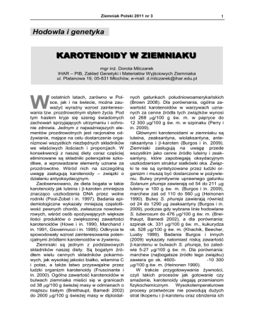Ziemniak Polski 2011 nr 3 1 Hodowla i genetyka KAROTENOIDY W ZIEMNIAKU mgr inż. Dorota Milczarek IHAR – PIB, Zakład Genetyki i Materiałów Wyjściowych Ziemniaka ul. Platanowa 19, 05-831 Młochów, e-mail: [email protected] ostatnich latach, zarówno w Polsce, jak i na świecie, można zauważyć wyraźny wzrost zainteresowania tzw. prozdrowotnym stylem życia. Pod tym hasłem kryje się szereg świadomych zachowań sprzyjających utrzymaniu i ochronie zdrowia. Jednym z najważniejszych elementów prozdrowotnych jest racjonalne odżywianie, mające na celu dostarczenie organizmowi wszystkich niezbędnych składników we właściwych ilościach i proporcjach. W konsekwencji z naszej diety coraz częściej eliminowane są składniki potencjalnie szkodliwe, a wprowadzane elementy uznane za prozdrowotne. Wśród nich na szczególną uwagę zasługują karotenoidy – związki o działaniu antyoksydacyjnym. Zaobserwowano, że dieta bogata w takie karotenoidy jak luteina i -karoten zmniejsza znacząco uszkodzenia DNA przez wolne rodniki (Pool-Zobel i in. 1997). Badania epidemiologiczne wykazały mniejszą częstotliwość pewnych chorób, zwłaszcza nowotworowych, wśród osób spożywających większe ilości produktów o zwiększonej zawartości karotenoidów (Howe i in. 1990, Marchand i in. 1991, Giovannucci i in. 1995). Odkrycia te spowodowały wzrost zainteresowania potencjalnymi źródłami karotenoidów w żywieniu. Ziemniaki są jednym z podstawowych składników naszej diety. Są bogatym źródłem wielu cennych składników pokarmowych, jak wysokiej jakości białko, witamina C i potas, a także łatwo przyswajalne przez ludzki organizm karotenoidy (Fruscinante i in. 2000). Ogólna zawartość karotenoidów w bulwach ziemniaka mieści się w granicach od 38 g/100 g świeżej masy w odmianach o miąższu białym (Breithaupt, Bamedi 2002) do 2600 g/100 g świeżej masy w diploidal- W nych gatunkach południowoamerykańskich (Brown 2008). Dla porównania, ogólna zawartość karotenoidów w warzywach uznanych za cenne źródła tych związków wynosi od 268 g/100 g św. m. w papryce do 12 300 g/100 g św. m. w szpinaku (Perry i in. 2009). Głównymi karotenoidami w ziemniaku są luteina, zeaksantyna, wiolaksantyna, anteraksantyna i -karoten (Burgos i in. 2009). Ziemniaki zasługują na uwagę przede wszystkim jako cenne źródło luteiny i zeaksantyny, które zapobiegają oksydacyjnym uszkodzeniom struktur siatkówki oka. Związki te nie są syntetyzowane przez ludzki organizm i muszą być dostarczone w pożywieniu. Bulwy prymitywnie uprawnego gatunku Solanum phureja zawierają od 54 do 211 g luteiny w 100 g św. m. (Burgos i in. 2009), marchew zaś od 110 do 560 g (Heinonen 1990). Bulwy S. phureja zawierają również od 24 do 1290 g zeaksantyny (Burgos i in. 2009), podczas gdy wybrane linie hodowlane S. tuberosum do 476 g/100 g św. m. (Breithaupt, Bamedi 2002), a dla porównania: szpinak ok. 331 g/100 g św. m., kukurydza ok. 528 g/100 g św. m. (Khachik, Beecher, Lusby 1989). Badania Burgos i innych (2009) wykazały natomiast niską zawartość -karotenu w bulwach S. phureja, bo zaledwie 5-27 g/100 g św. m. Dla porównania: marchew (najbogatsze źródło tego związku) zawiera go ok. 4600-10 300 g/100 g św. m. (Heinonen 1990). W trakcie przygotowywania żywności, czyli takich procesów jak gotowanie czy smażenie, karotenoidy ulegają przemianom fizykochemicznym. Wysokotemperaturowe procesy przetwórcze nie powodują dużych strat likopenu i -karotenu oraz obniżenia ich 2 Ziemniak Polski 2011 nr 3 aktywności przeciwutleniającej, a rozkład ścian komórkowych pod wpływem temperatury dodatkowo zwiększa ich biodostępność (Miglio i in. 2008, Perry, Rasmussen, Johnson 2009). -karoten w czasie gotowania ulega destrukcji jedynie w 8-10% (Khachik, Beecher 1988). Co więcej, niekiedy obróbka cieplna wpływa korzystnie na zawartość przyswajalnych dla organizmu karotenoidów. W gotowanych bulwach ziemniaka odnotowano wzrost zawartości zeaksantyny wskutek przemiany w ten związek nieprzyswajalnej dla organizmu wiolaksantyny (Granado i in. 1992). Zróżnicowana stabilność poszczególnych karotenoidów pod wpływem wysokiej temperatury jest uzależniona od ich budowy chemicznej. Karotenoidy pod względem budowy chemicznej są terpenoidami. Synteza karotenoidów zachodzi w plastydach. Prekursorem na szlaku powstawania karotenoidów jest cząsteczka difosforanu izopentenylu. Cały szereg reakcji prowadzi do powstania fitoenu oraz fitofluenu. Fitoen i fitofluen są bezpośrednimi prekursorami karotenoidów acyklicznych. Ich dalsze przemiany prowadzą do powstania karotenoidów cyklicznych – najpierw -karotenu, a następnie zeaksantyny, anteraksantyny i wiolaksantyny (Cuningham, Gantt 1998; Hirschberg 2001). Poznano pewne enzymy biorące udział w przemianach karotenoidów. Jednym z nich jest epoksydaza zeaksantyny (Morris i in. 2004). Jest ona m.in. odpowiedzialna za zmniejszanie zawartości zeaksantyny podczas przechowywania ziemniaków. Wolters i inni (2010) zidentyfikowali jeden allel genu Zep kodującego epoksydazę zeaksantyny, który poprzez obniżoną ekspresję redukuje aktywność tego enzymu, co w konsekwencji powoduje kumulację zeaksantyny w bulwach. Drugim enzymem pełniącym istotną funkcję na szlaku biosyntezy karotenoidów w ziemniaku jest hydroksylaza -karotenu, enzym katalizujący przemianę -karotenu do zeaksantyny. Brown i inni (2006) zidentyfikowali gen bch kodujący hydroksylazę -karotenu. Opracowali również markery typu CAPS dla allelu B genu bch, które sprawdzili na trzynastu odmianach o białym i żółtym miąższu, otrzymując prążki specyficzne dla odmian o miąższu żółtym. Gen ten prawdo- podobnie kosegreguje z locus Y zlokalizowanym na chromosomie III (Bonierbale i in. 1988), wpływającym na zabarwienie miąższu. De Koyer i inni (2010) wyróżnili w badanych przez siebie materiałach formy, których intensywność zabarwienia mią