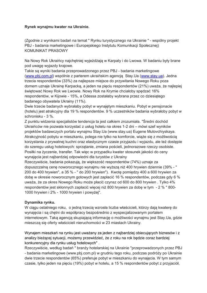 Rynek wynajmu kwater na Ukrainie. (Zgodnie z wynikami badań na temat " Rynku turystycznego na Ukrainie " - wspólny projekt PBJ - badania marketingowe i Europejskiego Instytutu Komunikacji Społecznej) KOMUNIKAT PRASOWY Na Nowy Rok Ukraińcy najchętniej wyjeżdżają w Karpaty i do Lwowa. W badaniu były brane pod uwagę wyjazdy krajowe. Takie są wyniki badania przeprowadzonego przez PBJ - badania marketingowe (www.pbj.com.pl) wspólnie z parterem ukraińskim agencją Stay.Ua (www.stay.ua). Jedna trzecia respondentów (33%) za najlepsze miejsce do przywitania Nowego Roku poza domem uznaje Ukrainę Karpacką, a jeden na pięciu respondentów (21%) uważa, że najlepiej świętować Nowy Rok we Lwowie. Nowy Rok na Krymie chciałoby spędzać 16% respondentów, w Kijowie - 15%, a Odessa zostałaby wybrana przez co dziesiątego badanego obywatela Ukrainy (11%). Dwie trzecie badanych wybrałaby pobyt w wynajętym mieszkaniu. Pobyt w pensjonacie (hotelu) jest atrakcyjny dla 19 % respondentów. 9 % uczestników badania wybrałoby pobyt w schronisku - 3 %. Z punktu widzenia specjalistów tendencja ta jest całkiem zrozumiała. "Średni dochód Ukraińców nie pozwala korzystać z usług hotelu na okres 1-2 dni – mówi szef wyników projektów badawczych portalu wynajmu Stay.Ua (www.stay.ua) Eugene Mutovchiyskaya. Atrakcyjność pobytu w mieszkaniu, polega nie tylko na komforcie, wiąże się z możliwością korzystania z prywatnej kuchni oraz elastycznym czasie przyjazdu i wyjazdu, ale też dostępie do szeregu usług hotelowych: sprzątanie, zmiana pościeli, jednorazowe rzeczy osobiste. Posiłki na życzenie, transfer. Tak więc w przypadku kwater stosunek jakości do ceny wynajęcia jest najbardziej odpowiedni dla turystów z Ukrainy Rzeczywiście, badania pokazują, że większość respondentów (74%) uznaje za dopuszczalną cenę noworocznego wynajmu nie wyższą niż 400 hrywien dziennie (39% - " 200 do 400 hrywien", a 35 % - " do 200 hrywien"). Kwotę pomiędzy 400 a 600 hrywien za dobę w okresie noworocznym gotowych jest zapłacić 16 % respondentów, podczas gdy 6 % uważa, że za okres Nowego Roku może płacić czynsz od 600 do 800 hrywien . Tylko 4% respondentów jest skłonnych zapłacić więcej niż 800 hrywien za dobę w tym - 2 % " 8001000 hrywien i 2% - 1000 hrywien i powyżej". Dynamika rynku. W ciągu ostatniego roku, o jedną trzecią wzrosła liczba właścicieli, którzy dają kwaterę do wynajęcia i są chętni do współpracy bezpośrednio z wyspecjalizowanym portalem internetowym. Taką agencją skupiającą informację o możliwości wynajmu jest Stay.Ua, gdzie mieszczą się oferty właścicieli nieruchomości w 23 miastach Ukrainy. Wynajem mieszkań na rynku jest uważany za jeden z najbardziej obiecujących biznesów i z analizy bieżącej sytuacji, możemy przewidzieć, że z roku na rok będzie coraz bardziej konkurencyjny dla rynku usług hotelowych" . Rzeczywiście, według badań " branży hotelarskiej na Ukrainie "przeprowadzonych przez PBJ - badania marketingowe (www.pbj.com.pl) w grudniu tego roku, podczas podróży po Ukrainie dwie trzecie respondentów (65%) preferuje pobyt w mieszkaniu do wynajęcia. W tym samym czasie, tylko jeden na pięciu (19%) pobyt w hotelu, a 15 % respondentów pobyt z przyjaciół, znajomych lub krewnych. Ich wybór podyktowany jest korzystną ceną, która jest najważniejszą przyczyną takich preferencji dla co czwartego respondenta. Według badania PBJ zdecydowana większość respondentów (90%) jest gotowa płacić za mieszkanie w podróży nie więcej niż 400 hrywien dziennie. Podczas gdy 53 % jest w stanie zapłacić za wynajem dzienny od 200 do 400 hrywien, a 37 % chce cena zmieściła się w kwocie do 200 hrywien. Ponad 400 hrywien jest w stanie zapłacić za dzienny wynajem, tylko 9 % badanych. Restrukturyzacja rynku dziennego wynajmu mieszkań na Ukrainie. Według agencji badania Stay.ua i właścicieli kwater w ostatnich latach rynek wynajmu dziennego mieszkań na Ukrainie jest w trakcie restrukturyzacji. Istnieje kilka powodów tej sytuacji. Po pierwsze, w ciągu ostatnich trzech lat, udział turystyki rośnie. Ta tendencja stabilnie się utrzymuje od 2011 roku. Według lokalnego Stowarzyszenia Liderów wzrostu rynku w branży turystycznej w 2013 r. wynosił 10%. Po drugie, infrastruktura hotelowa nie nadąża, aby sprostać wymaganiom rynku. Kryzys finansowy z lat 2008-2009 doprowadził do zamrożenia wielu projektów na rynku hoteli lepszej jakości. Choć dziś sytuacja się zmienia, oddanie do eksploatacji wystarczającej liczby hoteli jest wciąż nieuchwytnym celem. Konsumenci z 4-5-gwiazdkowych hoteli w stolicy to głównie zagraniczni goście biznesowi. Obsługa wielu hoteli, zadeklarowanych jako " trzy gwiazdki" często pozostawia wiele do życzenia, a ceny są zbyt wysokie w stosunku do jakości usług. "W tej sytuacji, wielu turystów krajowych woli pozostać w prywatnych apartamentach. W pierwszej kolejności, ponieważ tutaj są przystępne ceny” - wyjaśnia Anna Torgonskaya. Ponadto, klienci otrzymują coś w rodzaju "premii " - atmosferę domu, obecność wszystkich niezbędnych urządzeń. Ponadto, takie firmy jak Stay.Ua gwarantują klientom wygodny proces rezerwacji i prywatność. Korzyści właściciela. Rynek dziennego wynajmu dla wielu właścicieli wydaje się być o wiele bardziej opłacalny niż długoterminowy wynajem mieszkań. Coraz częściej usługi wynajmu są przeprowadzane dzięki partnerstwie firm wspomagających. Całkowity koszt pobytu wielu osób w ciągu miesiąca jest wyższy niż zamieszkanie jednego klienta. Właściciele mają świadomość, że już nie muszą tracić czasu i energii na poszukiwanie nowych klientów. Mogą oni przekazać swoje apartamenty w zarządzanie operacyjne do firm, które mają pewien procent za usługi pośrednictwa . Nasz adres: PBJ badania Marketingowe www.pbj.com.pl ul . Surowieckiego 12 lok . 218 B, Warszawa Tel. : 22/855 49 09 Mail: