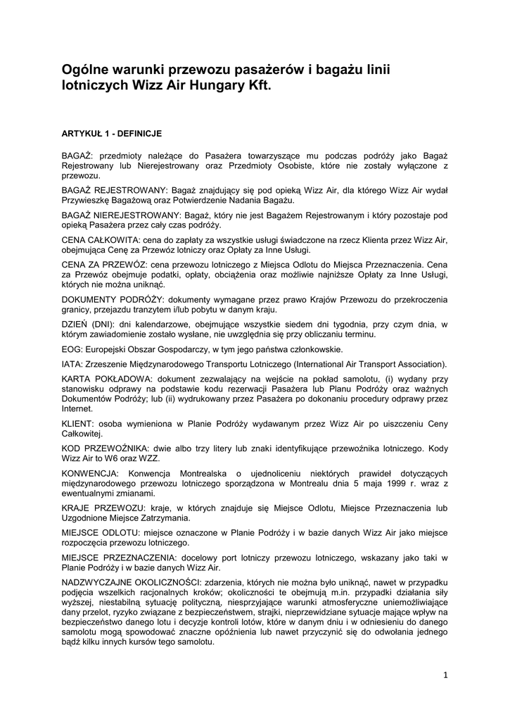 Ogólne warunki przewozu pasażerów i bagażu linii lotniczych Wizz Air Hungary Kft. ARTYKUŁ 1 - DEFINICJE BAGAŻ: przedmioty należące do Pasażera towarzyszące mu podczas podróży jako Bagaż Rejestrowany lub Nierejestrowany oraz Przedmioty Osobiste, które nie zostały wyłączone z przewozu. BAGAŻ REJESTROWANY: Bagaż znajdujący się pod opieką Wizz Air, dla którego Wizz Air wydał Przywieszkę Bagażową oraz Potwierdzenie Nadania Bagażu. BAGAŻ NIEREJESTROWANY: Bagaż, który nie jest Bagażem Rejestrowanym i który pozostaje pod opieką Pasażera przez cały czas podróży. CENA CAŁKOWITA: cena do zapłaty za wszystkie usługi świadczone na rzecz Klienta przez Wizz Air, obejmująca Cenę za Przewóz lotniczy oraz Opłaty za Inne Usługi. CENA ZA PRZEWÓZ: cena przewozu lotniczego z Miejsca Odlotu do Miejsca Przeznaczenia. Cena za Przewóz obejmuje podatki, opłaty, obciążenia oraz możliwie najniższe Opłaty za Inne Usługi, których nie można uniknąć. DOKUMENTY PODRÓŻY: dokumenty wymagane przez prawo Krajów Przewozu do przekroczenia granicy, przejazdu tranzytem i/lub pobytu w danym kraju. DZIEŃ (DNI): dni kalendarzowe, obejmujące wszystkie siedem dni tygodnia, przy czym dnia, w którym zawiadomienie zostało wysłane, nie uwzględnia się przy obliczaniu terminu. EOG: Europejski Obszar Gospodarczy, w tym jego państwa członkowskie. IATA: Zrzeszenie Międzynarodowego Transportu Lotniczego (International Air Transport Association). KARTA POKŁADOWA: dokument zezwalający na wejście na pokład samolotu, (i) wydany przy stanowisku odprawy na podstawie kodu rezerwacji Pasażera lub Planu Podróży oraz ważnych Dokumentów Podróży; lub (ii) wydrukowany przez Pasażera po dokonaniu procedury odprawy przez Internet. KLIENT: osoba wymieniona w Planie Podróży wydawanym przez Wizz Air po uiszczeniu Ceny Całkowitej. KOD PRZEWOŹNIKA: dwie albo trzy litery lub znaki identyfikujące przewoźnika lotniczego. Kody Wizz Air to W6 oraz WZZ. KONWENCJA: Konwencja Montrealska o ujednoliceniu niektórych prawideł dotyczących międzynarodowego przewozu lotniczego sporządzona w Montrealu dnia 5 maja 1999 r. wraz z ewentualnymi zmianami. KRAJE PRZEWOZU: kraje, w których znajduje się Miejsce Odlotu, Miejsce Przeznaczenia lub Uzgodnione Miejsce Zatrzymania. MIEJSCE ODLOTU: miejsce oznaczone w Planie Podróży i w bazie danych Wizz Air jako miejsce rozpoczęcia przewozu lotniczego. MIEJSCE PRZEZNACZENIA: docelowy port lotniczy przewozu lotniczego, wskazany jako taki w Planie Podróży i w bazie danych Wizz Air. NADZWYCZAJNE OKOLICZNOŚCI: zdarzenia, których nie można było uniknąć, nawet w przypadku podjęcia wszelkich racjonalnych kroków; okoliczności te obejmują m.in. przypadki działania siły wyższej, niestabilną sytuację polityczną, niesprzyjające warunki atmosferyczne uniemożliwiające dany przelot, ryzyko związane z bezpieczeństwem, strajki, nieprzewidziane sytuacje mające wpływ na bezpieczeństwo danego lotu i decyzje kontroli lotów, które w danym dniu i w odniesieniu do danego samolotu mogą spowodować znaczne opóźnienia lub nawet przyczynić się do odwołania jednego bądź kilku innych kursów tego samolotu. 1 NIEMOWLĘ: dziecko, które w dniu podróży nie ukończyło dwóch lat. OGÓLNE WARUNKI PRZEWOZU: postanowienia odnoszące się do przewozu lotniczego Pasażerów oraz Bagażu wykonywanego przez Wizz Air zawarte w niniejszym dokumencie. OPŁATY ZA INNE USŁUGI/ OPŁATY ZA USŁUGĘ: kwoty płatne za różne usługi związane z przewozem lotniczym, wskazane na Stronie Internetowej, z wyjątkiem Opłaty za Niewykorzystane Miejsce oraz Opłaty za Rezygnację. OPŁATA ZA REZYGNACJĘ: kwota płatna w przypadku odwołania rezerwacji przez Pasażera, w wysokości wskazanej na Stronie Internetowej. OPŁATA ZA NIEWYKORZYSTANE MIEJSCE: kwota, w wysokości wskazanej na Stronie Internetowej, płatna w przypadku skorzystania przez Wizz Air z prawa do unieważnienia i odwołania rezerwacji z powodów dotyczących Pasażera zgodnie z niniejszymi Ogólnymi Warunkami Przewozu. OSOBA PŁACĄCA ZA PRZEWÓZ: osoba fizyczna lub prawna płacąca Wizz Air Cenę Całkowitą za przewóz lotniczy Pasażera wykonywany przez Wizz Air, zgodnie z Planem Podróży. PASAŻER O OGRANICZONEJ SPRAWNOŚCI RUCHOWEJ LUB WYMAGAJĄCY SPECJALNEJ POMOCY: każda osoba, której sprawność ruchowa jest obniżona z powodu niepełnosprawności fizycznej (sensorycznej lub motorycznej), umysłowej, wieku, choroby lub z każdego innego powodu, podczas korzystania z transportu, której stan wymaga szczególnej troski oraz dostosowania do jej potrzeb usług przeznaczonych dla wszystkich Pasażerów. PASAŻER: osoba wymieniona w Planie Podróży wydawanym przez Wizz Air i jako taka uwzględniona w bazie danych Wizz Air. PLAN PODRÓŻY: dokument wydawany Pasażerowi po dokonaniu pełnej zapłaty Ceny Całkowitej na rzecz Wizz Air, zawierający imię i nazwisko Pasażera oraz szczegóły lotu, takie jak Miejsce Odlotu, Miejsce Przeznaczenia oraz ewentualne Uzgodnione Miejsca Zatrzymania, godziny odlotu i przylotu; dokument ten zawiera również odwołania do Warunków Umowy oraz inne ważne informacje. Plan Podróży należy wydrukować w przypadku rezerwacji dokonanej przez Internet lub zostanie on przekazany Pasażerowi przez biuro podróży, które dokonało rezerwacji dla Pasażera. Jeżeli Pasażer dokonuje rezerwacji za pośrednictwem Telecentrum, zostanie mu przekazany kod rezerwacji, a Plan Podróży zostanie przesłany faksem, pocztą elektroniczną lub zwykłą, zgodnie z niniejszymi Ogólnymi Warunkami Przewozu. POŁĄCZENIA: dwa lub więcej odcinki lotu w danym kierunku zarezerwowane w ramach tej samej rezerwacji. POTWIERDZENIE NADANIA BAGAŻU: dokument wydawany wyłącznie w celu identyfikacji Bagażu Rejestrowanego dołączony do Karty Pokładowej Pasażera. PRAWO WŁAŚCIWE: przepisy prawa Węgier mające zastosowanie do stosunku wynikającego z Umowy; przepisy Rozporząd