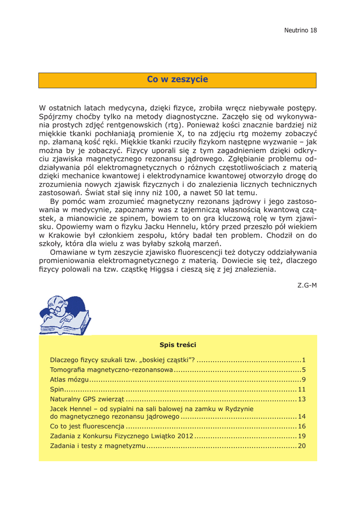 Neutrino 18 Co w zeszycie W ostatnich latach medycyna, dzięki fizyce, zrobiła wręcz niebywałe postępy. Spójrzmy choćby tylko na metody diagnostyczne. Zaczęło się od wykonywania prostych zdjęć rentgenowskich (rtg). Ponieważ kości znacznie bardziej niż miękkie tkanki pochłaniają promienie X, to na zdjęciu rtg możemy zobaczyć np. złamaną kość ręki. Miękkie tkanki rzuciły fizykom następne wyzwanie – jak można by je zobaczyć. Fizycy uporali się z tym zagadnieniem dzięki odkryciu zjawiska magnetycznego rezonansu jądrowego. Zgłębianie problemu oddziaływania pól elektromagnetycznych o różnych częstotliwościach z materią dzięki mechanice kwantowej i elektrodynamice kwantowej otworzyło drogę do zrozumienia nowych zjawisk fizycznych i do znalezienia licznych technicznych zastosowań. Świat stał się inny niż 100, a nawet 50 lat temu. By pomóc wam zrozumieć magnetyczny rezonans jądrowy i jego zastosowania w medycynie, zapoznamy was z tajemniczą własnością kwantową cząstek, a mianowicie ze spinem, bowiem to on gra kluczową rolę w tym zjawisku. Opowiemy wam o fizyku Jacku Hennelu, który przed przeszło pół wiekiem w Krakowie był członkiem zespołu, który badał ten problem. Chodził on do szkoły, która dla wielu z was byłaby szkołą marzeń. Omawiane w tym zeszycie zjawisko fluorescencji też dotyczy oddziaływania promieniowania elektromagnetycznego z materią. Dowiecie się też, dlaczego fizycy polowali na tzw. cząstkę Higgsa i cieszą się z jej znalezienia. Z.G-M Spis treści Dlaczego fizycy szukali tzw. „boskiej cząstki”?...............................................1 Tomografia magnetyczno-rezonansowa.........................................................5 Atlas mózgu..............................................................................................9 Spin....................................................................................................... 11 Naturalny GPS zwierząt............................................................................ 13 Jacek Hennel – od sypialni na sali balowej na zamku w Rydzynie do magnetycznego rezonansu jądrowego.................................................... 14 Co to jest fluorescencja............................................................................ 16 Zadania z Konkursu Fizycznego Lwiątko 2012.............................................. 19 Zadania i testy z magnetyzmu................................................................... 20 Neutrino 18 1 Dlaczego fizycy szukali tzw. „boskiej cząstki”? http://efizyka.win.pl/przygoda/1 Z czego zbudowany jest świat? Fizycy od stuleci próbują rozwiązać zagadkę, z czego zbudowany jest świat. Opracowali teorię zwaną Modelem Standardowym. Wyjaśnia ona z czego zbudowany jest świat i co utrzymuje go w całości. Jest to teoria, która opisuje setki znanych nam cząstek oraz oddziaływania między nimi jedynie za pomocą: • 6 kwarków; • 6 leptonów – najbardziej znanym leptonem jest elektron; • cząstek przenoszących oddziaływanie, jak np. foton. Skala atomu Już atom jest bardzo mały, jednak jądro atomowe jest 10 tysięcy razy mniejsze niż atom, a kwarki i elektrony są przynajmniej 10 tysięcy razy mniejsze niż jądro. Nie wiemy dokładnie, jakie są rozmiary kwarków i elektronów; są one na pewno mniejsze niż 10–18 metra i mogą być dosłownymi punktami – tego jednak nie wiemy. Wszystkie znane cząstki materii składają się z kwarków i leptonów. Oddziałują one poprzez wymianę cząstek przenoszących oddziaływania. Podstawowe składniki, jakie Model proponuje, są przedstawione na diagramie na następnej stronie. Składniki te stanowią trzy różne grupy oraz jedną pojedynczą cząstkę zwaną bozonem Higgsa. To na nią było trwające parę lat polowanie. Z tej doskonałej strony internetowej pochodzą niektóre fragmenty i ilustracje. 1 2 Neutrino 18 Kwarki są jednym z rodzajów cząstek materii. Większość materii, która nas otacza, jest zbudowana z protonów i neutronów, które z kolei składają się właśnie z kwarków. Mamy sześć kwarków, lecz fizycy mówią zwykle o trzech parach: górny–dolny (up–down), powabny–dziwny (charm–strange) i prawdziwy– –piękny (truth–beauty); obecnie w języku angielskim używa się nazw top–bottom. Kwarki mają niezwykłą własność – ich ładunek elektryczny jest ułamkowy (w jednostkach tzw. ładunku elementarnego) w przeciwieństwie do protonu i elektronu, mających odpowiednio ładunki +1 i –1. Kwarki posiadają jeszcze inny rodzaj ładunku, zwany ładunkiem kolorowym. Najtrudniej uchwytny kwark prawdziwy został odkryty w roku 1995, czyli 20 lat po tym, jak teoretycznie przewidziano jego istnienie. Innym rodzajem cząstek materii są leptony. Istnieje sześć rodzajów leptonów, z których trzy mają ładunek elektryczny, a trzy są elektrycznie obojętne. Wydają się one być cząstkami bez jakiejkolwiek wewnętrznej struktury. Najbardziej znanym leptonem jest elektron (e–). Pozostałe dwa naładowane leptony to mion (µ) i lepton tau (τ), które mają ładunek identyczny jak elektrony, lecz ich masa jest dużo większa. Innymi leptonami są trzy rodzaje neutrin (ν). Są one elektrycznie obojętne, posiadają niewielką masę, a ch obserwacja jest bardzo trudna2. 2 O polowaniu na neutrina można przeczytać we wcześniejszych Neutrinach, które znajdują się na stronie internetowej Fotonu http://www.if.uj.edu.pl/Foton/. Neutrino 18 3 Kwarki są towarzyskie i występują tylko w cząstkach złożonych wraz z innymi kwarkami, podczas gdy leptony są cząstkami-samotnikami. Można wyobrażać sobie leptony jako niezależne koty z pchłami neutrinowymi, które bardzo trudno dostrzec. Dla każdego leptonu istnieje jeszcze odpowiadająca mu cząstka antymaterii – antylepton. Antyelektron ma specjalną nazwę – pozyton. Rodziny cząstek materii Zarówno kwarki, jak i l
