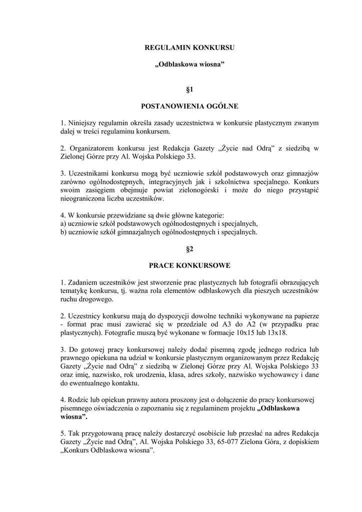 REGULAMIN KONKURSU „Odblaskowa wiosna” §1 POSTANOWIENIA OGÓLNE 1. Niniejszy regulamin określa zasady uczestnictwa w konkursie plastycznym zwanym dalej w treści regulaminu konkursem. 2. Organizatorem konkursu jest Redakcja Gazety „Życie nad Odrą” z siedzibą w Zielonej Górze przy Al. Wojska Polskiego 33. 3. Uczestnikami konkursu mogą być uczniowie szkół podstawowych oraz gimnazjów zarówno ogólnodostępnych, integracyjnych jak i szkolnictwa specjalnego. Konkurs swoim zasięgiem obejmuje powiat zielonogórski i może do niego przystąpić nieograniczona liczba uczestników. 4. W konkursie przewidziane są dwie główne kategorie: a) uczniowie szkół podstawowych ogólnodostępnych i specjalnych, b) uczniowie szkół gimnazjalnych ogólnodostępnych i specjalnych. §2 PRACE KONKURSOWE 1. Zadaniem uczestników jest stworzenie prac plastycznych lub fotografii obrazujących tematykę konkursu, tj. ważna rola elementów odblaskowych dla pieszych uczestników ruchu drogowego. 2. Uczestnicy konkursu mają do dyspozycji dowolne techniki wykonywane na papierze - format prac musi zawierać się w przedziale od A3 do A2 (w przypadku prac plastycznych). Fotografie muszą być wykonane w formacje 10x15 lub 13x18. 3. Do gotowej pracy konkursowej należy dodać pisemną zgodę jednego rodzica lub prawnego opiekuna na udział w konkursie plastycznym organizowanym przez Redakcję Gazety „Życie nad Odrą” z siedzibą w Zielonej Górze przy Al. Wojska Polskiego 33 oraz imię, nazwisko, rok urodzenia, klasa, adres szkoły, nazwisko wychowawcy i dane do ewentualnego kontaktu. 4. Rodzic lub opiekun prawny autora proszony jest o dołączenie do pracy konkursowej pisemnego oświadczenia o zapoznaniu się z regulaminem projektu „Odblaskowa wiosna”. 5. Tak przygotowaną pracę należy dostarczyć osobiście lub przesłać na adres Redakcja Gazety „Życie nad Odrą”, Al. Wojska Polskiego 33, 65-077 Zielona Góra, z dopiskiem „Konkurs Odblaskowa wiosna”. 6. Termin nadsyłania prac mija 8 maja 2015 roku. Po tym terminie zgłoszenia nie będą przyjmowane. 7. Prace muszą być wykonane samodzielnie. §3 ZASADY PRZYZNAWANIA NAGRÓD 1. W każdej kategorii przyznawanych będzie 5 nagród. 2. Nadesłane prace zostaną ocenione przez komisję powołaną przez organizatora konkursu w skład, której wejdą m.in. przedstawiciele mediów i partnerzy organizatora. 3. Ogłoszenie wyników konkursu nastąpi 11 maja 2015 roku na stronie internetowej miesięcznika „Życie nad Odrą” www.zycienadodra.pl, oraz na stronie naszej gazety na portalu Facebook – www.fb.com/zycienadodra. Wyniki zostaną również wydrukowane w majowym numerze gazety „Życie nad Odrą”. 4. Najlepsze prace zostaną opublikowane na stronie internetowej miesięcznika „Życie nad Odrą” oraz na stronie naszej gazety na portalu Facebook – www.fb.com/zycienadodra. Prace zostaną również wydrukowane w majowym numerze gazety „Życie nad Odrą”. §4 OCHRONA WŁASNOŚCI INTELEKTUALNEJ 1.Uczestnik przystępujący do konkursu zobowiązuje się nie nadsyłać materiałów, które naruszają prawa do wizerunku i prawa autorskie osób trzecich. W przeciwnym razie ponosi pełną i wyłączną odpowiedzialność wobec osób, których prawa naruszył. 2. W wypadku nadesłania przez uczestnika materiałów, co do których wystąpi podejrzenie naruszenia prawa ochrony własności intelektualnej (np. plagiat), jego udział w konkursie zostaje zawieszony do czasu jednoznacznego wyjaśnienia zaistniałej sytuacji przez organizatora. §5 OCHRONA DANYCH OSOBOWYCH 1. Wszystkie dane osobowe są zbierane, przetwarzane i udostępniane na zasadach zgodnych z obowiązującym w Rzeczpospolitej Polskiej prawem. 2. Administratorem danych osobowych zbieranych podczas realizacji projektu jest Redakcja Gazety „Życie nad Odrą”. 3. Uczestnik konkursu podaje swoje dane osobowe dobrowolnie. 4. Uczestnik konkursu wyraża zgodę na przetwarzanie przez Redakcję Gazety „Życie nad Odrą” swych danych osobowych udostępnianych podczas realizacji projektu w celach komunikacyjnych, historycznych, naukowych, dydaktycznych i statystycznych. 5. Uczestnik konkursu wyraża zgodę na rozpowszechnienie przez Redakcję Gazety „Życie nad Odrą” swych danych w zakresie: imię, nazwisko, nazwa i adres szkoły, w której się uczy, w celu ogłoszenia wyników konkursu. 6. Na zasadach przewidzianych przepisami ustawy o ochronie danych osobowych z dnia 29 sierpnia 1997 roku użytkownik ma prawo dostępu do swoich danych, ich poprawiania oraz żądania zaprzestania ich przetwarzania. 7. Żądanie zaprzestania przetwarzania danych jest równoznaczne z rezygnacją z udziału w konkursie. §6 POSTANOWIENIA KOŃCOWE 1. Wszelkie pytania prosimy kierować na adres pocztowy Redakcja Gazety „Życie nad Odrą”, Al. Wojska Polskiego 33, 65-077 Zielona Góra z dopiskiem „Konkurs Odblaskowa wiosna” lub mailowo na adres [email protected] 2. Redakcja Gazety „Życie nad Odrą” zastrzega sobie prawo do wprowadzania zmian w niniejszym regulaminie. Wszelkie zmiany stają się obowiązujące w momencie powiadomienia uczestników Konkursu poprzez przesłanie informacji o zmianie za pośrednictwem poczty elektronicznej oraz po opublikowaniu zmian w regulaminie na stronie internetowej naszego miesięcznika. 3. Organizator nie ponosi odpowiedzialności za opóźnienia wynikające z realizacji usług pocztowych bądź kurierskich, z których korzystać będą uczestnicy konkursu. 4. Organizator nie ponosi również odpowiedzialności za działania osób trzecich związanych z organizacją konkursu oraz za szkody spowodowane podaniem błędnych lub nieaktualnych danych przez uczestników 5. W sprawach nieuregulowanych w Regulaminie zastosowanie mają przepisy prawa polskiego.