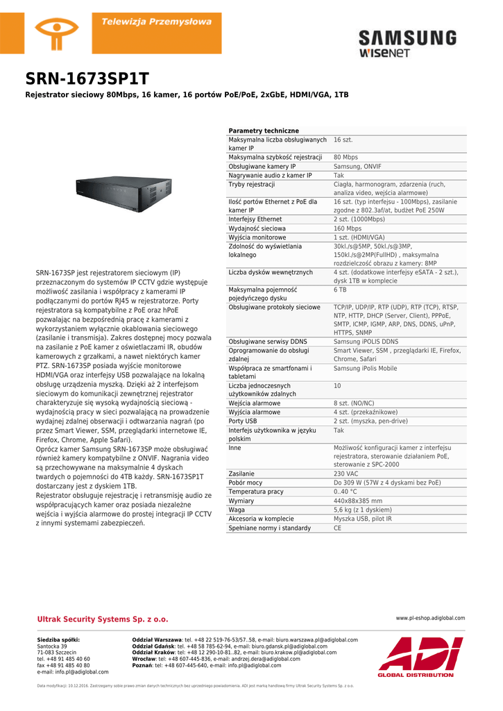 SRN-1673SP1T Rejestrator sieciowy 80Mbps, 16 kamer, 16 portów PoE/PoE, 2xGbE, HDMI/VGA, 1TB Parametry techniczne Maksymalna liczba obsługiwanych kamer IP Maksymalna szybkość rejestracji Obsługiwane kamery IP Nagrywanie audio z kamer IP Tryby rejestracji Ilość portów Ethernet z PoE dla kamer IP Interfejsy Ethernet Wydajność sieciowa Wyjścia monitorowe Zdolność do wyświetlania lokalnego SRN-1673SP jest rejestratorem sieciowym (IP) przeznaczonym do systemów IP CCTV gdzie występuje możliwość zasilania i współpracy z kamerami IP podłączanymi do portów RJ45 w rejestratorze. Porty rejestratora są kompatybilne z PoE oraz hPoE pozwalając na bezpośrednią pracę z kamerami z wykorzystaniem wyłącznie okablowania sieciowego (zasilanie i transmisja). Zakres dostępnej mocy pozwala na zasilanie z PoE kamer z oświetlaczami IR, obudów kamerowych z grzałkami, a nawet niektórych kamer PTZ. SRN-1673SP posiada wyjście monitorowe HDMI/VGA oraz interfejsy USB pozwalające na lokalną obsługę urządzenia myszką. Dzięki aż 2 interfejsom sieciowym do komunikacji zewnętrznej rejestrator charakteryzuje się wysoką wydajnością sieciową wydajnością pracy w sieci pozwalającą na prowadzenie wydajnej zdalnej obserwacji i odtwarzania nagrań (po przez Smart Viewer, SSM, przeglądarki internetowe IE, Firefox, Chrome, Apple Safari). Oprócz kamer Samsung SRN-1673SP może obsługiwać również kamery kompatybilne z ONVIF. Nagrania video są przechowywane na maksymalnie 4 dyskach twardych o pojemności do 4TB każdy. SRN-1673SP1T dostarczany jest z dyskiem 1TB. Rejestrator obsługuje rejestrację i retransmisję audio ze współpracujących kamer oraz posiada niezależne wejścia i wyjścia alarmowe do prostej integracji IP CCTV z innymi systemami zabezpieczeń. Liczba dysków wewnętrznych Maksymalna pojemność pojedyńczego dysku Obsługiwane protokoły sieciowe Obsługiwane serwisy DDNS Oprogramowanie do obsługi zdalnej Współpraca ze smartfonami i tabletami Liczba jednoczesnych użytkowników zdalnych Wejścia alarmowe Wyjścia alarmowe Porty USB Interfejs użytkownika w języku polskim Inne Zasilanie Pobór mocy Temperatura pracy Wymiary Waga Akcesoria w komplecie Spełniane normy i standardy 16 szt. 80 Mbps Samsung, ONVIF Tak Ciagła, harmonogram, zdarzenia (ruch, analiza video, wejścia alarmowe) 16 szt. (typ interfejsu - 100Mbps), zasilanie zgodne z 802.3af/at, budżet PoE 250W 2 szt. (1000Mbps) 160 Mbps 1 szt. (HDMI/VGA) 30kl./s@5MP, 50kl./s@3MP, 150kl./s@2MP(FullHD) , maksymalna rozdzielczość obrazu z kamery: 8MP 4 szt. (dodatkowe interfejsy eSATA - 2 szt.), dysk 1TB w komplecie 6 TB TCP/IP, UDP/IP, RTP (UDP), RTP (TCP), RTSP, NTP, HTTP, DHCP (Server, Client), PPPoE, SMTP, ICMP, IGMP, ARP, DNS, DDNS, uPnP, HTTPS, SNMP Samsung iPOLIS DDNS Smart Viewer, SSM , przeglądarki IE, Firefox, Chrome, Safari Samsung iPolis Mobile 10 8 szt. (NO/NC) 4 szt. (przekaźnikowe) 2 szt. (myszka, pen-drive) Tak Możliwość konfiguracji kamer z interfejsu rejestratora, sterowanie działaniem PoE, sterowanie z SPC-2000 230 VAC Do 309 W (57W z 4 dyskami bez PoE) 0..40 °C 440x88x385 mm 5,6 kg (z 1 dyskiem) Myszka USB, pilot IR CE Ultrak Security Systems Sp. z o.o. Siedziba spółki: Santocka 39 71-083 Szczecin tel. +48 91 485 40 60 fax +48 91 485 40 80 e-mail: [email protected] Oddział Warszawa: tel. +48 22 519-76-53/57..58, e-mail: [email protected] Oddział Gdańsk: tel. +48 58 785-62-94, e-mail: [email protected] Oddział Kraków: tel: +48 12 290-10-81..82, e-mail: [email protected] Wrocław: tel: +48 607-445-836, e-mail: [email protected] Poznań: tel: +48 607-445-640, e-mail: [email protected] Data modyfikacji: 10.12.2016. Zastrzegamy sobie prawo zmian danych technicznych bez uprzedniego powiadomienia. ADI jest marką handlową firmy Ultrak Security Systems Sp. z o.o. www.pl-eshop.adiglobal.com