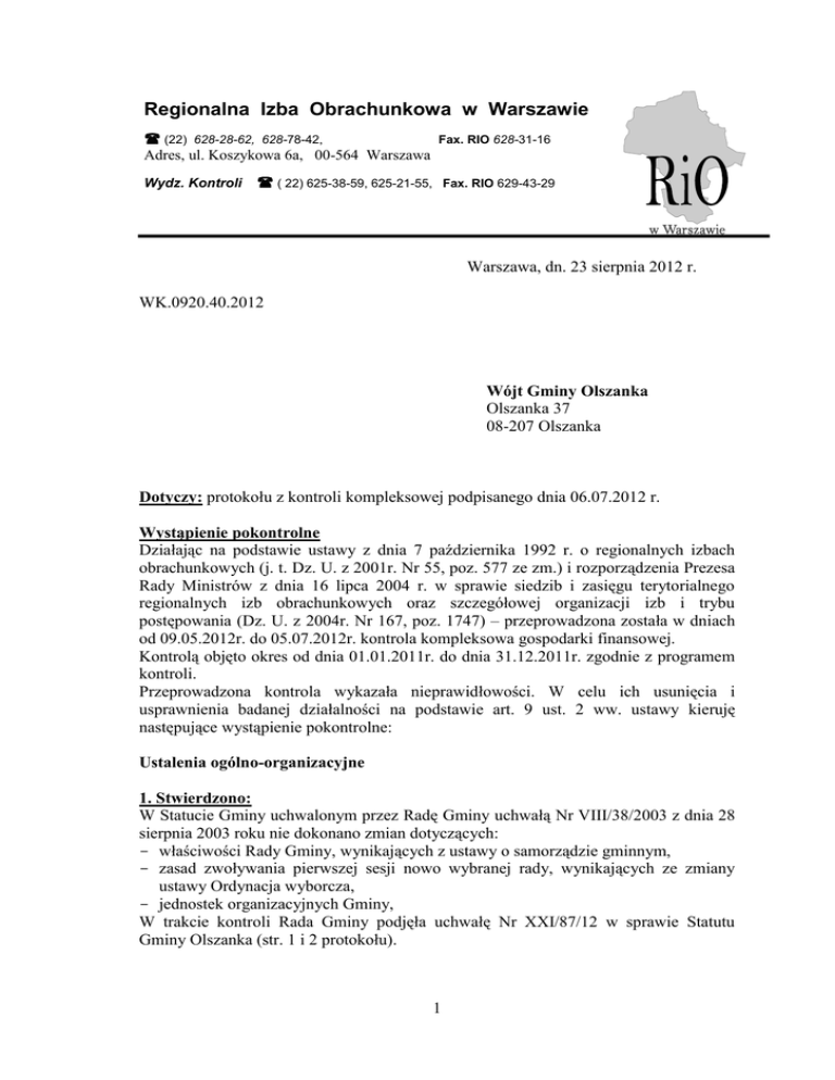 Regionalna Izba Obrachunkowa w Warszawie (22) 628-28-62, 628-78-42, Fax. RIO 628-31-16 Adres, ul. Koszykowa 6a, 00-564 Warszawa Wydz. Kontroli ( 22) 625-38-59, 625-21-55, Fax. RIO 629-43-29 Warszawa, dn. 23 sierpnia 2012 r. WK.0920.40.2012 Wójt Gminy Olszanka Olszanka 37 08-207 Olszanka Dotyczy: protokołu z kontroli kompleksowej podpisanego dnia 06.07.2012 r. Wystąpienie pokontrolne Działając na podstawie ustawy z dnia 7 października 1992 r. o regionalnych izbach obrachunkowych (j. t. Dz. U. z 2001r. Nr 55, poz. 577 ze zm.) i rozporządzenia Prezesa Rady Ministrów z dnia 16 lipca 2004 r. w sprawie siedzib i zasięgu terytorialnego regionalnych izb obrachunkowych oraz szczegółowej organizacji izb i trybu postępowania (Dz. U. z 2004r. Nr 167, poz. 1747) – przeprowadzona została w dniach od 09.05.2012r. do 05.07.2012r. kontrola kompleksowa gospodarki finansowej. Kontrolą objęto okres od dnia 01.01.2011r. do dnia 31.12.2011r. zgodnie z programem kontroli. Przeprowadzona kontrola wykazała nieprawidłowości. W celu ich usunięcia i usprawnienia badanej działalności na podstawie art. 9 ust. 2 ww. ustawy kieruję następujące wystąpienie pokontrolne: Ustalenia ogólno-organizacyjne 1. Stwierdzono: W Statucie Gminy uchwalonym przez Radę Gminy uchwałą Nr VIII/38/2003 z dnia 28 sierpnia 2003 roku nie dokonano zmian dotyczących: - właściwości Rady Gminy, wynikających z ustawy o samorządzie gminnym, - zasad zwoływania pierwszej sesji nowo wybranej rady, wynikających ze zmiany ustawy Ordynacja wyborcza, - jednostek organizacyjnych Gminy, W trakcie kontroli Rada Gminy podjęła uchwałę Nr XXI/87/12 w sprawie Statutu Gminy Olszanka (str. 1 i 2 protokołu). 1 Wnioskuję: W przyszłości stosownie do zmian wynikających z nowelizacji ustawy z dnia 8 marca 1990 roku o samorządzie gminnym (tekst jednolity: Dz. U. z 2001r. Nr 142, poz. 1591 z późn. zm.) oraz innych ustaw przedkładać Radzie Gminy Olszanka projekty uchwał dotyczących aktualizacji Statutu Gminy. 2. Stwierdzono: Uchwała Rady Gminy Olszanka z dnia 31 marca 2011r. w sprawie nie wyrażenia zgody na wyodrębnienie w budżecie gminy środków stanowiących fundusz sołecki została przekazana do Regionalnej Izby Obrachunkowej w Warszawie Zespół w Siedlcach dopiero w wyniku kontroli, tj. w dniu 11 maja 2012 roku (str. 3 i 4 protokołu). Wnioskuję: Podjęte przez Radę Gminy uchwały, objęte nadzorem Regionalnej Izby Obrachunkowej przekazywać do organu nadzoru w terminie 7 dni od daty podjęcia uchwały zgodnie z art. 90 ust. 2 wyżej cytowanej ustawy o samorządzie gminnym. Księgowość i sprawozdawczość 3. Stwierdzono W zakresie gospodarki kasowej: - W wyniku kontroli kasy w Urzędzie Gminy Olszanka ujawniono nadwyżkę w kwocie 483,93 zł. Nadwyżkę kasową stanowiły nie wypłacone należności ze zbiorczej listy płac- zwrot podatku akcyzowego zawartego w cenie oleju napędowego rozchodowanego w raporcie kasowym Nr 8/2012 z dnia 26.04.2012 roku (str. 6 protokołu). - Wypłaty gotówki z tytułu podatku akcyzowego w łącznej kwocie 46.587,00 zł ujęto w raporcie kasowym pod datą 24.05.2011 roku, natomiast rozchodowanie powyższej kwoty następowało w miesiącach: czerwiec, sierpień, wrzesień i październik (str. 6 i 7 protokołu ). Wnioskuję: Gotówkę do wypłaty z list płac oraz pobranych rachunków lub faktur przechowywać w kasie w okresie nieprzekraczającym 10 dni. Po tym czasie niewypłacone kwoty wysłać przekazem pocztowym na adres zamieszkania odbiorcy lub odprowadzić do banku na konto depozytowe zgodnie z pkt 4– dział pn. „Wpłaty i wypłaty kasowe” ppkt 6 Instrukcji Kasowej stanowiącej załącznik nr 7 do zarządzenia Nr 25/10 Wójta Gminy Olszanka z dnia 25 października 2010r. w sprawie wprowadzenia zasad (polityki) rachunkowości. 4. Stwierdzono: Raporty kasowe nr 9/2011, nr 10/2011, nr 11/2011, nr 12/2011 nie zostały sprawdzone pod kątem prawidłowości ich sporządzenia, a w szczególności ustalenia czy wykazane w nich przez kasjera poszczególne wpłaty i wypłaty są udokumentowane dowodami kasowymi oraz czy ustalono w sposób prawidłowy stan gotówki (str. 7 i 8 protokołu). Wnioskuję: Po sporządzeniu i podpisaniu raportu kasowego przez kasjera przekazać go wraz z dowodami kasowymi wyznaczonemu pracownikowi w Referacie Budżetu i Finansów, celem sprawdzenia prawidłowości jego sporządzenia do czego zobowiązuje pkt. 4 –pn. „Ewidencja obrotów kasowych w raporcie kasowym” ppkt 9 Instrukcji kasowej stanowiącej załącznik nr 7 do zarządzenia Nr 25/10 Wójta Gminy Olszanka z dnia 25 października 2010 r w sprawie wprowadzenia zasad (polityki) rachunkowości. 2 5. Stwierdzono Brak zgodności danych wykazanych w sprawozdaniu Rb - 28S z wykonania planu wydatków budżetowych Urzędu Gminy jako jednostki budżetowej za okres od początku roku do 31.12.2011 roku, a ewidencją księgową konta 130-2 - „Rachunek bieżący jednostek budżetowych” według podziałek klasyfikacji budżetowej. Różnica wyniosła kwotę 474.635,09 zł (str. od 14 do 18 protokołu). Wnioskuję: Sprawozdanie budżetowe Rb - 28 S z wykonania planu wydatków budżetowych Urzędu Gminy jako jednostki budżetowej za okres od początku roku do końca danego roku sporządzać w oparciu o ewidencją księgową zgodnie z § 9 ust. 2 rozporządzenia Ministra Finansów z dnia 3 lutego 2010 roku w sprawie sprawozdawczości budżetowej (Dz. U. Nr 20, poz. 103). Zgodnie z § 8 ust 2 pkt. 3 załącznika Nr 39 do rozporządzenia w sprawie sprawozdawczości budżetowej w kolumnie wydatki wykonane należy wykazywać zrealizowane wydatki na podstawie danych księgowości analitycznej do rachunku bieżącego. 6. Stwierdzono: Na koncie 130-2 „ Rachunek bieżący jednostki”- subkonto wydatków, dokonano błędnych księgowań dotyczących: -zwrotu dochodów z tytułu dotacji w kwocie (-2 339,81 zł), - zwrotu wydatków potraktowanych w momencie wpływu na rachunek jako dochód w kwocie (-