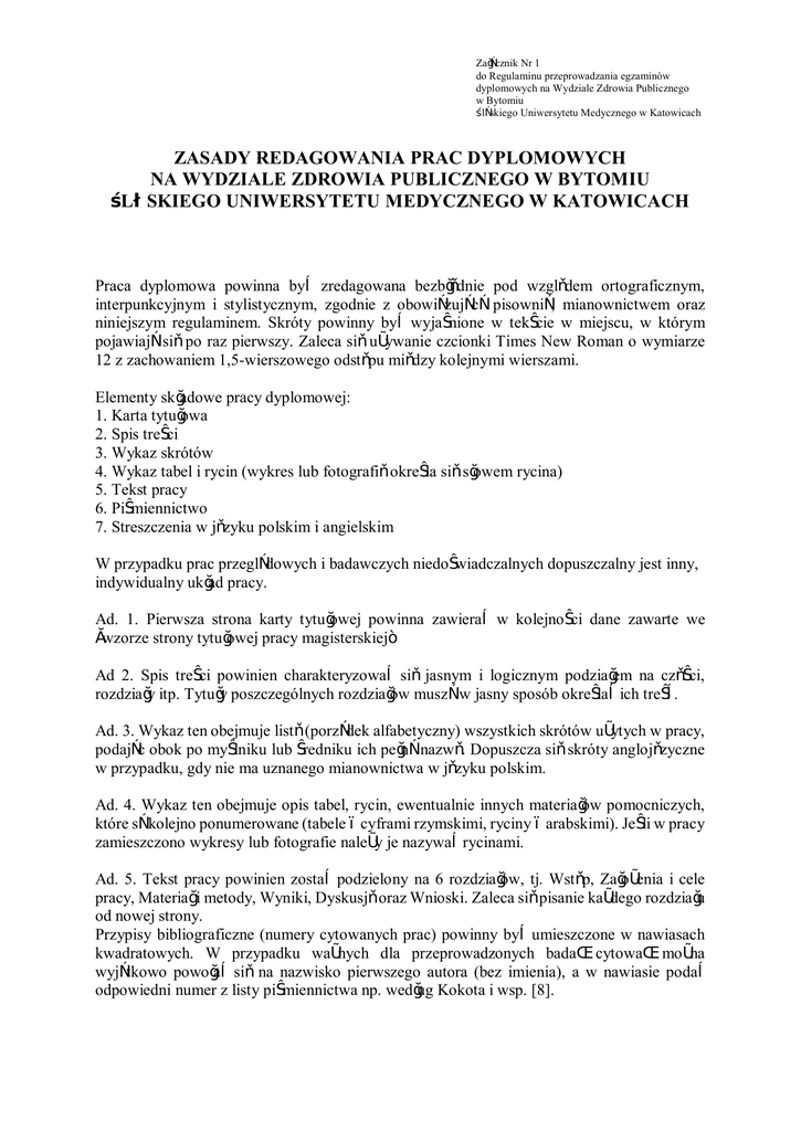 Załącznik Nr 1 do Regulaminu przeprowadzania egzaminów dyplomowych na Wydziale Zdrowia Publicznego w Bytomiu Śląskiego Uniwersytetu Medycznego w Katowicach ZASADY REDAGOWANIA PRAC DYPLOMOWYCH NA WYDZIALE ZDROWIA PUBLICZNEGO W BYTOMIU ŚLĄSKIEGO UNIWERSYTETU MEDYCZNEGO W KATOWICACH Praca dyplomowa powinna być zredagowana bezbłędnie pod względem ortograficznym, interpunkcyjnym i stylistycznym, zgodnie z obowiązującą pisownią, mianownictwem oraz niniejszym regulaminem. Skróty powinny być wyjaśnione w tekście w miejscu, w którym pojawiają się po raz pierwszy. Zaleca się używanie czcionki Times New Roman o wymiarze 12 z zachowaniem 1,5-wierszowego odstępu między kolejnymi wierszami. Elementy składowe pracy dyplomowej: 1. Karta tytułowa 2. Spis treści 3. Wykaz skrótów 4. Wykaz tabel i rycin (wykres lub fotografię określa się słowem rycina) 5. Tekst pracy 6. Piśmiennictwo 7. Streszczenia w języku polskim i angielskim W przypadku prac przeglądowych i badawczych niedoświadczalnych dopuszczalny jest inny, indywidualny układ pracy. Ad. 1. Pierwsza strona karty tytułowej powinna zawierać w kolejności dane zawarte we „wzorze strony tytułowej pracy magisterskiej” Ad 2. Spis treści powinien charakteryzować się jasnym i logicznym podziałem na części, rozdziały itp. Tytuły poszczególnych rozdziałów muszą w jasny sposób określać ich treść. Ad. 3. Wykaz ten obejmuje listę (porządek alfabetyczny) wszystkich skrótów użytych w pracy, podając obok po myślniku lub średniku ich pełną nazwę. Dopuszcza się skróty anglojęzyczne w przypadku, gdy nie ma uznanego mianownictwa w języku polskim. Ad. 4. Wykaz ten obejmuje opis tabel, rycin, ewentualnie innych materiałów pomocniczych, które są kolejno ponumerowane (tabele – cyframi rzymskimi, ryciny – arabskimi). Jeśli w pracy zamieszczono wykresy lub fotografie należy je nazywać rycinami. Ad. 5. Tekst pracy powinien zostać podzielony na 6 rozdziałów, tj. Wstęp, Założenia i cele pracy, Materiał i metody, Wyniki, Dyskusję oraz Wnioski. Zaleca się pisanie każdego rozdziału od nowej strony. Przypisy bibliograficzne (numery cytowanych prac) powinny być umieszczone w nawiasach kwadratowych. W przypadku ważnych dla przeprowadzonych badań cytowań można wyjątkowo powołać się na nazwisko pierwszego autora (bez imienia), a w nawiasie podać odpowiedni numer z listy piśmiennictwa np. według Kokota i wsp. [8]. Jeśli publikuje się ryciny lub tabele pochodzące z innych prac (także z Internetu), to należy uzyskać pisemną zgodę autora (autorów) na ich publikacje. We wprowadzeniu („Wstęp”) muszą znajdować się najważniejsze informacje dotyczące aktualnego stanu wiedzy na temat badanego problemu. W rozdziale „Założenia i cele pracy” należy w zwięzłej formie określić hipotezę badawczą, cel pracy oraz wymienić najważniejsza pytania, na które mają odpowiedzieć zaplanowane badania. W części „Materiał i metody” powinny się znaleźć wyczerpujące informacje o liczbie osób/zwierząt laboratoryjnych biorących udział w badaniach (w przypadku prac badawczych). Należy przedstawić demograficzną charakterystyką badanych (np. wiek, płeć) oraz określić kryteria włączenia i wyłączenia do/z badań. Należy podać informację o zatwierdzeniu projektu pracy przez odpowiednią komisję etyczną/bioetyczną, jeśli są takie wymogi prawne. Dokładność opisu powinna umożliwiać ewentualne odtworzenie doświadczeń. Opis metod stosowanych przez innych autorów powinien zostać opatrzony odpowiednim odnośnikiem literaturowym. Stosowane leki i inne substancje chemiczne powinny zostać precyzyjnie określone, łącznie z nazwą generyczną, dawką i drogą podania. Opis metod analizy statystycznej powinien być na tyle dokładny, by można było zweryfikować wyniki obliczeń i ich moc statystyczną. Wyniki powinny być przedstawiane w tabelach i na rycinach w logicznej kolejności. Należy zadbać o to, by numeracja tabel i rycin była obecna w tekście. Pomiary długości, wysokości, masy ciała i objętości należy wyrażać w jednostkach metrycznych (metry, kilogramy, litry) lub ich przelicznikach dziesiętnych. Temperaturę należy wyrażać w stopniach Celsjusza, a ciśnienie krwi w milimetrach słupa rtęci. Wszystkie wartości wyrażające stężenia związków chemicznych muszą być podane w jednostkach systemu SI (International System of Units). Wartości wyrażone w jednostkach alternatywnych i nienależących do układu SI można podać w nawiasie. Nie należy przedstawiać tych samych danych jednocześnie w tabelach i na rycinach. Nie należy opisywać całej zawartości tabel, szczególnie, jeśli dane nie mają istotnego znaczenia dla wniosków płynących z pracy. Tabele i ryciny muszą być tak opisane, aby bez uciekania się do tekstu pracy, łatwo było zrozumieć ich treść. W tym celu należy stosować w przypadku tabel tytuł (nad tabelą) oraz legendę (pod tabelą), a w przypadku rycin – tytuł i objaśnienia/legendę (pod ryciną). Zaleca się umieszczanie tabel i rycin w pobliżu informacji tekstowych na ich temat. W części „Dyskusja” (omówienie wyników) należy skoncentrować się na nowych i/lub ważnych aspektach pracy. Należy unikać powtarzania fragmentów tekstu, obecnych w rozdziale „Wyniki”. Dyskusja służy konfrontowaniu własnych wyników z wynikami uzyskanymi przez innych badaczy. Należy przedstawić interpretację własnych wyników oraz wytłumaczyć źródła ewentualnych różnic między wynikami własnych i innych badań Dyskusja powinna zawierać część poświęconą praktycznym implikacjom publikacji, jak również przedstawieniu zalet i ograniczeń własnej pracy. Wnioski muszą w sposób bezpośredni wiązać się z celem pracy. Powinny one stanowić próbę formułowania nowych hipotez/praktycznych zaleceń. Należy bezwzględnie unikać dosłownego powtarzania danych przed