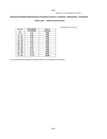 Sheet1 Załącznik nr 4 do zarządzenia nr 35/2011 Promocja do biletów jednorazowych normalnych na linii nr 7 Rzeszów – Kolbuszowa – Tarnobrzeg Tabela opłat - biletów jednorazowych Obowiązuje od 01.01.2012 Odległość Km 0 -3 Cena biletu 2,30 2,00 >3–5 6 – 10 11 – 15 16 – 20 21 – 25 26 – 30 31 – 35 36 – 40 41 – 50 51 – 60 61 – 70 71 – 80 2,90 3,90 4,70 5,50 6,20 7,00 7,70 8,60 9,70 10,90 12,10 13,40 2,50 3,00 3,50 4,00 5,00 5,00 5,00 7,00 8,00 9,00 9,00 10,00 normalnego Cena w promocji Ceny promocyjne dotyczą wyłacznie biletów normalnych i nie sumują się z innymi ulgami Page 1