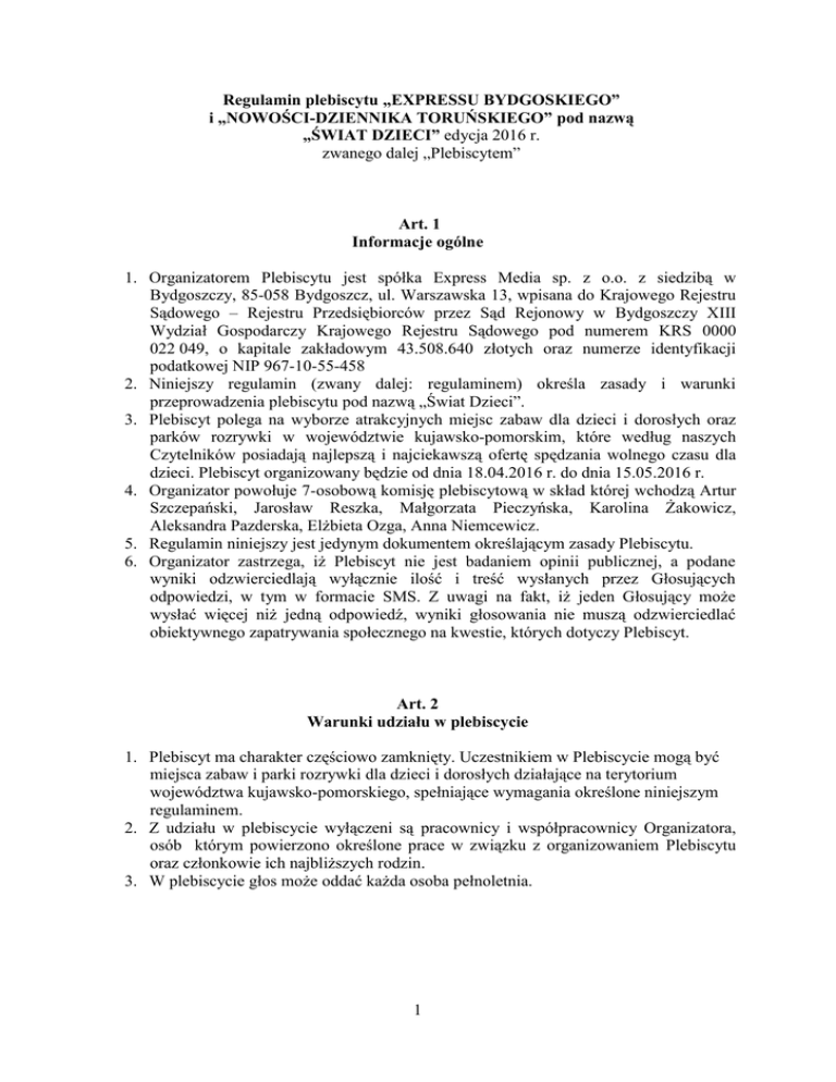 Regulamin plebiscytu „EXPRESSU BYDGOSKIEGO” i „NOWOŚCI-DZIENNIKA TORUŃSKIEGO” pod nazwą „ŚWIAT DZIECI” edycja 2016 r. zwanego dalej „Plebiscytem” Art. 1 Informacje ogólne 1. Organizatorem Plebiscytu jest spółka Express Media sp. z o.o. z siedzibą w Bydgoszczy, 85-058 Bydgoszcz, ul. Warszawska 13, wpisana do Krajowego Rejestru Sądowego – Rejestru Przedsiębiorców przez Sąd Rejonowy w Bydgoszczy XIII Wydział Gospodarczy Krajowego Rejestru Sądowego pod numerem KRS 0000 022 049, o kapitale zakładowym 43.508.640 złotych oraz numerze identyfikacji podatkowej NIP 967-10-55-458 2. Niniejszy regulamin (zwany dalej: regulaminem) określa zasady i warunki przeprowadzenia plebiscytu pod nazwą „Świat Dzieci”. 3. Plebiscyt polega na wyborze atrakcyjnych miejsc zabaw dla dzieci i dorosłych oraz parków rozrywki w województwie kujawsko-pomorskim, które według naszych Czytelników posiadają najlepszą i najciekawszą ofertę spędzania wolnego czasu dla dzieci. Plebiscyt organizowany będzie od dnia 18.04.2016 r. do dnia 15.05.2016 r. 4. Organizator powołuje 7-osobową komisję plebiscytową w skład której wchodzą Artur Szczepański, Jarosław Reszka, Małgorzata Pieczyńska, Karolina Żakowicz, Aleksandra Pazderska, Elżbieta Ozga, Anna Niemcewicz. 5. Regulamin niniejszy jest jedynym dokumentem określającym zasady Plebiscytu. 6. Organizator zastrzega, iż Plebiscyt nie jest badaniem opinii publicznej, a podane wyniki odzwierciedlają wyłącznie ilość i treść wysłanych przez Głosujących odpowiedzi, w tym w formacie SMS. Z uwagi na fakt, iż jeden Głosujący może wysłać więcej niż jedną odpowiedź, wyniki głosowania nie muszą odzwierciedlać obiektywnego zapatrywania społecznego na kwestie, których dotyczy Plebiscyt. Art. 2 Warunki udziału w plebiscycie 1. Plebiscyt ma charakter częściowo zamknięty. Uczestnikiem w Plebiscycie mogą być miejsca zabaw i parki rozrywki dla dzieci i dorosłych działające na terytorium województwa kujawsko-pomorskiego, spełniające wymagania określone niniejszym regulaminem. 2. Z udziału w plebiscycie wyłączeni są pracownicy i współpracownicy Organizatora, osób którym powierzono określone prace w związku z organizowaniem Plebiscytu oraz członkowie ich najbliższych rodzin. 3. W plebiscycie głos może oddać każda osoba pełnoletnia. 1 Art. 3 Zasady przeprowadzania Plebiscytu I. Zgłaszanie kandydatur 1. Plebiscyt będzie się odbywał w dniach od 18.04.2016 od godz. 00:01 do 15.05.2016 r. do godz. 23:59 . Zgłoszenia kandydatów będą przyjmowane od 18.04.2016 r. od godz. 00:01 do 24.04.2016 r. do godz. 23:59. 2. Zgłoszenie powinno zawierać: a. Nazwę zgłaszanego miejsca zabaw lub parku rozrywki b. Adres zgłaszanego miejsca. 3. Zgłoszenia można dokonać: a. Za pomocą wysłania SMS-a Premium pod numerem telefonu 7148 (koszt SMS-a to 1,23 zł z VAT) od dnia 18.04.2016 r. do dnia 24.04.2016 roku. W treści SMS-a należy wpisać: SD.nazwa i adres centrum zabaw lub parku rozrywki b. Zgłoszenia może również dokonać Komisja Plebiscytowa. 4. Organizator zastrzega sobie prawo do weryfikacji zgłoszeń pod kątem ich zgodności z regulaminem, w szczególności weryfikacji zgłoszeń w zakresie ich zgodności z treścią pkt. 2 niniejszego artykułu oraz prawem. Zgłoszenia zweryfikowane negatywnie oznaczać będą, że kandydatura nie została dołączona do listy kandydatów o czym zgłaszający zostanie poinformowany niezwłocznie przez Organizatora na podane dane kontaktowe z informacją o przyczynach negatywnej weryfikacji. W przypadku prawidłowo dokonanego zgłoszenia kandydatura zostanie od dnia 27.04.2016 r. dołączona do listy kandydatów. W przypadku zgłoszenia zweryfikowanego negatywnie można dokonać ponownego poprawnego zgłoszenia zawierającego poprawne dane lub zgłosić do Organizatora reklamację na zasadach określonych w art. 6. 5. W dniu 27.04.2016 r. na stronach internetowych www.express.bydgoski.pl i www.nowosci.com.pl oraz na łamach „Expressu Bydgoskiego” i „Nowości-Dziennika Toruńskiego” zostanie opublikowana lista zweryfikowanych kandydatur do udziału w Plebiscycie. II. Głosowanie 1. Głosowanie odbywać się będzie za pomocą SMS Premium i będzie trwało od 27.04.2016 r. od godz. 00:01 do 15.05.2016 r. do godz.23:59 na następujących warunkach.: a. głosując za pośrednictwem SMS Premium uczestnik otrzymuje kod na e-wydanie „Expressu Bydgoskiego” lub „Nowości-Dziennika Toruńskiego (dalej jako „ewydanie”). Nabycie e-wydania następuje zgodnie z treścią regulaminu dostępnego pod adresem www.ekiosk.media.pl. Głosujący za pomocą SMS Premium oświadcza jednocześnie że zapoznał się z tym regulaminem i akceptuje jego treść; b. głosowania SMS dokonuje się poprzez przesłanie SMS pod numerem 7148 w treści wpisując: SD.numer prefiksu przypisany do wybranego kandydata c. w odpowiedzi na SMS, poza zaliczeniem głosu, uczestnik otrzymuje również kod dostępu do e-wydania; 2 d. koszt wysłania SMS-a do 160 znaków (bez znaków specjalnych) wynosi 1,23 zł z VAT (1 zł + VAT); e. jeden wysłany SMS to 1 głos w Plebiscycie na daną kandydaturę ; f. uczestnik Plebiscytu może oddać dowolną liczbę głosów i tym samym uzyskać dostęp do dowolnej ilości e-wydań, przy czym każdorazowe kolejne wysłanie SMS pod numer 7148 powoduje ponowne pobranie opłaty w wysokości 1,23 zł brutto; g. w obliczeniu wyników Plebiscytu biorą udział te ważne głosy, które wpłyną do systemu Organizatora do godziny zakończenia Plebiscytu; głosy, które wpłyną do sytemu Organizatora po zakończeniu głosowania nie zostaną uwzględnione w wynikach Plebiscytu; h. w przypadku wysłania SMS o treści która nie spełnia wymogów niniejszego regulaminu pod numer, z którego przesłano taki SMS zostanie odesłany SMS z informacją, że wiadomość nie została poprawnie rozpoznana. SMS nie spełniający wymogów regulaminu nie będzie