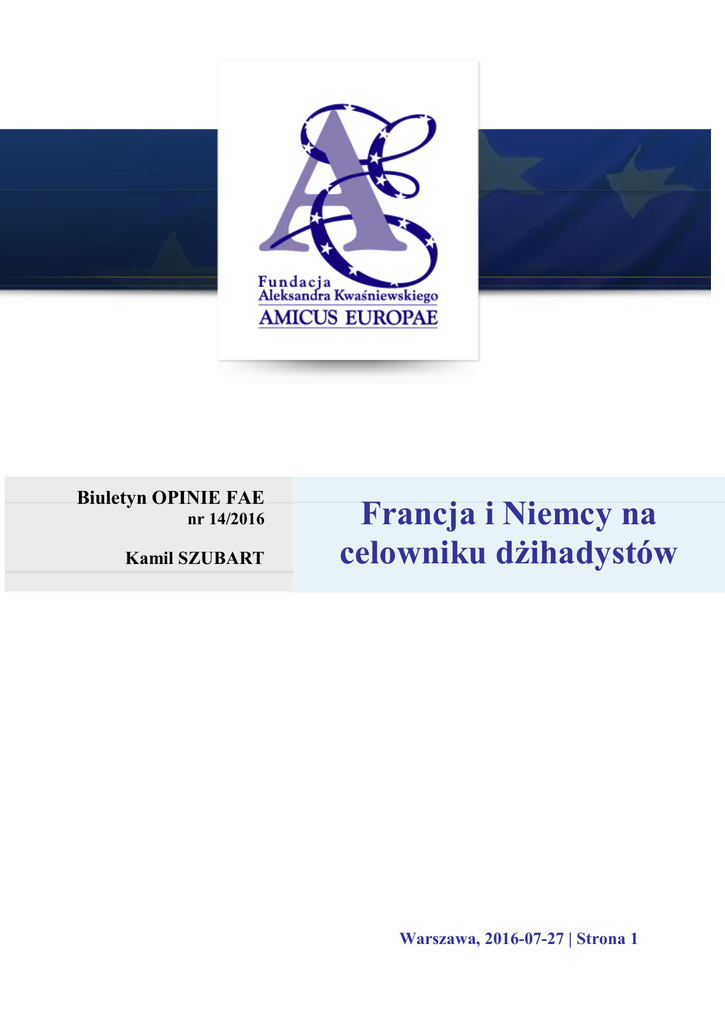 Biuletyn OPINIE FAE nr 14/2016 Kamil SZUBART Francja i Niemcy na celowniku dżihadystów Warszawa, 2016-07-27 | Strona 1 Francja i Niemcy na celowniku dżihadystów Biuletyn OPINIE FAE nr 14/2016 Kamil Szubart Zamachy terrorystyczne w Nicei, Saint-Etienne-du-Rouvray1 i dwa ataki w Bawarii2 są klasycznymi atakami przeprowadzonymi przez tzw. „samotne wilki”, osoby które nie posiadają bezpośrednich powiązań z islamskimi organizacjami terrorystycznymi, aczkolwiek działają w ich imieniu lub z ich inspiracji. Atak na południu Francji ma szczególne znaczenie, ponieważ wydarzył się w dniu święta narodowego Francji, w okresie obowiązywania stanu wyjątkowego, jak również jest to najkrwawszy atak przeprowadzony przez pojedynczego dżihadystę na Starym Kontynencie. Atak w Normandii to z kolei atak na obiekt sakralny. Z kolei dwa ataki w Niemczech z użyciem ostrych narzędzi i improwizowanego ładunku wybuchowego (IED) są pierwszymi atakami w ramach globalnego ruchu dżihadu na terytorium RFN od 2011 r. W obu przypadkach nasuwa się kilka pytań o możliwość wystąpienia kolejnych ataków. Wydarzenia we Francji i RFN inicjują kolejną publiczną debatę na temat obecnego kryzysu uchodźczego. Ma to szczególne znaczenie w kontekście RFN i coraz głośniejszej krytyki pod adresem Wilkommenskultur i kanclerz Angeli Merkel. Od „rozrywkowego życia” po zamach w Nicei W dniu 14 lipca 2016 r. 31-letni Mohamed Lahouaiej Bouhlel wykorzystując w tym celu wynajętą 19-tonową ciężarówkę marki Renault, staranował na odcinku ok. 2 kilometrów kilkaset osób, które celebrowały uliczny festyn z okazji „Święta Bastylii” na Promenadzie Anglików (Promenade des Anglais) w Nicei. W wyniku ataku śmierć poniosły 84 osoby, w tym dwie obywatelki Polski, natomiast ponad 100 osób zostało rannych. Pomimo że ataki z udziałem samochodów osobowych i dostawczych miały miejsce już w przyszłości, m.in. Atak w Saint-Etienne-du-Rouvray miał miejsce w dniu 26 lipca 2016 r. Dwóch uzbrojonych w noże napastników zaatakowało miejscowy kościół katolicki w którym odbywała się poranna msza święta. W ataku zginął 84-letni ksiądz, natomiast dwóch napastników zostało wyeliminowanych przez funkcjonariuszy jednostek RAID i BRI. Jako pierwszy głos po ataku zabrał przewodniczący stowarzyszenia muzułmanów we Francji Ramadhan Foundation Mohammed Shafiq, który określił atak jako atak na wszystkie społeczności i grupy religijne we Francji. Głos zabrała również szefa Frontu Narodowego Marie Le Pen identyfikując napastników jako członków IS. 2 W dn. 27 lipca br. w miejscowości Zirndorf na przedmieściach Norymbergi (Bawaria) doszło do eksplozji przed rządowym (federalnym) ośrodkiem dla uchodźców. W chwili redagowania niniejszej analizy nie znane były jeszcze bliższe szczegóły tego incydentu (przyp. Red.) 1 Warszawa, 2016-07-27 | Strona 2 Francja i Niemcy na celowniku dżihadystów Biuletyn OPINIE FAE nr 14/2016 Kamil Szubart w samej Francji doszło do dwóch wręcz analogicznych ataków w Dijon i Nantes 21-22 grudnia 2014 r., to atak w Nicei jest pierwszym tak krwawym. Po pierwsze, zamachowiec z Nicei w odróżnieniu od swoich poprzedników z Dijon i Nantes, którzy wykorzystali do tego celu samochód osobowy i mini-van, użył wielkogabarytowej ciężarówki, którą wjechał w bardzo duże skupisko ludzi, kontynuując swój morderczy rajd na dystansie 2 kilometrów aż do chwili zatrzymania pojazdu przez interweniujących policjantów. Funkcjonariusze, jak wykazały znalezione łuski, oddali ponad 40 strzałów w kabinę ciężarówki. Wybór celu przez napastnika nie był przypadkowy. Po pierwsze, miał gwarancję, że na deptaku znajdzie się bardzo duża liczba osób, nie tylko miejscowych, ale również turystów, co z kolei spotęguje efekt medialny i propagandowy ataku – tj. śmierć obywateli kilku lub nawet kilkunastu państw. Według informacji francuskiej policji, w czasie ataku na całym 7-kilometrowym odcinku promenady znajdowało się ponad 10 tys. osób. Po drugie, atak miał wymiar symboliczny, uderzenie w dniu najważniejszego święta państwowego Francji, symbolizującego główne wartości, na których zbudowana jest – w teorii – współczesna Francja: wolność, równość i braterstwo. Nomen omen z tych wartości korzystają licznie żyjący we Francji imigranci, przede wszystkim z byłych francuskich kolonii i terytoriów zamorskich, włączając autora zamachu w Nicei, który z pochodzenia był Tunezyjczykiem. Po trzecie, atak miał miejsce cztery dni po zakończeniu piłkarskiego EURO2016, które wymusiło zmobilizowanie przez władze potężnych sił bezpieczeństwa, łącznie z użyciem wojska w ramach operacji Sentinelle. Fakt, że cały turniej przebiegł bez żadnego poważnego incydentu, osłabił czujność francuskich służb. W dniu 21 lipca 2016 r. prokurator Paryża François Molins, który zajmował się również ubiegłorocznymi atakami w Paryżu i ekstradycją z Belgii Salaha Abdeslama, poinformował, że z zamachowcem mogły współpracować jeszcze cztery osoby. Nie przedstawił jednak żadnych konkretnych poszlak, które mogłyby potwierdzić ewentualną tezę o zorganizowaniu ataku przez jedną z francuskich komórek terrorystycznych. Dlatego też należy przyjąć tezę, że atak z Nicei jest klasycznym atakiem „samotnego wilka”, który jak wskazują wypowiedzi członków jego rodziny, w tym żony oraz sąsiadów, w bardzo krótkim Warszawa, 2016-07-27 | Strona 3 Francja i Niemcy na celowniku dżihadystów Biuletyn OPINIE FAE nr 14/2016 Kamil Szubart czasie przeszedł proces radykalizacji. W tym przypadku należy rozpatrzyć dwa możliwe źródła radykalizacji. Pierwsze z nich zakłada bezpośredni kontakt z członkami radykalnych grup islamskich (i to właśnie mogłyby być osoby, o których mówił prokurator F. Molins). Drugą możliwością jest tzw. „radykalizacja indywidualna” pod