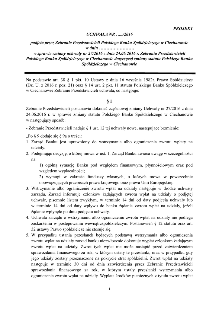 PROJEKT UCHWAŁA NR …../2016 podjęta przez Zebranie Przedstawicieli Polskiego Banku Spółdzielczego w Ciechanowie w dniu …………………… w sprawie zmiany uchwały nr 27/2016 z dnia 24.06.2016 r. Zebrania Przedstawicieli Polskiego Banku Spółdzielczego w Ciechanowie dotyczącej zmiany statutu Polskiego Banku Spółdzielczego w Ciechanowie Na podstawie art. 38 § 1 pkt. 10 Ustawy z dnia 16 września 1982r. Prawo Spółdzielcze (Dz. U. z 2016 r. poz. 21) oraz § 14 ust. 2 pkt. 11 statutu Polskiego Banku Spółdzielczego w Ciechanowie Zebranie Przedstawicieli uchwala, co następuje: §1 Zebranie Przedstawicieli postanawia dokonać częściowej zmiany Uchwały nr 27/2016 z dnia 24.06.2016 r. w sprawie zmiany statutu Polskiego Banku Spółdzielczego w Ciechanowie w następujący sposób: - Zebranie Przedstawicieli nadaje § 1 ust. 12 tej uchwały nowe, następujące brzmienie: „Po § 9 dodaje się § 9a o treści: 1. Zarząd Banku jest uprawniony do wstrzymania albo ograniczenia zwrotu wpłaty na udziały. 2. Podejmując decyzję, o której mowa w ust. 1, Zarząd Banku zwraca uwagę w szczególności na: 1) ogólną sytuację Banku pod względem finansowym, płynnościowym oraz pod względem wypłacalności; 2) wymogi w zakresie funduszy własnych, o których mowa w powszechnie obowiązujących przepisach prawa krajowego oraz prawa Unii Europejskiej. 3. Wstrzymanie albo ograniczenie zwrotu wpłat na udziały następuje w drodze uchwały zarządu. Zarząd informuje członków żądających zwrotu wpłat na udziały o podjętej uchwale, pisemnie listem zwykłym, w terminie 14 dni od daty podjęcia uchwały lub w terminie 14 dni od daty wpływu do banku żądania zwrotu wpłat na udziały, jeżeli żądanie wpłynęło po dniu podjęciu uchwały. 4. Uchwała zarządu o wstrzymaniu albo ograniczeniu zwrotu wpłat na udziały nie podlega zaskarżeniu w postępowaniu wewnątrzspółdzielczym. Postanowień § 12 statutu oraz art. 32 ustawy Prawo spółdzielcze nie stosuje się. 5. W przypadku ustania przesłanek będących podstawą wstrzymania albo ograniczenia zwrotu wpłat na udziały zarząd banku niezwłocznie dokonuje wypłat członkom żądającym zwrotu wpłat na udziały. Zwrot tych wpłat nie może nastąpić przed zatwierdzeniem sprawozdania finansowego za rok, w którym ustały te przesłanki, oraz w przypadku gdy jego udziały zostały przeznaczone na pokrycie strat spółdzielni. Zwrot wpłat na udziały następuje w terminie 30 dni od dnia zatwierdzenia przez Zebranie Przedstawicieli sprawozdania finansowego za rok, w którym ustały przesłanki wstrzymania albo ograniczenia zwrotu wpłat na udziały. Wypłata środków pieniężnych z tytułu zwrotu wpłat 1 na udziały następuje gotówką w kasie banku lub na rachunek bankowy wskazany przez członka (byłego członka) w złożonym wypowiedzeniu udziałów lub wypowiedzeniu członkostwa.” §2 Wykonanie niniejszej uchwały powierza się Zarządowi Polskiego Banku Spółdzielczego w Ciechanowie. §3 Uchwała wchodzi w życie z dniem podjęcia, z mocą obowiązującą od chwili wpisu zmian statutu w Krajowym Rejestrze Sądowym. SEKRETARZ ZP PRZEWODNICZĄCY ZP 2