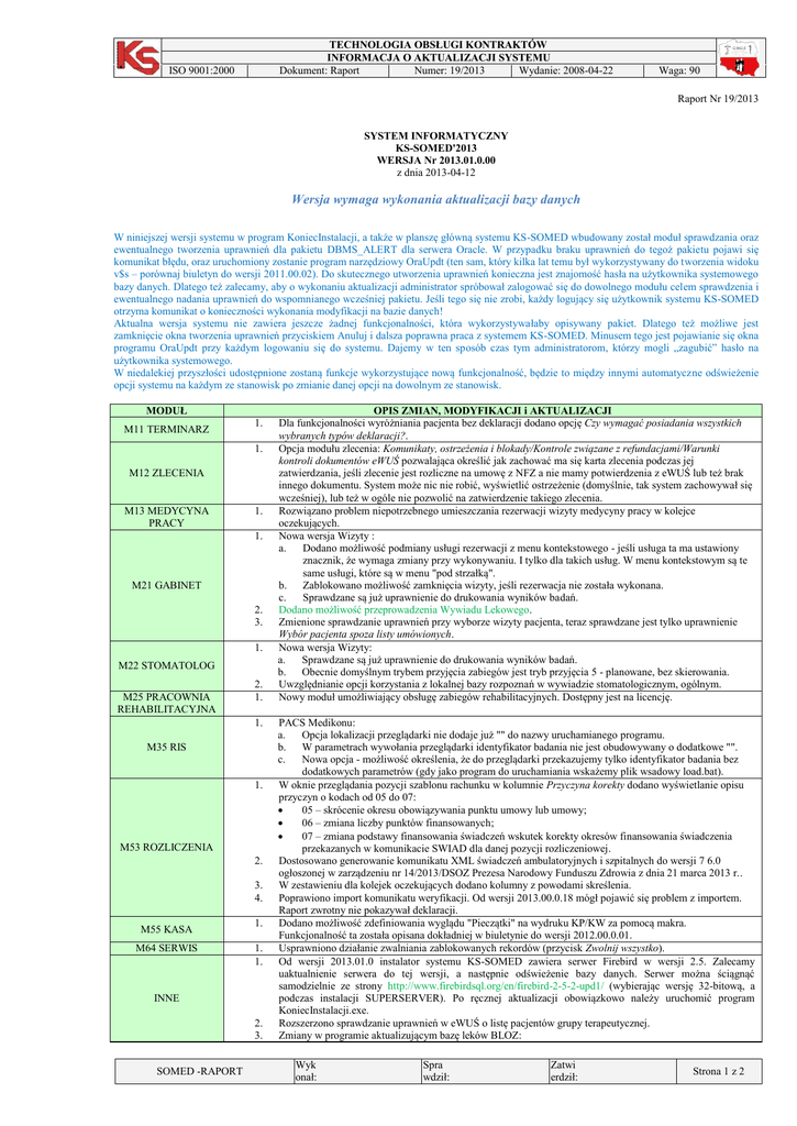 TECHNOLOGIA OBSŁUGI KONTRAKTÓW INFORMACJA O AKTUALIZACJI SYSTEMU Dokument: Raport Numer: 19/2013 Wydanie: 2008-04-22 ISO 9001:2000 Waga: 90 Raport Nr 19/2013 SYSTEM INFORMATYCZNY KS-SOMED'2013 WERSJA Nr 2013.01.0.00 z dnia 2013-04-12 Wersja wymaga wykonania aktualizacji bazy danych W niniejszej wersji systemu w program KoniecInstalacji, a także w planszę główną systemu KS-SOMED wbudowany został moduł sprawdzania oraz ewentualnego tworzenia uprawnień dla pakietu DBMS_ALERT dla serwera Oracle. W przypadku braku uprawnień do tegoż pakietu pojawi się komunikat błędu, oraz uruchomiony zostanie program narzędziowy OraUpdt (ten sam, który kilka lat temu był wykorzystywany do tworzenia widoku v$s – porównaj biuletyn do wersji 2011.00.02). Do skutecznego utworzenia uprawnień konieczna jest znajomość hasła na użytkownika systemowego bazy danych. Dlatego też zalecamy, aby o wykonaniu aktualizacji administrator spróbował zalogować się do dowolnego modułu celem sprawdzenia i ewentualnego nadania uprawnień do wspomnianego wcześniej pakietu. Jeśli tego się nie zrobi, każdy logujący się użytkownik systemu KS-SOMED otrzyma komunikat o konieczności wykonania modyfikacji na bazie danych! Aktualna wersja systemu nie zawiera jeszcze żadnej funkcjonalności, która wykorzystywałaby opisywany pakiet. Dlatego też możliwe jest zamknięcie okna tworzenia uprawnień przyciskiem Anuluj i dalsza poprawna praca z systemem KS-SOMED. Minusem tego jest pojawianie się okna programu OraUpdt przy każdym logowaniu się do systemu. Dajemy w ten sposób czas tym administratorom, którzy mogli „zagubić” hasło na użytkownika systemowego. W niedalekiej przyszłości udostępnione zostaną funkcje wykorzystujące nową funkcjonalność, będzie to między innymi automatyczne odświeżenie opcji systemu na każdym ze stanowisk po zmianie danej opcji na dowolnym ze stanowisk. MODUŁ M11 TERMINARZ 1. 1. M12 ZLECENIA M13 MEDYCYNA PRACY 1. 1. M21 GABINET 2. 3. 1. M22 STOMATOLOG M25 PRACOWNIA REHABILITACYJNA 2. 1. 1. M35 RIS 1. M53 ROZLICZENIA 2. 3. 4. M55 KASA M64 SERWIS 1. 1. 1. INNE 2. 3. SOMED -RAPORT OPIS ZMIAN, MODYFIKACJI i AKTUALIZACJI Dla funkcjonalności wyróżniania pacjenta bez deklaracji dodano opcję Czy wymagać posiadania wszystkich wybranych typów deklaracji?. Opcja modułu zlecenia: Komunikaty, ostrzeżenia i blokady/Kontrole związane z refundacjami/Warunki kontroli dokumentów eWUŚ pozwalająca określić jak zachować ma się karta zlecenia podczas jej zatwierdzania, jeśli zlecenie jest rozliczne na umowę z NFZ a nie mamy potwierdzenia z eWUŚ lub też brak innego dokumentu. System może nic nie robić, wyświetlić ostrzeżenie (domyślnie, tak system zachowywał się wcześniej), lub też w ogóle nie pozwolić na zatwierdzenie takiego zlecenia. Rozwiązano problem niepotrzebnego umieszczania rezerwacji wizyty medycyny pracy w kolejce oczekujących. Nowa wersja Wizyty : a. Dodano możliwość podmiany usługi rezerwacji z menu kontekstowego - jeśli usługa ta ma ustawiony znacznik, że wymaga zmiany przy wykonywaniu. I tylko dla takich usług. W menu kontekstowym są te same usługi, które są w menu "pod strzałką". b. Zablokowano możliwość zamknięcia wizyty, jeśli rezerwacja nie została wykonana. c. Sprawdzane są już uprawnienie do drukowania wyników badań. Dodano możliwość przeprowadzenia Wywiadu Lekowego. Zmienione sprawdzanie uprawnień przy wyborze wizyty pacjenta, teraz sprawdzane jest tylko uprawnienie Wybór pacjenta spoza listy umówionych. Nowa wersja Wizyty: a. Sprawdzane są już uprawnienie do drukowania wyników badań. b. Obecnie domyślnym trybem przyjęcia zabiegów jest tryb przyjęcia 5 - planowane, bez skierowania. Uwzględnianie opcji korzystania z lokalnej bazy rozpoznań w wywiadzie stomatologicznym, ogólnym. Nowy moduł umożliwiający obsługę zabiegów rehabilitacyjnych. Dostępny jest na licencję. PACS Medikonu: a. Opcja lokalizacji przeglądarki nie dodaje już "" do nazwy uruchamianego programu. b. W parametrach wywołania przeglądarki identyfikator badania nie jest obudowywany o dodatkowe "". c. Nowa opcja - możliwość określenia, że do przeglądarki przekazujemy tylko identyfikator badania bez dodatkowych parametrów (gdy jako program do uruchamiania wskażemy plik wsadowy load.bat). W oknie przeglądania pozycji szablonu rachunku w kolumnie Przyczyna korekty dodano wyświetlanie opisu przyczyn o kodach od 05 do 07: 05 – skrócenie okresu obowiązywania punktu umowy lub umowy; 06 – zmiana liczby punktów finansowanych; 07 – zmiana podstawy finansowania świadczeń wskutek korekty okresów finansowania świadczenia przekazanych w komunikacie SWIAD dla danej pozycji rozliczeniowej. Dostosowano generowanie komunikatu XML świadczeń ambulatoryjnych i szpitalnych do wersji 7 6.0 ogłoszonej w zarządzeniu nr 14/2013/DSOZ Prezesa Narodowy Funduszu Zdrowia z dnia 21 marca 2013 r.. W zestawieniu dla kolejek oczekujących dodano kolumny z powodami skreślenia. Poprawiono import komunikatu weryfikacji. Od wersji 2013.00.0.18 mógł pojawić się problem z importem. Raport zwrotny nie pokazywał deklaracji. Dodano możliwość zdefiniowania wyglądu "Pieczątki" na wydruku KP/KW za pomocą makra. Funkcjonalność ta została opisana dokładniej w biuletynie do wersji 2012.00.0.01. Usprawniono działanie zwalniania zablokowanych rekordów (przycisk Zwolnij wszystko). Od wersji 2013.01.0 instalator systemu KS-SOMED zawiera serwer Firebird w wersji 2.5. Zalecamy uaktualnienie serwera do tej wersji, a następnie odświeżenie bazy danych. Serwer można ściągnąć samodzielnie ze strony http://www.firebirdsql.org/en/firebird-2-5-2-upd1/ (wybierając wersję 32-bitową, a podczas instalacji SUPERSERVER). Po ręcznej aktualizacji obowiązkowo należy uruchomić program KoniecInstalacji.exe. Rozszerzono sprawdzanie uprawnień w eWUŚ o listę pacjentów grupy terapeutycznej. Zmiany w programie aktualizującym 
