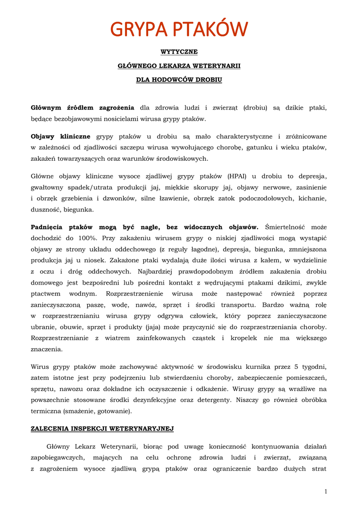GRYPA PTAKÓW WYTYCZNE GŁÓWNEGO LEKARZA WETERYNARII DLA HODOWCÓW DROBIU Głównym źródłem zagrożenia dla zdrowia ludzi i zwierząt (drobiu) są dzikie ptaki, będące bezobjawowymi nosicielami wirusa grypy ptaków. Objawy kliniczne grypy ptaków u drobiu są mało charakterystyczne i zróżnicowane w zależności od zjadliwości szczepu wirusa wywołującego chorobę, gatunku i wieku ptaków, zakażeń towarzyszących oraz warunków środowiskowych. Główne objawy kliniczne wysoce zjadliwej grypy ptaków (HPAI) u drobiu to depresja, gwałtowny spadek/utrata produkcji jaj, miękkie skorupy jaj, objawy nerwowe, zasinienie i obrzęk grzebienia i dzwonków, silne łzawienie, obrzęk zatok podoczodołowych, kichanie, duszność, biegunka. Padnięcia ptaków mogą być nagłe, bez widocznych objawów. Śmiertelność może dochodzić do 100%. Przy zakażeniu wirusem grypy o niskiej zjadliwości mogą wystąpić objawy ze strony układu oddechowego (z reguły łagodne), depresja, biegunka, zmniejszona produkcja jaj u niosek. Zakażone ptaki wydalają duże ilości wirusa z kałem, w wydzielinie z oczu i dróg oddechowych. Najbardziej prawdopodobnym źródłem zakażenia drobiu domowego jest bezpośredni lub pośredni kontakt z wędrującymi ptakami dzikimi, zwykle ptactwem wodnym. Rozprzestrzenienie wirusa może następować również poprzez zanieczyszczoną paszę, wodę, nawóz, sprzęt i środki transportu. Bardzo ważną rolę w rozprzestrzenianiu wirusa grypy odgrywa człowiek, który poprzez zanieczyszczone ubranie, obuwie, sprzęt i produkty (jaja) może przyczynić się do rozprzestrzeniania choroby. Rozprzestrzenianie z wiatrem zainfekowanych cząstek i kropelek nie ma większego znaczenia. Wirus grypy ptaków może zachowywać aktywność w środowisku kurnika przez 5 tygodni, zatem istotne jest przy podejrzeniu lub stwierdzeniu choroby, zabezpieczenie pomieszczeń, sprzętu, nawozu oraz dokładne ich oczyszczenie i odkażenie. Wirusy grypy są wrażliwe na powszechnie stosowane środki dezynfekcyjne oraz detergenty. Niszczy go również obróbka termiczna (smażenie, gotowanie). ZALECENIA INSPEKCJI WETERYNARYJNEJ Główny Lekarz Weterynarii, biorąc pod uwagę konieczność kontynuowania działań zapobiegawczych, mających na celu ochronę zdrowia ludzi i zwierząt, związaną z zagrożeniem wysoce zjadliwą grypą ptaków oraz ograniczenie bardzo dużych strat 1 ekonomicznych spowodowanych ewentualnym wybuchem choroby, przedstawia zalecenia umożliwiające skuteczne zabezpieczenie gospodarstw oraz zmniejszenie ryzyka szerzenia się choroby. Zalecenia dla drobnotowarowych hodowców drobiu - chów przyzagrodowy Zaleca się: karmienie i pojenie drobiu w pomieszczeniach zamkniętych, do których nie mają dostępu ptaki dzikie; przetrzymywanie drobiu w zamknięciu lub na ogrodzonej przestrzeni, pod warunkiem uniemożliwienia kontaktów z dzikim ptactwem (zastosowanie siatek ochronnych, zadaszenia); odizolowanie od innego drobiu, kaczek i gęsi; przechowywanie paszy, w tym zielonki, w pomieszczeniach zamkniętych lub pod szczelnym przykryciem, uniemożliwiającym kontakt z dzikim ptactwem; unikanie pojenia ptaków i czyszczenia kurników wodą pochodzącą spoza gospodarstwa (głównie ze zbiorników wodnych i rzek); zgłaszanie lekarzowi weterynarii, wójtowi, burmistrzowi, i innym organom władzy lokalnej zaobserwowanego spadku nieśności lub nagłych, zwiększonych padnięć drobiu; ograniczenie przemieszczania się osób postronnych oraz zwierząt pomiędzy obiektami, w których przechowywana jest karma dla zwierząt a obiektami, w których bytuje drób; po każdym kontakcie z drobiem lub ptakami dzikimi umycie rąk wodą z mydłem; wydzielenie odzieży używanej przy czynnościach związanych z obsługą drobiu; osobom utrzymującym drób w chowie przyzagrodowym, aby nie były zatrudniane w przemysłowych fermach drobiu; Zalecenia dla hodowców gołębi pocztowych Zaleca się: karmienie i pojenie gołębi w sposób wykluczający dostęp ptaków dzikich; przechowywanie paszy w pomieszczeniach zamkniętych lub pod szczelnym przykryciem uniemożliwiającym kontakt z dzikim ptactwem; nie wypuszczanie gołębi z gołębników celem oblatywania. Zalecenia dla przemysłowych producentów drobiu W okresie migracji dzikich ptaków powinno się przetrzymywać drób w odosobnieniu. Drób wodny (kaczki i gęsi) może być karmiony w tym czasie zielonkami dowożonymi do miejsca jego odchowu. 2 Zielonki nie mogą pochodzić z terenów wysokiego ryzyka zanieczyszczenia ich wirusem wysoce zjadliwej grypy ptaków, z okolic zbiorników wodnych, bagien, i innych miejsc stanowiących ostoję ptaków dzikich. Zaleca się: przetrzymywanie ptaków w zamknięciu lub na wolnej, ogrodzonej przestrzeni, pod warunkiem ograniczenia kontaktu z dzikim ptactwem oraz zabezpieczeniu tej przestrzeni przed odchodami dzikich ptaków; karmienie i pojenie drobiu w pomieszczeniach zamkniętych, do których nie mają dostępu ptaki dzikie; szczelne przykrycie pojemników z karmą i wodą do picia lub przetrzymywanie ich wewnątrz budynków, a także unikanie pojenia ptaków i czyszczenia pomieszczeń wodą pochodzącą spoza gospodarstwa (głównie ze zbiorników wodnych i rzek); ograniczenie przemieszczania się osób postronnych oraz zwierząt pomiędzy obiektami, w których przechowywana jest karma dla zwierząt a obiektami, w których bytuje drób; ograniczenie liczby osób obsługujących fermy do koniecznego minimum wraz ze sprawdzeniem czy osoby te nie utrzymują drobiu we własnych zagrodach; rozłożenie mat nasączonych środkiem dezynfekcyjnym przed wejściami do budynków fermy drobiu; założenie śluz dezynfekcyjnych w wejściach do budynków fermy drobiu; wprowadzenie zakazu wjazdu pojazdów na teren fermy, poza działaniami koniecznymi np. dowóz paszy, odbiór drobiu do rzeźni lub przez zakład utylizacyjny; obowiązkową dezynfekcję pojazdów wjeżdżających; rozłożenie mat dezynfekcyjnych