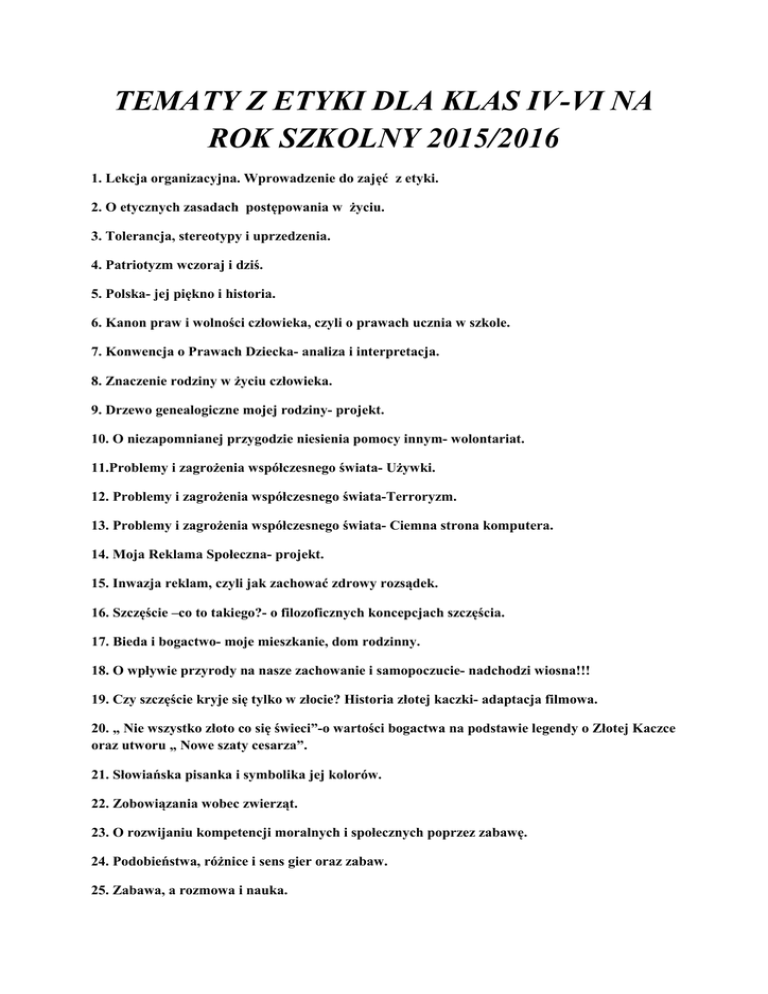 TEMATY Z ETYKI DLA KLAS IV-VI NA ROK SZKOLNY 2015/2016 1. Lekcja organizacyjna. Wprowadzenie do zajęć z etyki. 2. O etycznych zasadach postępowania w życiu. 3. Tolerancja, stereotypy i uprzedzenia. 4. Patriotyzm wczoraj i dziś. 5. Polska- jej piękno i historia. 6. Kanon praw i wolności człowieka, czyli o prawach ucznia w szkole. 7. Konwencja o Prawach Dziecka- analiza i interpretacja. 8. Znaczenie rodziny w życiu człowieka. 9. Drzewo genealogiczne mojej rodziny- projekt. 10. O niezapomnianej przygodzie niesienia pomocy innym- wolontariat. 11.Problemy i zagrożenia współczesnego świata- Używki. 12. Problemy i zagrożenia współczesnego świata-Terroryzm. 13. Problemy i zagrożenia współczesnego świata- Ciemna strona komputera. 14. Moja Reklama Społeczna- projekt. 15. Inwazja reklam, czyli jak zachować zdrowy rozsądek. 16. Szczęście –co to takiego?- o filozoficznych koncepcjach szczęścia. 17. Bieda i bogactwo- moje mieszkanie, dom rodzinny. 18. O wpływie przyrody na nasze zachowanie i samopoczucie- nadchodzi wiosna!!! 19. Czy szczęście kryje się tylko w złocie? Historia złotej kaczki- adaptacja filmowa. 20. „ Nie wszystko złoto co się świeci”-o wartości bogactwa na podstawie legendy o Złotej Kaczce oraz utworu „ Nowe szaty cesarza”. 21. Słowiańska pisanka i symbolika jej kolorów. 22. Zobowiązania wobec zwierząt. 23. O rozwijaniu kompetencji moralnych i społecznych poprzez zabawę. 24. Podobieństwa, różnice i sens gier oraz zabaw. 25. Zabawa, a rozmowa i nauka. 26. Czy jesteśmy dzisiaj ludźmi- planetami, które drepcą po własnej orbicie, nie zważając na innych?-rozważania na podstawie „ Małego Księcia” 27. „Gdybym był królem…” 28. Etyczne postępowanie króla Maciusia I- adaptacja filmowa książki J. Korczaka. 29. Ty możesz być Superbohaterem! 30. Czy strach ma wielkie oczy?- o strachu słów kilka… 31. Jak pożytecznie organizować czas wolny.