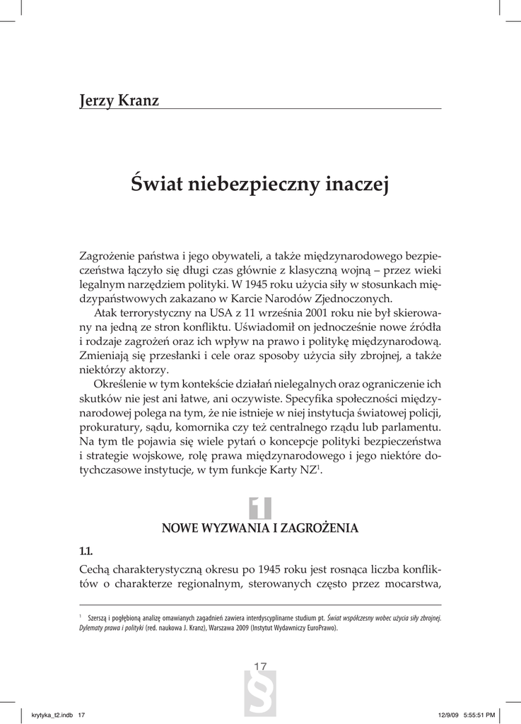 Jerzy Kranz Świat niebezpieczny inaczej Zagrożenie państwa i jego obywateli, a także międzynarodowego bezpieczeństwa łączyło się długi czas głównie z klasyczną wojną – przez wieki legalnym narzędziem polityki. W 1945 roku użycia siły w stosunkach międzypaństwowych zakazano w Karcie Narodów Zjednoczonych. Atak terrorystyczny na USA z 11 września 2001 roku nie był skierowany na jedną ze stron konfliktu. Uświadomił on jednocześnie nowe źródła i rodzaje zagrożeń oraz ich wpływ na prawo i politykę międzynarodową. Zmieniają się przesłanki i cele oraz sposoby użycia siły zbrojnej, a także niektórzy aktorzy. Określenie w tym kontekście działań nielegalnych oraz ograniczenie ich skutków nie jest ani łatwe, ani oczywiste. Specyfika społeczności międzynarodowej polega na tym, że nie istnieje w niej instytucja światowej policji, prokuratury, sądu, komornika czy też centralnego rządu lub parlamentu. Na tym tle pojawia się wiele pytań o koncepcje polityki bezpieczeństwa i strategie wojskowe, rolę prawa międzynarodowego i jego niektóre dotychczasowe instytucje, w tym funkcje Karty NZ1. 1 Nowe wyzwania i zagrożenia 1.1. Cechą charakterystyczną okresu po 1945 roku jest rosnąca liczba konfliktów o charakterze regionalnym, sterowanych często przez mocarstwa, Szerszą i pogłębioną analizę omawianych zagadnień zawiera interdyscyplinarne studium pt. Świat współczesny wobec użycia siły zbrojnej. Dylematy prawa i polityki (red. naukowa J. Kranz), Warszawa 2009 (Instytut Wydawniczy EuroPrawo). 1 17 krytyka_t2.indb 17 12/9/09 5:55:51 PM Krytyka Prawa a prowadzonych przez aktorów zastępczych. Nasilają się ponadto zbrojne konflikty wewnętrzne, którym towarzyszy swoista prywatyzacja w postaci uzbrojonych grup najemników lub prywatnych armii (warlords). Przyczyną tej sytuacji są dyktatury łamiące prawa człowieka albo też słabość wewnętrzna państwa. W niektórych regionach niemoc ta zachęca do walk zbrojnych i prowadzi do upadku władz państwowych oraz politycznego chaosu (tzw. failed lub failing states), co ułatwia dominację ruchów fundamentalistycznych lub terrorystycznych. Praktyka dowodzi, iż stabilizacja takich państw jest zadaniem niesłychanie trudnym, a niekiedy wręcz ponad siły społeczności międzynarodowej. 1.2. Rośnie też fala międzynarodowego terroryzmu, któremu towarzyszą nowe cele i formy. Współczesny terroryzm charakteryzuje się brakiem grupy celowej, w której imieniu walczy. Nie jest on też zainteresowany rozwiązaniem problemów danego regionu lub kraju, lecz raczej dąży do zmiany polityki regionalnej lub światowej przez walkę z cywilizacją zachodnią lub jej wpływami. Jego celem jest destrukcja w czystej formie. Nowy terroryzm lekceważy ponadto normy obowiązujące w cywilizowanym świecie, co prowadzi nieuchronnie do prób obniżania progu reakcji na działania sprawców. Obiektem współczesnych ataków terrorystycznych są dziś z reguły nie przedstawiciele państwa, lecz głównie ludność cywilna (porywanie samolotów i statków, zamachy na turystów i sportowców, akcje samobójcze w miejscach publicznych). Mimo że zasięg terytorialny tych działań rozszerzył się na cele poza obszarem danego konfliktu (na przykład na USA, Wielką Brytanię czy Hiszpanię), większość ataków terrorystycznych ma miejsce poza krajami europejskimi (na przykład w Egipcie, Algierii, Kenii, Arabii Saudyjskiej, Afganistanie, Indiach, Indonezji, Iraku, a także Izraelu). Nie jest prawdą, iż międzynarodowy terroryzm wyrasta głównie z biedy. Jego źródłami są raczej frustracje kulturowe i gospodarcze, brak demokracji, nierówny podział dochodów oraz marnotrawienie pomocy międzynarodowej przez wiele państw rozwijających się (skorumpowanym elitom rządzącym zależy na wzbogaceniu się i utrzymywaniu ludności na niskim poziomie wykształcenia). Są to problemy społeczeństw niedemokratycznych oraz niechętnych modernizacji. Nie bez znaczenia są też pewne błędy polityki zachodniej. 18 krytyka_t2.indb 18 12/9/09 5:55:51 PM Bezpieczeństwo 1.3. Mimo postępów w procesie rozbrojeniowym rośnie zagrożenie bronią masowego rażenia i nowym wyścigiem zbrojeń. Z jednej strony, pięciu stałych członków Rady Bezpieczeństwa utrzymuje i/lub rozwija swój nuklearny potencjał wojskowy, z drugiej zaś, niektóre państwa dyktatorskie i politycznie nieobliczalne (rogue states) dążą do posiadania tej broni. Gdy te ostatnie zdobędą ją, staną się w trójnasób niebezpieczne – łatwiej im będzie grozić siłą lub jej używać, nie zawahają się przed handlem technologiami i tą bronią, a trudniej będzie im stawić czoło ze względu na ryzyko odwetu. Atak z użyciem broni masowego rażenia powoduje zniszczenia na wielką skalę, trudno go uprzedzić, nie musi też być poprzedzony wielką operacją wojskową. Wymaga wprawdzie odpowiednich środków przenoszenia tej broni, ale grupy terrorystyczne mogą ją przemycić do państwa docelowego lub ją wręcz w nim wyprodukować uproszczonymi sposobami, co jest zwłaszcza możliwe w przypadku broni chemicznej czy biologicznej. Jak zapobiec rozprzestrzenianiu broni masowego rażenia? Jak zapewnić skuteczność kontroli międzynarodowej? Co czynić, gdy – w ramach traktatowych reżimów kontrolnych – dane państwo utrudnia międzynarodową kontrolę, zwłaszcza nie ujawnia wszystkich elementów programu nuklearnego (na przykład Korea Północna, Irak, Iran) i nie chce zawrzeć z Międzynarodową Agencją Energii Atomowej (MAEA) tzw. protokołów dodatkowych? Współczesny system zapobiegania rozprzestrzenianiu tej broni (w tym kontroli używania uranu i plutonu) w coraz mniejszym stopniu spełnia pokładane w nim nadzieje. Coraz pilniejsza staje się odpowiedź na pytanie, czy i na jakich warunkach międzynarodowej kontroli każde państwo może realizować program nuklearny dla celów cywilnych, bez zagrożenia, i