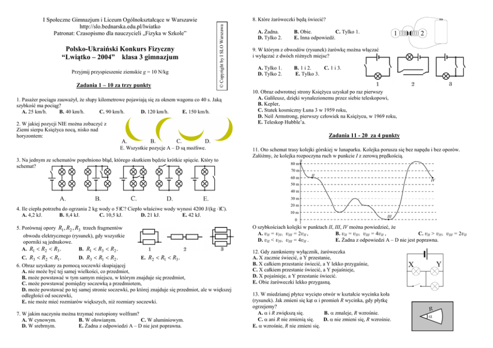 Polsko-Ukraiński Konkurs Fizyczny “Lwiątko – 2004” klasa 3 gimnazjum Przyjmij przyspieszenie ziemskie g = 10 N/kg Zadania 1 – 10 za trzy punkty 8. Które Ŝaróweczki będą świecić? © Copyright by I SLO Warszawa I Społeczne Gimnazjum i Liceum Ogólnokształcące w Warszawie http://slo.bednarska.edu.pl/lwiatko Patronat: Czasopismo dla nauczycieli „Fizyka w Szkole” 1. PasaŜer pociągu zauwaŜył, Ŝe słupy kilometrowe pojawiają się za oknem wagonu co 40 s. Jaką szybkość ma pociąg? А. 25 km/h. B. 40 km/h. C. 90 km/h. D. 120 km/h. E. 150 km/h. 2. W jakiej pozycji NIE moŜna zobaczyć z Ziemi sierpu KsięŜyca nocą, nisko nad horyzontem: A. śadna. D. Tylko 2. B. Obie. C. Tylko 1. E. Inna odpowiedź. 1 2 9. W którym z obwodów (rysunek) Ŝarówkę moŜna włączać i wyłączać z dwóch róŜnych miejsc? А. Tylko 1. D. Tylko 2. B. 1 i 2. C. 1 i 3. E. Tylko 3. 10. Obraz odwrotnej strony KsięŜyca uzyskał po raz pierwszy A. Galileusz, dzięki wynalezionemu przez siebie teleskopowi, B. Kepler, C. Statek kosmiczny Łuna 3 w 1959 roku, D. Neil Armstrong, pierwszy człowiek na KsięŜycu, w 1969 roku, E. Teleskop Hubble’a. Zadania 11 - 20 za 4 punkty E. Wszystkie pozycje A – D są moŜliwe. 3. Na jednym ze schematów popełniono błąd, którego skutkiem będzie krótkie spięcie. Który to schemat? 11. Oto schemat trasy kolejki górskiej w lunaparku. Kolejka porusza się bez napędu i bez oporów. ZałóŜmy, Ŝe kolejka rozpoczyna ruch w punkcie I z zerową prędkością. 80 m I 70 m 60 m II IV 50 m 40 m 30 m 4. Ile ciepła potrzeba do ogrzania 2 kg wody o 5°C? Ciepło właściwe wody wynosi 4200 J/(kg ⋅°C). А. 4,2 kJ. B. 8,4 kJ. C. 10,5 kJ. D. 21 kJ. E. 42 kJ. 20 m 10 m 0 5. Porównaj opory R1 , R2 , R3 trzech fragmentów obwodu elektrycznego (rysunek), gdy wszystkie oporniki są jednakowe. А. R1 < R2 < R3 . B. R1 < R3 < R2 . C. R3 < R2 < R1 . D. R3 < R1 < R2 . E. R2 < R1 < R3 . 6. Obraz uzyskany za pomocą soczewki skupiającej A. nie moŜe być tej samej wielkości, co przedmiot, B. moŜe powstawać w tym samym miejscu, w którym znajduje się przedmiot, C. moŜe powstawać pomiędzy soczewką a przedmiotem, D. moŜe powstawać po tej samej stronie soczewki, po której znajduje się przedmiot, ale w większej odległości od soczewki, E. nie moŜe mieć rozmiarów większych, niŜ rozmiary soczewki. 7. W jakim naczyniu moŜna trzymać roztopiony wolfram? А. W cynowym. B. W ołowianym. C. W aluminiowym. D. W srebrnym. E. śadna z odpowiedzi A – D nie jest poprawna. III O szybkościach kolejki w punktach II, III, IV moŜna powiedzieć, Ŝe A. vII = vIV, vIII = 2vII , B. vII = vIV, vIII = 4vII , C. vII > vIV, vIII = 2vII D. vII < vIV, vIII = 4vII . E. śadna z odpowiedzi A – D nie jest poprawna. 12. Gdy zamkniemy wyłącznik, Ŝaróweczka A. X zacznie świecić, a Y przestanie, B. X całkiem przestanie świecić, a Y lekko przygaśnie, C. X całkiem przestanie świecić, a Y pojaśnieje, D. X pojaśnieje, a Y przestanie świecić. E. Obie Ŝaróweczki lekko przygasną. 13. W miedzianej płytce wycięto otwór w kształcie wycinka koła (rysunek). Jak zmieni się kąt α i promień R wycinka, gdy płytkę ogrzejemy? А. α i R zwiększą się. B. α zmaleje, R wzrośnie. C. α ani R nie zmienią się. D. α nie zmieni się, R wzrośnie. E. α wzrośnie, R nie zmieni się. X Y 23. Punkty P’ i Q’ to obrazy punktów P i Q, otrzymane za pomocą płaskiego zwierciadła, prostopadłego do płaszczyzny rysunku. Jeden z rysunków jest na pewno błędny. Który? 14. W kalorymetrze znajduje się lód i woda, a nad nimi – para wodna, wszystkie o temperaturze 0°C. Masa kaŜdej z tych substancji wynosi 1 g. Która z nich ma największą, a która najmniejszą energię wewnętrzną? А. Para, lód. B. Woda, lód. C. Lód, para. D. Para, woda. E. Energie wewnętrzne wszystkich trzech substancji są jednakowe. 15. W trzech kalorymetrach ogrzewamy trzy róŜne ciecze takimi samymi grzałkami. Na rysunku przedstawiono zaleŜność temperatury kaŜdej z tych cieczy od czasu. Masy wszystkich trzech cieczy są jednakowe, ciepło właściwe pierwszej z nich wynosi c. Jakie ciepła właściwe mają ciecze druga i trzecia? А. 2c i 2c/3. B. 3c i 0,5c. C. 0,5c i 1,5c. D. 1,5c i 0,5c. 24. Jeśli ogniskowa soczewki skupiającej wynosi 24 cm, a przedmiot umieścimy w odległości 60 cm od soczewki, obraz będzie A. dwukrotnie pomniejszony, B. półtorakrotnie pomniejszony, C. półtorakrotnie powiększony, D. dwukrotnie powiększony. E. Obraz nie powstanie. E. 2c/3 i 2c. 16. Przewód rozcięto na 4 równe części i skręcono te kawałki w kabel. Ile razy opór kabla jest większy lub mniejszy od oporu przewodu? А. Jest 16 razy większy. B. Jest 4 razy większy. C. Jest 4 razy mniejszy. D. Jest 8 razy mniejszy. E. Jest 16 razy mniejszy. 17. W spoczywającym wagoniku, mogącym poruszać się bez oporów, powieszono na cienkiej i bardzo wiotkiej nici masywne wahadło. Wahadło odchylono od pionu i puszczono. W rezultacie wagonik A. zaczął poruszać się w przód i w tył w rytm wahnięć wahadła, B. przejechał kawałek i zatrzymał się, C. zaczął poruszać się jednostajnie, D. zaczął poruszać się niejednostajnie, ale stale w tę samą stronę, E. pozostał w spoczynku. 26. Pakunek o masie 60 kg zawieszono na krótszym ramieniu dźwigni dwustronnej o ramionach 20 cm i 80 cm i podniesiono go, działając siłą F na końcu dłuŜszego ramienia. PoniewaŜ dźwignia obracała się z pewnymi oporami, więc siła F wynosiła 200 N. Jaką częścią włoŜonej pracy była praca potrzebna do podniesienia pakunku? A. 25%. B. 33%. C. 40%. D. 75%. E. 100%. 18. Gdy piłka pływała w zbiorniku z naftą, działała na nią siła wyporu o wartości 5 N. Potem wyciągnięto ją ze zbiornika i wrzucono do wody. Jaka siła wyporu działa na piłkę pływającą po wodzie? Gęstość nafty 800 kg/m3, wody 1000 kg/m3. А. 4 N. B. 5 N. C. 6,25 N. D. 3,2 N. E. 7,8 N. 19. Człowie