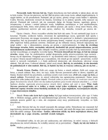 Porucznik Andy Stevens bał się. Nigdy dotychczas nie brał udziału w takiej akcji, ale nie to było ważne. Nie po raz pierwszy się bał. Bał się przez całe swoje życie, odkąd sięgał pamięcią. A sięgał daleko, aż do przedszkola. Pamiętał, jak go ojciec, głośny swego czasu badacz i alpinista, Cedric Stevens, dosłownie wrzucił do basenu, twierdząc że to jedyny sposób, żeby nauczyć się pływać. Pamiętał jak walczył, jak się szamotał, dążąc do brzegu basenu, ogarnięty grozą i zrozpaczony, z nosem i ustami pełnymi wody, żołądkiem zaciśniętym w tym nieokreślonym, przerażającym bólu, który miał później tak dobrze poznać; jak ojciec i dwaj starsi bracia, silni, radośni, pozbawieni nerwów jak sam ojciec, otarłszy łzy śmiechu, wrzucili go znowu do wody... Ojciec i bracia... Przez wszystkie szkolne lata było tak samo. To oni zamienili jego życie w koszmar. Twardzi, serdeczni ludzie, stworzeni do spartańskiego życia, uprawiali kult sportu i sprawności fizycznej, nie mogąc zrozumieć, jak można nie gustować w skokach z pięciometrowej trampoliny, bać się przesadzić na koniu zaryglowaną bramę, wspinać się po urwiskach górskich albo żeglować łodzią podczas sztormu. Zmuszali go do robienia rzeczy, których najczęściej nie mógł zrobić - nie z okrucieństwa zresztą, po prostu z nieświadomości. A więc do zwykłego fizycznego strachu, który normalnie odczuwał, dochodził lęk przed niepowodzeniem, przed nieuniknionym szyderstwem. Jako chłopak wrażliwy, ponad wszystko bał się śmieszności, zaczął się bać wszystkiego, co mogłoby wywołać kpiny. Wreszcie doszedł już do tego, że bał się samego strachu, mając więc lat siedemnaście podjął desperacką próbę przezwyciężenia tego uczucia biorąc się do alpinizmu. Osiągnął wreszcie w tej dziedzinie takie sukcesy i zyskał taką reputację, że ojciec i bracia zaczęli traktować go z szacunkiem. Ale strach go nie opuścił - przeciwnie, wzrósł nawet w nowych warunkach. (...) Andy próbował skutecznie, jak dotychczas, ukrywać swoją słabość. Tak jak teraz. Usiłował stłumić, zataić swój strach. Bał się, że zawiedzie, że nie dorośnie do pokładanych w nim nadziei. Bał się, że będzie się bał, że wszyscy zobaczą, jak on się boi ... (...) Strach. Groza. Panika. Zrób coś, czego się boisz, a strach zniknie. Zrób coś, czego się boisz, a strach zniknie. Raz, dwa, sto razy. Andy Stevens powtarzał sobie te słowa, zupełnie jak litanię. Kiedyś mówił mu psychiatra, a później czytał o tym wiele razy. Zrób coś, czego się boisz, a strach zniknie. Powiedzieli mu, że umysł człowieka ma ograniczoną pojemność. Naraz może pomieścić tylko jedną myśl, jeden impuls. Powiedz sobie,że jesteś dzielny, że zwalczasz strach, ten głupi, bezsensowny strach, który nie ma żadnych podstaw poza twoim własnym umysłem (...), wtedy będziesz dzielny, naprawdę przezwyciężysz strach, który zniknie jak cień w nocy. Więc Andy Stevens powtarzał sobie to w kółko, a cienie wciąż tylko wydłużały się i pogłębiały, zaś lodowate szpony strachu coraz bardziej zaciskały się w jego otępiałym, wyczerpanym umyśle, w jego skurczonym żołądku. (...) Strach. Przez całe życie był u jego boku, był jego stałym towarzyszem, alter ego. U boku albo w bliskim zasięgu, gotów do natychmiastowego powrotu. Przyzwyczaił się do tego strachu, niekiedy prawie godził się z nim, ale cierpienia owej nocy przekraczały wszystko, co było dotychczas. (...) Andy Stevens bał się, bo stracił szacunek dla samego siebie. Dotychczas ten szacunek był jego kotwicą, przeciwwagą starego nieprzyjaciela; szacunek, jaki mieli dla niego inni, szacunek jaki miał dla siebie samego. Lecz teraz - koniec, albowiem ziściły się dwie największe obawy, inni dowiedzieli się o jego strachu, zawiódł swoich kolegów. (...) Uświadomił sobie, że nie jest ani zaskoczony, ani zdziwiony, że mówi rzeczy, o których dotychczas nie mówił nikomu, bo wolałby umrzeć niż je powiedzieć - Nigdy się tak nie bałem w życiu. Mallory pokręcił głową ( …) – (…) – – Myślisz może, że ja się śmiałem i podśpiewywałem włażąc po tej skale ? Myślisz, że ja się nie bałem? - Zapalił papierosa i wpatrywał się w Stevensa przez chmurę dymu. Bynajmniej. „Bałem się” nie jest właściwym słowem. Byłem przerażony. Tak samo Andrea. Za dużo wiemy, żeby się nie bać. Andrea!- szepnął. - Bał się! Nie wierzę. Andrea bał się.- Głos olbrzymiego Greka był bardzo łagodny. - Andrea boi się nadal. Andrea zawsze się boi. Dlatego żyje dotychczas. (…) Uśmiechnął się do Stevensa. - Nie ma na świecie odważnych i tchórzy synu. Są tylko odważni ludzie. Żeby żyć i umierać – tylko na to potrzebna jest odwaga. Wszyscy jesteśmy dzielni i wszyscy się boimy, a ten, którego świat nazywa odważnym, jest równie odważny i tchórzliwy jak reszta z nas. Tylko że jest odważny o pięć minut dłużej. Albo czasami dziesięć czy dwadzieścia minut. Albo o tyle czasu, ile potrzeba człowiekowi krańcowo wyczerpanemu, ociekającemu krwią i przerażonemu do wejścia na skałę. Alistair MacLean „Działa Nawarony” przekład Adam Kaska foto:FilmWeb