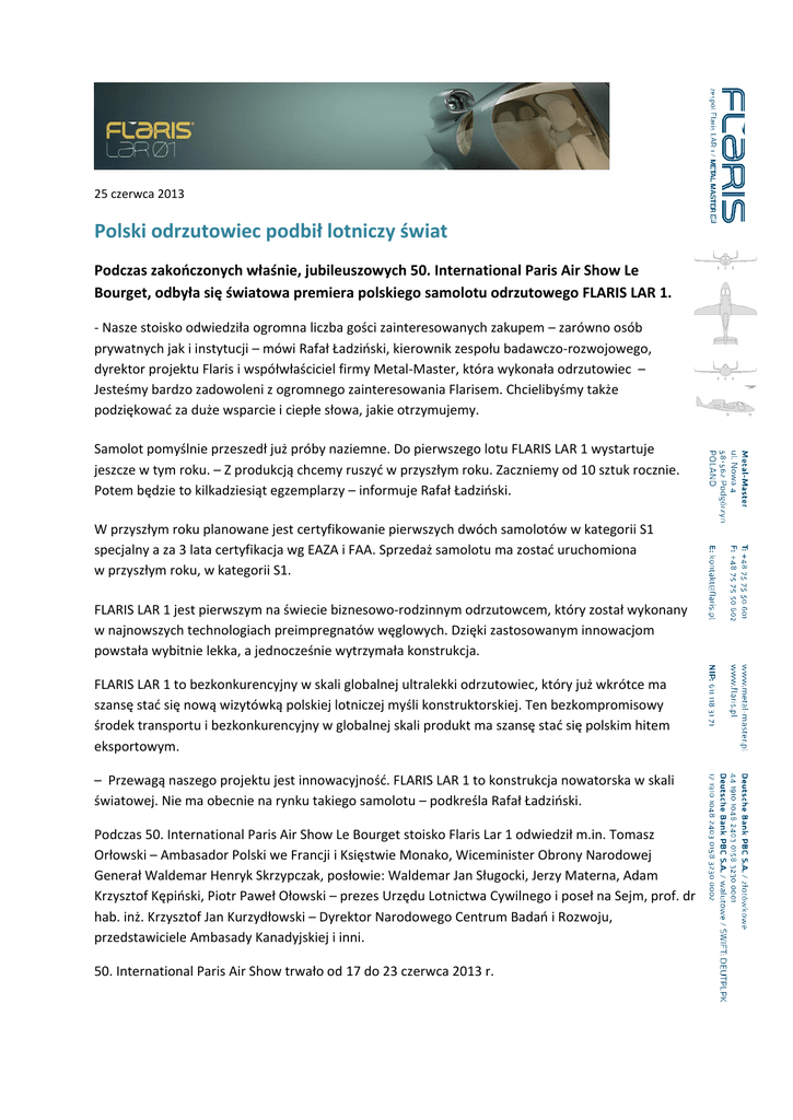 25 czerwca 2013 Polski odrzutowiec podbił lotniczy świat Podczas zakooczonych właśnie, jubileuszowych 50. International Paris Air Show Le Bourget, odbyła się światowa premiera polskiego samolotu odrzutowego FLARIS LAR 1. - Nasze stoisko odwiedziła ogromna liczba gości zainteresowanych zakupem – zarówno osób prywatnych jak i instytucji – mówi Rafał Ładzioski, kierownik zespołu badawczo-rozwojowego, dyrektor projektu Flaris i współwłaściciel firmy Metal-Master, która wykonała odrzutowiec – Jesteśmy bardzo zadowoleni z ogromnego zainteresowania Flarisem. Chcielibyśmy także podziękowad za duże wsparcie i ciepłe słowa, jakie otrzymujemy. Samolot pomyślnie przeszedł już próby naziemne. Do pierwszego lotu FLARIS LAR 1 wystartuje jeszcze w tym roku. – Z produkcją chcemy ruszyd w przyszłym roku. Zaczniemy od 10 sztuk rocznie. Potem będzie to kilkadziesiąt egzemplarzy – informuje Rafał Ładzioski. W przyszłym roku planowane jest certyfikowanie pierwszych dwóch samolotów w kategorii S1 specjalny a za 3 lata certyfikacja wg EAZA i FAA. Sprzedaż samolotu ma zostad uruchomiona w przyszłym roku, w kategorii S1. FLARIS LAR 1 jest pierwszym na świecie biznesowo-rodzinnym odrzutowcem, który został wykonany w najnowszych technologiach preimpregnatów węglowych. Dzięki zastosowanym innowacjom powstała wybitnie lekka, a jednocześnie wytrzymała konstrukcja. FLARIS LAR 1 to bezkonkurencyjny w skali globalnej ultralekki odrzutowiec, który już wkrótce ma szansę stad się nową wizytówką polskiej lotniczej myśli konstruktorskiej. Ten bezkompromisowy środek transportu i bezkonkurencyjny w globalnej skali produkt ma szansę stad się polskim hitem eksportowym. – Przewagą naszego projektu jest innowacyjnośd. FLARIS LAR 1 to konstrukcja nowatorska w skali światowej. Nie ma obecnie na rynku takiego samolotu – podkreśla Rafał Ładzioski. Podczas 50. International Paris Air Show Le Bourget stoisko Flaris Lar 1 odwiedził m.in. Tomasz Orłowski – Ambasador Polski we Francji i Księstwie Monako, Wiceminister Obrony Narodowej Generał Waldemar Henryk Skrzypczak, posłowie: Waldemar Jan Sługocki, Jerzy Materna, Adam Krzysztof Kępioski, Piotr Paweł Ołowski – prezes Urzędu Lotnictwa Cywilnego i poseł na Sejm, prof. dr hab. inż. Krzysztof Jan Kurzydłowski – Dyrektor Narodowego Centrum Badao i Rozwoju, przedstawiciele Ambasady Kanadyjskiej i inni. 50. International Paris Air Show trwało od 17 do 23 czerwca 2013 r. Background: Flaris LAR 1 tworzy więc nową kategorię bardzo lekkich samolotów. Przeznaczony jest dla osób podróżujących w celach biznesowych lub turystycznych. Flaris LAR 1 łączy w sobie przeciwstawne cechy: łatwośd pilotażu, właściwą samolotom ultralekkim z osiągami odrzutowca (prędkośd i zasięg). Jest intuicyjny w pilotażu, przygotowany do operowania jednoosobowego, a do jego pilotowania wystarczy licencja turystyczna. FLARIS LAR 1 to konstrukcja nowatorska w skali światowej. Jest aż o tonę lżejszy od analogicznych samolotów konkurencji, zużywa więc znacznie mniej paliwa, a przez to jest przyjazny dla środowiska i minimalizuje koszty podróży. Wydajnośd i ekonomia samolotu jest wypadkową wybitnie niskiej masy startowej, nowoczesnego napędu i wyjątkowej aerodynamiki. FLARIS LAR 1 jest bezpieczny w użytkowaniu. Dzięki wyjątkowej, porównywalnej z szybowcem doskonałości aerodynamicznej i jednobryłowemu kadłubowi w kształcie kropli, FLARIS LAR 1 może przy wyłączonym napędzie pokonywad lotem ślizgowym 18 km na każdy kilometr utraty wysokości i znaleźd przygodne lądowisko. Samolot jest dodatkowo wyposażony w nowoczesny spadochronowy system bezpieczeostwa, umieszczony w części nosowej. Dzięki szybko i łatwo demontowanym skrzydłom a także wyjątkowo krótkiemu startowi i lądowaniu (zdolnośd operowania z krótkich, trawiastych pasów lub małych lotnisk) można ominąd duże lotniska i dolecied najbliżej celu podróży. FLARIS LAR 1 proponuje nową jakośd w transporcie prywatnym. Dopełnieniem filozofii stworzenia osobistego środka transportu jest umożliwienie jego posiadaczom, wykreowania własnej grafiki na powierzchni samolotu, która podkreśli indywidualny charakter odrzutowca i wyrazi osobowośd właściciela. Nowatorskie rozwiązania zastosowane w konstrukcji samolotu chronione są 8 patentami uzyskanymi przez polską firmę Metal-Master. Tak ambitne wyzwanie, jakie postawili przed sobą twórcy odrzutowca FLARIS LAR 1, wymaga współpracy z najlepszymi polskimi konstruktorami w branży lotniczej. Do współpracy zaproszeni zostali więc wybitni polscy specjaliści od aerodynamiki i mechaniki lotu. Głównym konstruktorem został wybitny konstruktor z ponad 50-letnim stażem mgr inż. Andrzej Frydrychewicz, twórca takich samolotów jak ponadczasowa Wilga, Kruk oraz Orlik. Więcej informacji znajdą Paostwo na stronie: www.flaris.pl/mobile www.flaris.pl Kontakt: [email protected] Jeśli potrzebne będą materiały w rozdzielczości do druku lub dodatkowe informacje i zdjęcia prosimy o kontakt mailowy.