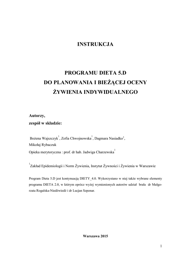 INSTRUKCJA PROGRAMU DIETA 5.D DO PLANOWANIA I BIEŻĄCEJ OCENY ŻYWIENIA INDYWIDUALNEGO Autorzy, zespół w składzie: 1 1 Bożena Wajszczyk , Zofia Chwojnowska , Dagmara Nasiadko1, Mikołaj Rybaczuk Opieka merytoryczna : prof. dr hab. Jadwiga Charzewska 1 1 Zakład Epidemiologii i Norm Żywienia, Instytut Żywności i Żywienia w Warszawie Program Dieta 5.D jest kontynuacją DIETY_4.0. Wykorzystano w niej także wybrane elementy programu DIETA 2.0, w którym oprócz wyżej wymienionych autorów udział brała dr Małgorzata Rogalska-Niedźwiedź i dr Lucjan Szponar. Warszawa 2015 1 2 SPIS TREŚCI WPROWADZENIE 5 1. ZAŁOŻENIA PROGRAMU DIETA 5.D 6 2. PRZEZNACZENIE I MOŻLIWOŚCI PROGRAMU DIETA 5.D 6 3. PRACA Z PROGRAMEM DIETA 5.D 24 3.1. POCZĄTEK PRACY. UŻYTKOWNICY I HASŁA DOSTĘPU 3.1.1 Opcja Plik–Zarejestruj/Usuń użytkownika. 3.1.2 Opcje Zaloguj się z menu głównego oraz Plik–Zmień hasło. 3.2. ORGANIZACJA PRACY Z BAZAMI DANYCH 3.2.1 Opcje Plik-Nowa baza (badanie) i Plik–Nowa baza diet 3.2.2 Opcje Plik-Wybierz bazę do pracy i Plik–Wybierz bazę diet do pracy 3.3. BEZPIECZEŃSTWO BAZ DANYCH. OPCJA PAKOWANIE BAZ I NAPRAWA INDEKSÓW 3.4. PRZENOSZENIE BAZ DANYCH Z DIETY_4 I DIETY_2 DO DIETY_5 3.4.1 Opcja Plik-importuj bazę z Diety_2 3.5. OPCJA DOŁĄCZ BAZĘ Z ZEWNĄTRZ... 24 24 25 26 26 28 30 32 32 33 4. WPROWADZANIE WYWIADÓW/JADŁOSPISÓW – OPCJA WYWIAD/JADŁOSPIS 34 4.1. WPROWADZANIE LUB EDYCJA NOWEJ OSOBY 34 4.2. WPROWADZANIE LUB EDYCJA NOWEGO WYWIADU/JADŁOSPISU 35 4.3. REJESTRACJA POTRAW SPOŻYTYCH W CIĄGU DOBY (SPOŻYCIE Z 24 GODZ.) 36 4.3.1 Wprowadzanie produktów i potraw na listę dobowego spożycia 36 4.3.2 Wykorzystanie przycisków Korekta, Kopiuj rekord i Usuń rekord 41 4.3.3 Przyciski Drukuj i Do EXCELA 42 4.3.4 Przycisk Pokaż podsumowanie spożycia dobowego 43 4.4. PRZYCISK DRUKUJ JADŁOSPIS 46 4.5. PRZYCISK KOPIUJ ZAREJESTROWANE JADŁOSPISY (DIETY) 48 4.5.1. Kopiowanie wybranego jadłospisu z bazy wywiad/jadłospis do bazy diet 50 4.6. SPOSÓB WPROWADZANIA DANYCH O SPOŻYCIU I RECEPTURY POTRAW 51 4.6.1 Wybór: baza rynkowa – baza jadalna 51 4.5.2 Wprowadzanie potraw 52 4.5.3 Postępowanie w przypadku braku produktów lub potraw w bazie danych 54 4.7. OBLICZANIE ILOŚCI SPOŻYTYCH SKŁADNIKÓW ODŻYWCZYCH W CIĄGU DOBY DLA JEDNEJ OSOBY 56 4.7.1 Podgląd i wydruk z formularza Rejestracja żywienia z 24 godzin 56 4.7.2 Zawartość drukowanych tabel 58 5. OPCJA TWORZENIE DIET 59 6. BAZY SYSTEMOWE PROGRAMU DIETA 5.D 62 3 6.1. BAZA FOTOGRAFII PRODUKTÓW I POTRAW 6.2. BAZA WARTOŚCI ODŻYWCZEJ PRODUKTÓW, POTRAW I FARMAKOLOGICZNYCH PREPARATÓW WITAMINOWO-MINERALNYCH 6.3 BAZA NORM ŻYWIENIA 62 63 66 7. UWAGI EKSPLOATACYJNE 67 8. DANE CYTOWANE W BAZACH SYSTEMOWYCH 69 4 WPROWADZENIE Program komputerowy Dieta 5.D jest unikatowym programem komputerowym, przeznaczonym do oceny żywienia indywidualnego, a także do planowania spożycia dla określonych grup ludności na tle norm żywienia. Głównym zadaniem programu Dieta 5.D jest umożliwienie obliczenia wartości energetycznej i odżywczej diet i porównanie obliczonej wartości odżywczej do norm. Program Dieta 5.D może służyć również do obliczania wartości odżywczej jadłospisów w żywieniu zbiorowym i indywidualnym, projektowania i oceny stopnia realizacji modelowych diet (można tworzyć bazę gotowych diet do wykorzystania w planowaniu żywienia), szacowania wartości odżywczej potraw bez uwzględniania, lub z uwzględnianiem wielkości strat technologicznych. Dodatkowo program ma zapewnić: standaryzację sposobu wprowadzanych danych o spożywanych produktach i potrawach (kolejność i dokładność określania rodzaju i składu potraw); standaryzację receptur potraw; standaryzację określania wielkości porcji (wybór wielkości porcji z zaproponowanych w programie); Standaryzację sposobu obliczania (jednakowe wielkości redukcji) i uzyskiwanych wyników (liczba składników, porównanie z normami). Korzystając z programu Dieta 5.D można w wystandaryzowany sposób przeprowadzić badanie sposobu żywienia w trakcie rozmowy z respondentem (osobą badaną), można również w wystandaryzowany sposób wprowadzić dane o spożyciu zebrane wcześniej metodą wywiadu lub zapisu spożycia oraz za pomocą innych metod, po dokonaniu odpowiednich transformacji. Program Dieta 5.D umożliwia wprowadzenie nieograniczonej liczby wywiadów lub zapisów spożycia dla jednej osoby. Pozwala w wygodny sposób tworzyć bazę diet i jadłospisów. Program Dieta 5.D jest jednostanowiskowy, jest przewidziany do pracy w środowisku co najmniej Windows XP. Grafika i moc obliczeniowa aktualnie dostępnych komputerów jest wystarczająca do realizacji stawianych przed programem zadań. Szczegółowe informacje dotyczące programu Dieta 5.D wraz z warunkami sprzedaży można uzyskać w Instytucie Żywności i Żywienia, 02-903 Warszawa, ul. Powsińska 61/63 tel. 22 5509-772 (sekretariat), 22 55-09-851 (mgr Bożena Wajszczyk); 22-55-09-738 (mgr Zofia Chwojnowska). 5 1. ZAŁOŻENIA PROGRAMU Dieta 5.D Program Dieta 5.D został przygotowany z uwzględnieniem wymogów stawianych analizom sposobu żywienia, prowadzonym w renomowanych, wiodących placówkach na świecie. Podstawowym wymogiem jest standaryzacja całego procesu badania sposobu żywienia, która gwarantuje porównywalność uzyskanych wyników. Na porównywalność i wysoką jakość wyników uzyskanych w korzystaniu z programu Dieta 5.D wpływa między innymi: ujednolicony sposób zbierania danych (z wywiadu, zapisu), sposób szacowania wielkości porcji wraz z systemem pomocy uwzględniającym różnorodności dodatków i wskazującym typowe ilości stosowanych dodatków, przyjęte receptury potraw, wielkości redukcji składników o wielkość strat nieuniknionych uzależnionych od sposobu przygotowania potraw, źródło danych dotyczących wartości energetycznej i odżywczej produktów (użyte najnowsze tabele składu i wartości odżywczych produktów 2