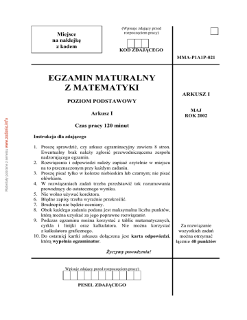(Wpisuje zdaj¹cy przed rozpoczêciem pracy) Miejsce na naklejkê z kodem KOD ZDAJ¥CEGO MMA-P1A1P-021 EGZAMIN MATURALNY Z MATEMATYKI ARKUSZ I POZIOM PODSTAWOWY Arkusz I MAJ ROK 2002 Czas pracy 120 minut Instrukcja dla zdaj¹cego 1. Proszê sprawdziæ, czy arkusz egzaminacyjny zawiera 8 stron. Ewentualny brak nale¿y zg³osiæ przewodnicz¹cemu zespo³u nadzoruj¹cego egzamin. 2. Rozwi¹zania i odpowiedzi nale¿y zapisaæ czytelnie w miejscu na to przeznaczonym przy ka¿dym zadaniu. 3. Proszê pisaæ tylko w kolorze niebieskim lub czarnym; nie pisaæ o³ówkiem. 4. W rozwi¹zaniach zadañ trzeba przedstawiæ tok rozumowania prowadz¹cy do ostatecznego wyniku. 5. Nie wolno u¿ywaæ korektora. 6. B³êdne zapisy trzeba wyranie przekreliæ. 7. Brudnopis nie bêdzie oceniany. 8. Obok ka¿dego zadania podana jest maksymalna liczba punktów, któr¹ mo¿na uzyskaæ za jego poprawne rozwi¹zanie. 9. Podczas egzaminu mo¿na korzystaæ z tablic matematycznych, cyrkla i linijki oraz kalkulatora. Nie mo¿na korzystaæ z kalkulatora graficznego. 10. Do ostatniej kartki arkusza do³¹czona jest karta odpowiedzi, któr¹ wype³nia egzaminator. ¯yczymy powodzenia! Wpisuje zdaj¹cy przed rozpoczêciem pracy) PESEL ZDAJ¥CEGO Za rozwi¹zanie wszystkich zadañ mo¿na otrzymaæ ³¹cznie 40 punktów 2 Egzamin maturalny z matematyki Arkusz I Zadanie 1. (3 pkt) 3 x − 2 oraz punkt A = (− 3,−2 ) . Wykres funkcji liniowej 2 f jest prostopad³y do prostej l , punkt A nale¿y do wykresu funkcji f. Wyznacz: a) wzór funkcji f, b) miejsce zerowe funkcji f. Dana jest prosta l o równaniu y = Zadanie 2. (3 pkt) → Dany jest wektor AB = [− 3,4] oraz punkt A = (1,−2 ) . Oblicz: a) wspó³rzêdne punktu B , → → b) wspó³rzêdne i d³ugoæ wektora v = −2 ⋅ AB . Egzamin maturalny z matematyki Arkusz I 3 Zadanie 3. (3 pkt) W klasie licz¹cej 30 uczniów, dziewiêciu obejrza³o film pt. Nasz XXI wiek. Wychowawca klasy otrzyma³ 4 bilety i zamierza wylosowaæ uczniów, których zaprosi na projekcjê tego filmu. Oblicz prawdopodobieñstwo zdarzenia, ¿e wród czterech wylosowanych z tej klasy uczniów nie ma ucznia, który ju¿ ten film ogl¹da³. Zadanie 4. (5 pkt) W pewnej szkole redniej po pierwszym pó³roczu przeprowadzono test z matematyki. Tabelka przedstawia zestawienie wyników testu: Ocena Liczba uczniów 1 10 2 30 3 80 4 30 5 25 a) Sporz¹d diagram s³upkowy przedstawiaj¹cy zestawienie wyników testu. b) Oblicz redni¹ arytmetyczn¹ uzyskanych ocen. c) Oblicz, ilu uczniów uzyska³o ocenê wy¿sz¹ od redniej arytmetycznej ocen. 6 5 4 Egzamin maturalny z matematyki Arkusz I Zadanie 5. (4 pkt) Ania przeczyta³a ksi¹¿kê science-fiction w ci¹gu 13 dni, przy czym ka¿dego dnia czyta³a o tak¹ sam¹ liczbê stron wiêcej, ni¿ w dniu poprzednim. Ile stron mia³a ta ksi¹¿ka, je¿eli wiadomo, ¿e w trzecim dniu Ania przeczyta³a 28 stron a w ostatnim 68? Zadanie 6. (3 pkt) Je¿eli x 1 = 2, x 2 = 3 i x 3 = –1 s¹ miejscami zerowymi wielomianu W ( x) = ax 3 + bx 2 + cx + d , gdzie a ≠ 0 oraz W (4) = 2 , to wspó³czynnik a mo¿na wyznaczyæ postêpuj¹c w nastêpuj¹cy sposób: Wielomian W zapisujemy w postaci iloczynowej: W (x ) = a(x − 2 )(x − 3)(x + 1) i wykorzystuj¹c warunek W (4 ) = 2 otrzymujemy równanie: 2 = a (4 − 2)(4 − 3)(4 + 1), 1 st¹d a = . 5 Postêpuj¹c analogicznie, wyznacz wspó³czynnik a wielomianu W (x ) = ax 3 + bx 2 + cx + d , wiedz¹c, ¿e jego miejsca zerowe to x1 = −2 , x 2 = 1 , x3 = 2 oraz W (− 1) = 3 . Egzamin maturalny z matematyki Arkusz I 5 Zadanie 7. (4 pkt) Planuj¹c czterotygodniowe wakacje, rodzina Kowalskich przeznaczy³a pewn¹ kwotê na wy¿ywienie. W pierwszym tygodniu wydano 30% zaplanowanej kwoty, w drugim tygodniu o 60 z³otych mniej ni¿ w pierwszym, w trzecim po³owê reszty pieniêdzy. Na czwarty tydzieñ zosta³o 270 z³otych. Oblicz kwotê, któr¹ rodzina Kowalskich przeznaczy³a na wy¿ywienie. Zadanie 8. (5 pkt) Funkcja kwadratowa f ( x) = ax 2 + bx − 3 , gdzie b > 0 posiada dwa ró¿ne miejsca zerowe, których iloczyn jest równy ( − 3 ). Wiedz¹c, ¿e funkcja ta przyjmuje najmniejsz¹ wartoæ równ¹ ( − 4 ), wyznacz: a) wspó³czynniki a i b , b) miejsca zerowe funkcji f. 6 Egzamin maturalny z matematyki Arkusz I Zadanie 9. (5 pkt) Zaplanowano zalesiæ ugór w kszta³cie trójk¹ta równoramiennego, którego d³ugoæ najd³u¿szego boku, na planie w skali 1:1500, jest równa 12 cm i jeden z k¹tów ma miarê 120° .W szkó³ce lenej zamówiono sadzonki, w iloci pozwalaj¹cej obsadziæ obszar wielkoci 40 arów. Oblicz, czy zamówiona iloæ sadzonek jest wystarczaj¹ca do zalesienia ugoru. Zadanie 10. (5 pkt) Dane s¹ dwie bry³y: sto¿ek, w którym d³ugoæ promienia podstawy jest równa 4 dm 18 dm oraz ostros³up prawid³owy czworok¹tny, w którym krawêd i wysokoæ ma d³ugoæ π podstawy ma d³ugoæ 4 3 dm. Wiedz¹c, ¿e objêtoci tych bry³ s¹ równe, wyznacz k¹t nachylenia ciany bocznej ostros³upa do jego podstawy. Egzamin maturalny z matematyki Arkusz I Brudnopis 7 8 Egzamin maturalny z matematyki Arkusz I