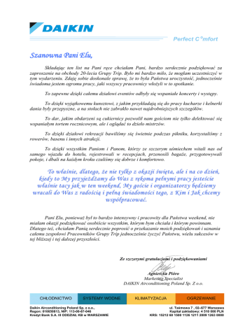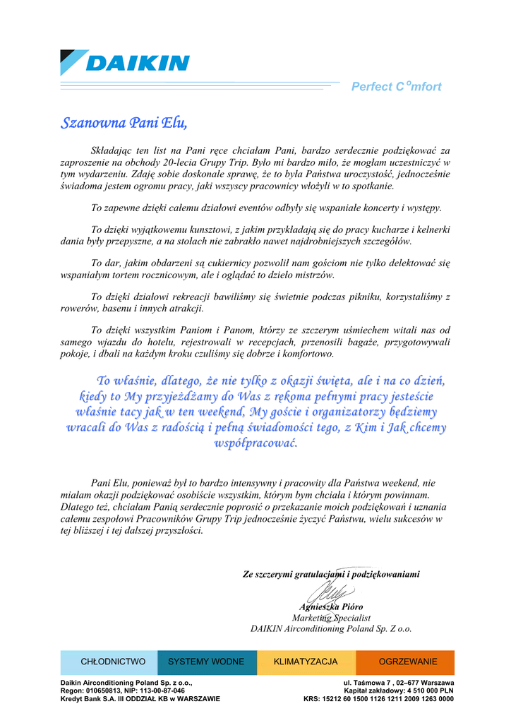 Perfect C omfort Szanowna Pani Elu, Składając ten list na Pani ręce chciałam Pani, bardzo serdecznie podziękować za zaproszenie na obchody 20-lecia Grupy Trip. Było mi bardzo miło, że mogłam uczestniczyć w tym wydarzeniu. Zdaję sobie doskonale sprawę, że to była Państwa uroczystość, jednocześnie świadoma jestem ogromu pracy, jaki wszyscy pracownicy włożyli w to spotkanie. To zapewne dzięki całemu działowi eventów odbyły się wspaniałe koncerty i występy. To dzięki wyjątkowemu kunsztowi, z jakim przykładają się do pracy kucharze i kelnerki dania były przepyszne, a na stołach nie zabrakło nawet najdrobniejszych szczegółów. To dar, jakim obdarzeni są cukiernicy pozwolił nam gościom nie tylko delektować się wspaniałym tortem rocznicowym, ale i oglądać to dzieło mistrzów. To dzięki działowi rekreacji bawiliśmy się świetnie podczas pikniku, korzystaliśmy z rowerów, basenu i innych atrakcji. To dzięki wszystkim Paniom i Panom, którzy ze szczerym uśmiechem witali nas od samego wjazdu do hotelu, rejestrowali w recepcjach, przenosili bagaże, przygotowywali pokoje, i dbali na każdym kroku czuliśmy się dobrze i komfortowo. To właśnie, dlatego, że nie tylko z okazji święta, ale i na co dzień, k i ed y t o M y p r z y j e ż d ż a m y d o W a s z r ę k o m a p e ł n y m i p r a c y j e s t e ś c i e w ł a ś n i e t a c y j a k w te n w e e k e n d , M y g o ś c i e i o r g a n i z a t o r z y b ę d z i e m y wracali do Was z radością i pełną świadomości tego, z Kim i Jak chcemy współpracować. Pani Elu, ponieważ był to bardzo intensywny i pracowity dla Państwa weekend, nie miałam okazji podziękować osobiście wszystkim, którym bym chciała i którym powinnam. Dlatego też, chciałam Panią serdecznie poprosić o przekazanie moich podziękowań i uznania całemu zespołowi Pracowników Grupy Trip jednocześnie życzyć Państwu, wielu sukcesów w tej bliższej i tej dalszej przyszłości. Ze szczerymi gratulacjami i podziękowaniami Agnieszka Pióro Marketing Specialist DAIKIN Airconditioning Poland Sp. Z o.o. CHŁODNICTWO SYSTEMY WODNE Daikin Airconditioning Poland Sp. z o.o., Regon: 010650813, NIP: 113-00-87-046 Kredyt Bank S.A. III ODDZIAŁ KB w WARSZAWIE KLIMATYZACJA OGRZEWANIE ul. Taśmowa 7 , 02–677 Warszawa Kapitał zakładowy: 4 510 000 PLN KRS: 15212 60 1500 1126 1211 2009 1263 0000