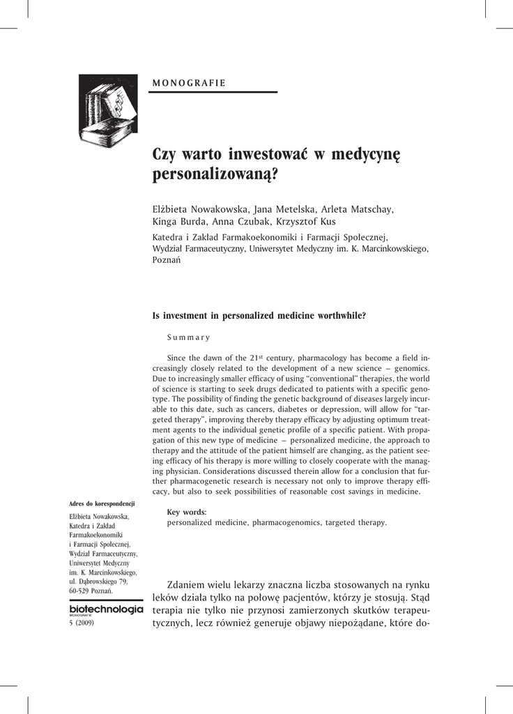 MONOGRAFIE Czy warto inwestowaæ w medycynê personalizowan¹? El¿bieta Nowakowska, Jana Metelska, Arleta Matschay, Kinga Burda, Anna Czubak, Krzysztof Kus Katedra i Zak³ad Farmakoekonomiki i Farmacji Spo³ecznej, Wydzia³ Farmaceutyczny, Uniwersytet Medyczny im. K. Marcinkowskiego, Poznañ Is investment in personalized medicine worthwhile? Summary Since the dawn of the 21st century, pharmacology has become a field increasingly closely related to the development of a new science – genomics. Due to increasingly smaller efficacy of using “conventional” therapies, the world of science is starting to seek drugs dedicated to patients with a specific genotype. The possibility of finding the genetic background of diseases largely incurable to this date, such as cancers, diabetes or depression, will allow for “targeted therapy”, improving thereby therapy efficacy by adjusting optimum treatment agents to the individual genetic profile of a specific patient. With propagation of this new type of medicine – personalized medicine, the approach to therapy and the attitude of the patient himself are changing, as the patient seeing efficacy of his therapy is more willing to closely cooperate with the managing physician. Considerations discussed therein allow for a conclusion that further pharmacogenetic research is necessary not only to improve therapy efficacy, but also to seek possibilities of reasonable cost savings in medicine. Adres do korespondencji El¿bieta Nowakowska, Katedra i Zak³ad Farmakoekonomiki i Farmacji Spo³ecznej, Wydzia³ Farmaceutyczny, Uniwersytet Medyczny im. K. Marcinkowskiego, ul. D¹browskiego 79, 60-529 Poznañ. 5 (2009) Key words: personalized medicine, pharmacogenomics, targeted therapy. Zdaniem wielu lekarzy znaczna liczba stosowanych na rynku leków dzia³a tylko na po³owê pacjentów, którzy je stosuj¹. St¹d terapia nie tylko nie przynosi zamierzonych skutków terapeutycznych, lecz równie¿ generuje objawy niepo¿¹dane, które do- Czy warto inwestowaæ w medycynê personalizowan¹? datkowo zwiêkszaj¹ koszty leczenia choroby. Na podstawie badañ przeprowadzonych w Stanach Zjednoczonych wykazano, ¿e objawy uboczne stosowanych leków wystêpowa³y u oko³o 6,7% hospitalizowanych chorych i powodowa³y tylko w USA oko³o 100 tys. zgonów rocznie (1). Stwierdzono równie¿, ¿e przyczyn¹ objawów ubocznych mog¹ byæ czynniki genetyczne, a koszty leczenia tych objawów oceniono w USA na 100 mld USD rocznie (1). Wspó³czesna medycyna poszukuje zatem nowych leków, nowych technologii medycznych uwzglêdniaj¹cych ró¿nice farmakogenetyczne, których stosowanie stwarza najwiêksze prawdopodobieñstwo odniesienia korzyœci terapeutycznych i najmniejsze prawdopodobieñstwo wyst¹pienia reakcji niepo¿¹danych. Pamiêtaæ nale¿y, ¿e dla skutecznoœci terapeutycznej istotne znaczenie maj¹ indywidualne reakcje na leki uwarunkowane genetycznie. Warto zauwa¿yæ, ¿e ca³kowite koszty wykonywanych badañ genetycznych w ostatnich latach znacz¹co malej¹. Mo¿na spodziewaæ siê, ¿e w miejscu dzisiejszej terapii objawowo-przyczynowej pojawi siê mo¿liwoœæ wykonania profili genetycznych, ukierunkowanych na „osobiste” mapy genetyczne znane równie¿ pod nazw¹ „genomiki na ¿¹danie”. Oferuj¹ce je firmy korzystaj¹ z popularnoœci badañ, w których mo¿na ustaliæ powi¹zania pomiêdzy specyficznymi kombinacjami genów a sk³onnoœciami do okreœlonych schorzeñ. U cz³owieka w trakcie ca³ego ¿ycia ulega ekspresji oko³o 30 tysiêcy genów (2). Niekiedy dochodzi do nieprawid³owej ekspresji genów ze wzglêdu na wrodzony defekt genetyczny, b¹dŸ nabyty w wyniku ekspozycji na czynniki chemiczne lub fizyczne. Mo¿e to doprowadziæ do rozwoju chorób takich jak nowotwory lub schorzenia uk³adu kr¹¿enia (2). Na podstawie uzyskanych w tym zakresie wyników badañ wskazuje siê na istotne znaczenie czynników genetycznych w etiopatogenezie takich schorzeñ jak schizofrenia, depresja, astma, choroba Alzheimera, nadciœnienie têtnicze, osteoporoza, cukrzyca, czy zespó³ nerczycowy. Jednoczeœnie stwierdzono, ¿e skutecznoœæ terapii w tych schorzeniach jest daleka od optymalnej. Bior¹c pod uwagê wysokie koszty leczenia tych chorób i powa¿ne konsekwencje objawów ubocznych leków idea indywidualnej farmakoterapii w ramach tzw. medycyny personalizowanej (ang. Personalized Medicine) jest wielce obiecuj¹ca (3). Uwzglêdniaj¹c bowiem indywidualny profil genetyczny pacjenta bêdzie mo¿na skutecznie i bezpiecznie leczyæ okreœlaj¹c np. optymaln¹ dawkê œrodków przeciwkrzepliwych, a tym samym zapobiegaj¹c wewnêtrznym krwotokom wywo³anym ewentualnym przedawkowaniem leków (np. warfaryna). Stwierdzono, ¿e istniej¹ miêdzyosobnicze ró¿nice w zakresie transportu leku do jego miejsca dzia³ania, wskutek czego mo¿e znacz¹co siê zmieniæ skutecznoœæ preparatu i mog¹ nasiliæ siê dzia³ania niepo¿¹dane. Wspomniane ró¿nice mog¹ byæ wynikiem odmiennoœci dzia³ania zastosowanego leku na docelowy narz¹d, odpowiedzi¹ organizmu na schorzenie lub stosowanie innych preparatów. W medycynie personalizowanej opartej na indywidualizowanym podejœciu do pacjenta konieczne jest postawienie precyzyjnej diagnozy i rokowañ dla chorego, a nastêpnie ustalenie odpowiednio dobranego schematu terapeutycznego i zintensyfikowanego, personaBIOTECHNOLOGIA – MONOGRAFIE 5 (2009) 51 El¿bieta Nowakowska i inni lizowanego leczenia. Dane na temat skutecznoœci i bezpieczeñstwa terapii uzupe³nione wiedz¹ o indywidualnej reakcji chorego na leczenie (odpowiedŸ na lek) determinuj¹ sukces terapeutyczny. OdpowiedŸ na lek (ewentualnie ich zró¿nicowanie) opiera siê na analizie genotypu i fenotypu œrodowiskowego, rozwijaj¹cego siê z genów tzn. indywidualna odpowiedŸ na lek zale¿y od z³o¿onych interakcji pomiêdzy czynnikami œrodowiskowymi a genetycznymi, pojedynczo lub w kombinacjach i w konsekwencji musi doprowadziæ do wyboru w³aœciwego lek