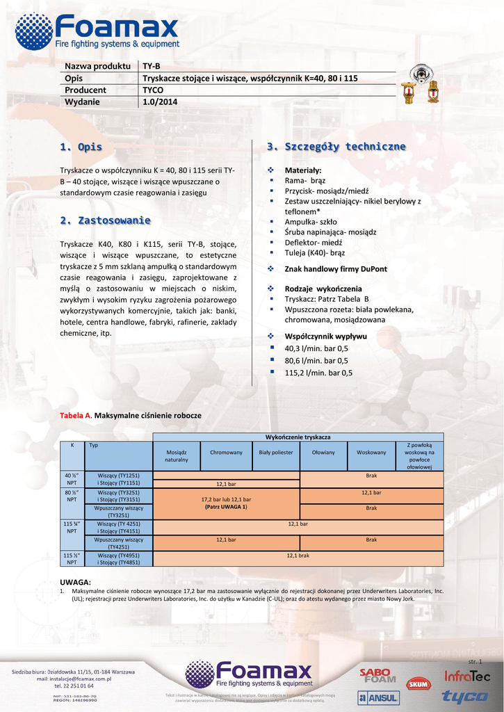Nazwa produktu Opis Producent Wydanie TY-B Tryskacze stojące i wiszące, współczynnik K=40, 80 i 115 TYCO 1.0/2014 1. Opis 3. Szczegóły techniczne Tryskacze o współczynniku K = 40, 80 i 115 serii TYB – 40 stojące, wiszące i wiszące wpuszczane o standardowym czasie reagowania i zasięgu 2. Zastosowanie Tryskacze K40, K80 i K115, serii TY-B, stojące, wiszące i wiszące wpuszczane, to estetyczne tryskacze z 5 mm szklaną ampułką o standardowym czasie reagowania i zasięgu, zaprojektowane z myślą o zastosowaniu w miejscach o niskim, zwykłym i wysokim ryzyku zagrożenia pożarowego wykorzystywanych komercyjnie, takich jak: banki, hotele, centra handlowe, fabryki, rafinerie, zakłady chemiczne, itp. Materiały: Rama- brąz Przycisk- mosiądz/miedź Zestaw uszczelniający- nikiel berylowy z teflonem* Ampułka- szkło Śruba napinająca- mosiądz Deflektor- miedź Tuleja (K40)- brąz Znak handlowy firmy DuPont Rodzaje wykończenia Tryskacz: Patrz Tabela B Wpuszczona rozeta: biała powlekana, chromowana, mosiądzowana Współczynnik wypływu 40,3 l/min. bar 0,5 80,6 l/min. bar 0,5 115,2 l/min. bar 0,5 Tabela A. Maksymalne ciśnienie robocze Wykończenie tryskacza K Typ Mosiądz naturalny 40 ½” NPT Wiszący (TY1251) i Stojący (TY1151) 80 ½” NPT Wiszący (TY3251) i Stojący (TY3151) Wpuszczany wiszący (TY3251) Wiszący (TY 4251) i Stojący (TY4151) Wpuszczany wiszący (TY4251) Wiszący (TY4951) i Stojący (TY4851) 115 ¾” NPT 115 ½” NPT Chromowany Biały poliester Ołowiany Woskowany Z powłoką woskową na powłoce ołowiowej Brak 12,1 bar 12,1 bar 17,2 bar lub 12,1 bar (Patrz UWAGA 1) Brak 12,1 bar 12,1 bar Brak 12,1 brak UWAGA: 1. Maksymalne ciśnienie robocze wynoszące 17,2 bar ma zastosowanie wyłącznie do rejestracji dokonanej przez Underwriters Laboratories, Inc. (UL); rejestracji przez Underwriters Laboratories, Inc. do użytku w Kanadzie (C-UL); oraz do atestu wydanego przez miasto Nowy Jork. str. 1 Tekst i ilustracje w karcie katalogowej nie są wiążące. Opisy i zdjęcia w kartach katalogowych mogą zawierać wyposażenia dodatkowe, które jest dostępne wyłącznie za dodatkową opłatą. 4. Certyfikaty, dopuszczenia Tabela B. Wykaz rejestrów i atestów laboratoryjnych tryskaczy K40 i K60 Wykończenie Tryskacza, (patrz uwaga 8) K Typ Wiszący (TY1251) 40 ½” i stojący (TY1151) NPT Wiszący (TY3251) i stojący (TY3151) 80 ½” NPT Wpuszczany wiszący (TY3251)* Wiszący (TY4251) i stojący (TY4151) 115 ¾” NPT Wpuszczany wiszący (TY4251)* 115 ½” NPT Wiszący (TY4951) i stojący (TY4851) Temperatura Płyn w ampułce 57°C 68°C 79°C 93°C 141°C 182°C Pomarańcz. Czerwony Żółty Zielony Niebieski Filetoworóżowy 57°C 68°C 79°C 93°C 141°C 182°C 57°C 68°C 79°C 93°C 141°C 57°C Pomarańcz. Czerwony Żółty Zielony Niebieski Fioletoworóżowy Pomarańcz. Czerwony Żółty Zielony Niebieski Pomarańcz. 68°C 79°C 93°C 141°C 182°C 57°C 68°C 79°C 93°C 141°C 57°C 68°C 79°C 93°C 141°C 182°C Czerwony Żółty Zielony Niebieski Fioletoworóżowy Pomarańcz. Czerwony Żółty Zielony Niebieski Pomarańcz. Czerwony Żółty Zielony Niebieski Fioletoworóżowy Mosiądz naturalny Chromowany Biały** poliester Ołowiany Woskowany 1,2,3 Z powłoką woskową na powłoce ołowiowej Brak 1,2 1,2,3,5 1,2,3,4,5,6,7 1,2,3,5 1**,2**,3**,5** Brak 1,2,3,4,5 1,2,4,5 Brak 1,2 1,2,3,5 1,2,3,4,5,6,7 1,2,5 1,2,5 1**,2**,3**,5** 1**,2**,5** Brak 1,2,3,4,5 Brak 1,2 1,2,3,5 Brak UWAGI: 1. 2. 3. 4. 5. 6. 7. 8. * ** Na liście Underwriters Laboratories Inc. (UL) Na liście Underwriters Laboratories Inc. do użytku w Kanadzie (C-UL) Zatwierdzone przez Factory Mutual Research Corporation (FM) Zatwierdzone przez Loss Prevention Certification Board (LPCB Ref. No. 007k/03) Zatwierdzone przez Miasto Nowy Jork zgodnie z MEA 354-01-E Zatwierdzone przez VdS (odnośnie szegółów proszę się skontaktować z Tyco Fire $ Building Products, Enschede, Holandia, tel.+31-53-4284444/faks +31-53-428-3377 Zatwierdzone przez Loss Prevention Certification Board (LPCB Ref. No. 094a/05) W przypadku tryskaczy z powłoką poliestrową, ołowiową, woskową na powłoce ołowiowej oznaczonych jako umieszczone na liście UL I C-UL, są one tam umieszczone jako tryskacze odporne na korozję. W przypadku tryskaczy z powłoką ołowiową, woskową i woskową na powłoce ołowiowej oznaczonych jako zatwierdzone przez FM, zostały one zatwierdzone jako tryskacze odporne na korozję. Zamontowane z rozetą wpuszczoną z pełną regulacją 19mm (¾”), odpowiednio, Style 10(½” NPT) lub Style 40 (¾” NPT) Maksymalna temperatura sufitu 66°C 5. Informacje projektowe Działanie tryskacza Szklana ampułka zawiera ciecz, która zwiększa objętość pod wpływem ciepła. Gdy osiągnięta zostaje określona wartość znamionowa temperatury, ciecz rozszerza się rozrywając szklaną ampułkę, uruchamiając tryskacz i umożliwiając wypływ wody. Kryteria projektowe Tryskacze wiszące i stojące serii TY-B są przeznaczone do systemów ochrony przeciwpożarowej zaprojektowanych zgodnie z normami instalacyjnymi uznanymi przez odpowiednie instytucje rejestrujące i atestujące (np. rejestracja w UL odbywa się w oparciu o wymogi NFPA 13, natomiast aprobata FM oparta jest na specyfikacjach FM str. 2 Tekst i ilustracje w karcie katalogowej nie są wiążące. Opisy i zdjęcia w kartach katalogowych mogą zawierać wyposażenia dodatkowe, które jest dostępne wyłącznie za dodatkową opłatą. Loss Prevention Data Sheets). Do wpuszczanych instalacji wiszących mają być wyłącznie wykorzystywane, odpowiednio, rozety wpuszczane Style 10 lub 40. Montaż tryskaczy Tryskacze wiszące i stojące serii TY-B należy montować zgodnie z poniższą instrukcją: 1. Tryskacze wiszące należy instalować w pozycji wiszącej, a stojące w pozycji stojącej 2. Po nałożeniu szczeliwa na gwint rury, należy ręcznie wkręcić tryskacz w złączkę 3. Należy dokręcić tryskacz w złączce wył
