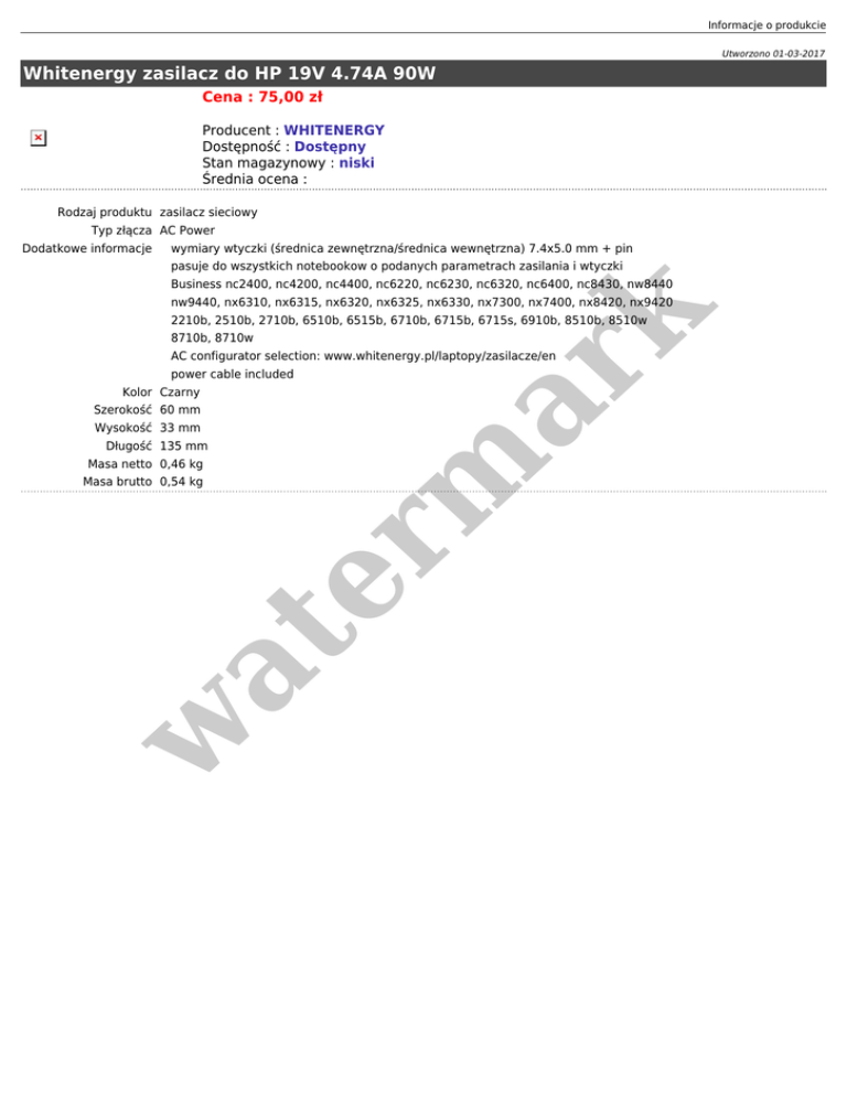 Informacje o produkcie Utworzono 01-03-2017 Whitenergy zasilacz do HP 19V 4.74A 90W Cena : 75,00 zł Producent : WHITENERGY Dostępność : Dostępny Stan magazynowy : niski Średnia ocena : Rodzaj produktu zasilacz sieciowy Typ złącza AC Power Dodatkowe informacje wymiary wtyczki (średnica zewnętrzna/średnica wewnętrzna) 7.4x5.0 mm + pin pasuje do wszystkich notebookow o podanych parametrach zasilania i wtyczki Business nc2400, nc4200, nc4400, nc6220, nc6230, nc6320, nc6400, nc8430, nw8440 er m ar k nw9440, nx6310, nx6315, nx6320, nx6325, nx6330, nx7300, nx7400, nx8420, nx9420 2210b, 2510b, 2710b, 6510b, 6515b, 6710b, 6715b, 6715s, 6910b, 8510b, 8510w 8710b, 8710w AC configurator selection: www.whitenergy.pl/laptopy/zasilacze/en power cable included Kolor Czarny Szerokość 60 mm Wysokość 33 mm Długość 135 mm Masa netto 0,46 kg w at Masa brutto 0,54 kg