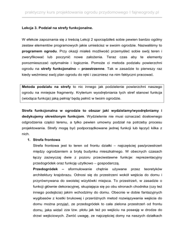 praktyczny kurs projektowania ogrodu przydomowego I fajneogrody.pl Lekcja 3. Podział na strefy funkcjonalne. W efekcie zapoznania się z treścią Lekcji 2 sporządziłeś sobie pewien bardzo ogólny zestaw elementów programowych jakie umieścisz w swoim ogrodzie. Nazwaliśmy to programem ogrodu. Przy okazji miałeś możliwość przemyśleć sobie swój teren i zweryfikować lub poczynić nowe założenia. Teraz czas aby te elementy porozmieszczać optymalnie i logicznie. Pomoże ci metoda podziału powierzchni ogrodu na strefy funkcjonalno – przestrzenne. Tak w zasadzie to pierwszy raz kiedy weźmiesz swój plan ogrodu do ręki i zaczniesz na nim faktyczni pracować. Metoda podziału na strefy to nic innego jak podzielenie powierzchni naszego ogrodu na mniejsze fragmenty. Kryterium wyodrębniania tych stref stanowi funkcja (wiodąca funkcja) jaką pełnią/ będą pełnić w twoim ogrodzie. Strefa funkcjonalna w ogrodzie to obszar jaki wydzielamy/wyodrębniamy i dedykujemy określonym funkcjom. Wydzielenie nie musi oznaczać dosłownego odgrodzenia części terenu, a tylko pewien umowny podział na potrzeby procesu projektowania. Strefy mogą być podporządkowane jednej funkcji lub łączyć kilka z nich. 1. Strefa frontowa Strefa frontowa jest to teren od frontu działki – najczęściej pas/przestrzeń między ogrodzeniem a bryłą budynku mieszkalnego. W obecnych czasach łączy zazwyczaj dwie z pozoru przeciwstawne funkcje: reprezentacyjny przedogródek oraz funkcję użytkowo – gospodarczą. Przedogródek – sformułowanie chętnie używane przez teoretyków architektury krajobrazu. Odnosi się do przestrzeni wokół wejścia do domu i przyrównywana do swoistej wizytówki miejsca. To przestrzeń, w zasadzie o funkcji głównie dekoracyjnej, skupiająca się po obu stronach chodnika (czy też innego podejścia) jakim wchodzimy do domu. Obecnie w dobie fantazyjnych wygibasów z kostki brukowej i przeróżnych metod rozwiązywania wejścia do domu można przyjąć, ze przedogródek to cała zielona przestrzeń od frontu domu, jaka widać zza tzw. płotu jak też po wejściu na posesję w drodze do drzwi wejściowych. Zwróć uwagę, ze najczęściej domy na naszych działkach praktyczny kurs projektowania ogrodu przydomowego I fajneogrody.pl lokalizujemy tak, aby z przodu zostawić jak najmniej terenu, a cały ogród „właściwy” rozgrywa się z tyłu domu, ew. z boków także. I bardzo dobrze! Funkcja użytkowo – gospodarcza – jest związana głównie z lokalizowanym od frontu wjazdem do garażu i podjazdem. Towarzysz im często altana śmietnikowa. Podjazd staje się wówczas często wykonywaniem różnych czynności gospodarczych tj. sprzątanie samochodu. 2. Strefa rekreacyjno – wypoczynkowa – spotyka się czasem w literaturze rozdzielanie tych funkcji, co jest nie zbyt uzasadnione, jako że obecnie są one tożsame. Strefa ta znajduje się najczęściej z tyłu budynku mieszkalnego i służy domownikom do uprawiania sportu, rekreacji, odpoczynku itp. Najczęściej jej podstawę stanowi trawnik. Można się pokusić o różnorakie podziały tej strefy w przypadku dużych ogrodów. Można wówczas wyróżnić „podstrefę” odpoczynku biernego, czynnego, strefę zabaw dla dzieci itd. Strefa rekreacyjno – wypoczynkowa stanowi także funkcjonalne przedłużenie salonu/pokoju dziennego i w „sezonie” spełnia takie funkcje. 3. Strefa gospodarcza – występuje głównie w obiektach na terenach wiejskich, gdzie właściciele prowadzą działalność rolniczą, co skutkuje koniecznością lokalizowania szeregu zabudowań i urządzeń w obrębie tzw. siedliska. Często funkcja ta jest lokalizowana z boku budynku mieszkalnego lub na jego tyłach (wówczas rekreacja jest przenoszona na bok, lub obie funkcje dzielą się terenem na tyłach). Często części gospodarczej towarzyszy/sąsiaduje tzw. strefa użytkowa. 4. Strefa użytkowa – miejsce uprawy warzyw i owoców. Obejmuje warzywnik, sad, kompostownik i tego typu elementy użytkowe. Coraz częściej – zwłaszcza właściciele małych ogrodów oraz mieszkańcy miast i terenów podmiejskich – rezygnują całkowicie z funkcji użytkowej, lub ograniczają ją do kilku drzewek lub krzewów owocowych. Warzywnik zastępuje modna uprawa ziół lub uprawa w pojemnikach, donicach. 5. Strefa komunikacyjna – to nieco naciągana strefa. Ciężko w zasadzie mówić tu o strefie, gdyż przez strefą rozumiemy jakąś określoną powierzchnię trenu. praktyczny kurs projektowania ogrodu przydomowego I fajneogrody.pl Niemniej jednak gdyby patrzeć na strefy przez pryzmat funkcji to jest to jedna z najważniejszych. Komunikacja ma przeróżną postać, a jej zadaniem jest łączenie poszczególnych elementów ogrodu oraz łączenie ogrodu z domem i otoczeniem. Chodniki, ścieżki, przedepty. Bruk, kamień, żwir, drewno, beton. To wszystko stosujemy tworząc funkcję komunikacyjną. Strefa izolacyjna – najczęściej ma postać pasa wysokiej zieleni ogradzającego całość ogrodu od otoczenia (najczęściej wzdłuż) ogrodzenia. Może też wystąpić we wnętrzu ogrodu oddzielając poszczególne strefy od siebie, lub służąc wyizolowaniu wybranej np. gospodarczej. Zwróć szczególną uwagę na tę strefę ponieważ zazwyczaj cenimy sobie prywatność i możliwość odcięcia od otoczenia. Warto pamiętać aby bezpośrednio przy ogrodzeniu zaplanować roślinność raczej wyższą, która nas oddzieli wizualnie, akustycznie i funkcjonalnie od otoczenia. Chyba, ze celowo zamierzasz się z nim łączyć. Taki bufor może stanowić np. żywopłot z tuj (żywotników) lub nasadzenia z gęstych roślin krzewiastych. praktyczny kurs projektowania ogrodu przydomowego I fajneogrody.pl Nie zawsze potrzebujesz wszystkich stref, a czasem może zdefiniujesz zupełnie nowe, spoza podstawowej klasyfikacji. Może się okazać, że wyróżnisz 2-3 klasyczne strefy i dodasz dwie zupełnie nowe, wynikające z twoich, indywidualny