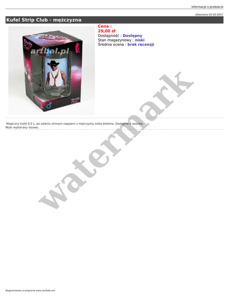 Informacje o produkcie Utworzono 01-03-2017 Kufel Strip Club - mężczyzna Cena : 29,00 zł er m ar k Dostępność : Dostępny Stan magazynowy : niski Średnia ocena : brak recenzji w at Magiczny kufel 0,5 L, po zalaniu zimnym napojem z mężczyzny znika bielizna. Dostępne 6 wzorów. Wzór wybierany losowo. Wygenerowano w programie www.oscGold.com
