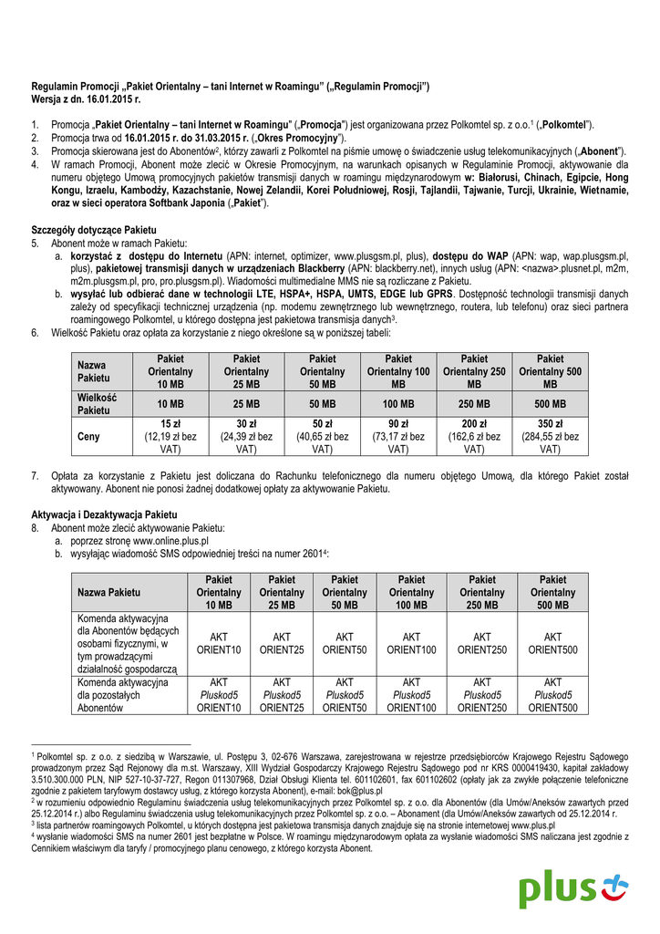 Regulamin Promocji „Pakiet Orientalny – tani Internet w Roamingu” („Regulamin Promocji”) Wersja z dn. 16.01.2015 r. 1. 2. 3. 4. Promocja „Pakiet Orientalny – tani Internet w Roamingu" („Promocja") jest organizowana przez Polkomtel sp. z o.o. 1 („Polkomtel”). Promocja trwa od 16.01.2015 r. do 31.03.2015 r. („Okres Promocyjny”). Promocja skierowana jest do Abonentów2, którzy zawarli z Polkomtel na piśmie umowę o świadczenie usług telekomunikacyjnych („Abonent”). W ramach Promocji, Abonent może zlecić w Okresie Promocyjnym, na warunkach opisanych w Regulaminie Promocji, aktywowanie dla numeru objętego Umową promocyjnych pakietów transmisji danych w roamingu międzynarodowym w: Białorusi, Chinach, Egipcie, Hong Kongu, Izraelu, Kambodży, Kazachstanie, Nowej Zelandii, Korei Południowej, Rosji, Tajlandii, Tajwanie, Turcji, Ukrainie, Wietnamie, oraz w sieci operatora Softbank Japonia („Pakiet”). Szczegóły dotyczące Pakietu 5. Abonent może w ramach Pakietu: a. korzystać z dostępu do Internetu (APN: internet, optimizer, www.plusgsm.pl, plus), dostępu do WAP (APN: wap, wap.plusgsm.pl, plus), pakietowej transmisji danych w urządzeniach Blackberry (APN: blackberry.net), innych usług (APN: <nazwa>.plusnet.pl, m2m, m2m.plusgsm.pl, pro, pro.plusgsm.pl). Wiadomości multimedialne MMS nie są rozliczane z Pakietu. b. wysyłać lub odbierać dane w technologii LTE, HSPA+, HSPA, UMTS, EDGE lub GPRS. Dostępność technologii transmisji danych zależy od specyfikacji technicznej urządzenia (np. modemu zewnętrznego lub wewnętrznego, routera, lub telefonu) oraz sieci partnera roamingowego Polkomtel, u którego dostępna jest pakietowa transmisja danych3. 6. Wielkość Pakietu oraz opłata za korzystanie z niego określone są w poniższej tabeli: Nazwa Pakietu Wielkość Pakietu Ceny 7. Pakiet Orientalny 10 MB Pakiet Orientalny 25 MB Pakiet Orientalny 50 MB Pakiet Orientalny 100 MB Pakiet Orientalny 250 MB Pakiet Orientalny 500 MB 10 MB 25 MB 50 MB 100 MB 250 MB 500 MB 15 zł (12,19 zł bez VAT) 30 zł (24,39 zł bez VAT) 50 zł (40,65 zł bez VAT) 90 zł (73,17 zł bez VAT) 200 zł (162,6 zł bez VAT) 350 zł (284,55 zł bez VAT) Opłata za korzystanie z Pakietu jest doliczana do Rachunku telefonicznego dla numeru objętego Umową, dla którego Pakiet został aktywowany. Abonent nie ponosi żadnej dodatkowej opłaty za aktywowanie Pakietu. Aktywacja i Dezaktywacja Pakietu 8. Abonent może zlecić aktywowanie Pakietu: a. poprzez stronę www.online.plus.pl b. wysyłając wiadomość SMS odpowiedniej treści na numer 26014: Nazwa Pakietu Komenda aktywacyjna dla Abonentów będących osobami fizycznymi, w tym prowadzącymi działalność gospodarczą Komenda aktywacyjna dla pozostałych Abonentów Pakiet Orientalny 10 MB Pakiet Orientalny 25 MB Pakiet Orientalny 50 MB Pakiet Orientalny 100 MB Pakiet Orientalny 250 MB Pakiet Orientalny 500 MB AKT ORIENT10 AKT ORIENT25 AKT ORIENT50 AKT ORIENT100 AKT ORIENT250 AKT ORIENT500 AKT Pluskod5 ORIENT10 AKT Pluskod5 ORIENT25 AKT Pluskod5 ORIENT50 AKT Pluskod5 ORIENT100 AKT Pluskod5 ORIENT250 AKT Pluskod5 ORIENT500 Polkomtel sp. z o.o. z siedzibą w Warszawie, ul. Postępu 3, 02-676 Warszawa, zarejestrowana w rejestrze przedsiębiorców Krajowego Rejestru Sądowego prowadzonym przez Sąd Rejonowy dla m.st. Warszawy, XIII Wydział Gospodarczy Krajowego Rejestru Sądowego pod nr KRS 0000419430, kapitał zakładowy 3.510.300.000 PLN, NIP 527-10-37-727, Regon 011307968, Dział Obsługi Klienta tel. 601102601, fax 601102602 (opłaty jak za zwykłe połączenie telefoniczne zgodnie z pakietem taryfowym dostawcy usług, z którego korzysta Abonent), e-mail: [email protected] 2 w rozumieniu odpowiednio Regulaminu świadczenia usług telekomunikacyjnych przez Polkomtel sp. z o.o. dla Abonentów (dla Umów/Aneksów zawartych przed 25.12.2014 r.) albo Regulaminu świadczenia usług telekomunikacyjnych przez Polkomtel sp. z o.o. – Abonament (dla Umów/Aneksów zawartych od 25.12.2014 r. 3 lista partnerów roamingowych Polkomtel, u których dostępna jest pakietowa transmisja danych znajduje się na stronie internetowej www.plus.pl 4 wysłanie wiadomości SMS na numer 2601 jest bezpłatne w Polsce. W roamingu międzynarodowym opłata za wysłanie wiadomości SMS naliczana jest zgodnie z Cennikiem właściwym dla taryfy / promocyjnego planu cenowego, z którego korzysta Abonent. 1 c. dzwoniąc do Działu Obsługi Klienta pod numer +48 601102601 (z dowolnego telefonu) 5, d. za pośrednictwem Doradcy Biznesowego Plus. 9. Wybrany przez Abonenta Pakiet zostanie aktywowany od godziny 00:00 czasu polskiego dnia następnego po przyjęciu przez Polkomtel zlecenia jego aktywacji. 10. Aktywowany Pakiet będzie dostępny przez jeden pełny Okres rozliczeniowy, przy czym w przypadku, gdy aktywacja Pakietu nastąpi w trakcie trwania Okresu rozliczeniowego, to Pakiet będzie dostępny od dnia jego aktywacji do ostatniego dnia pierwszego pełnego Okresu rozliczeniowego następującego po aktywacji Pakietu. 11. Abonent ma możliwość uruchomienia nieograniczonej liczby Pakietów. Jeżeli Abonent uruchomi Pakiety różnej wielkości w pierwszej kolejności wykorzystywany jest Pakiet o większej wartości. Zasady działania Pakietu 12. Pobrane i wysłane dane w ramach Pakietu naliczane są oddzielnie (w ramach jednej sesji w rozliczeniu dziennym). Transmisja danych w Pakiecie jest rozliczana zgodnie z inkrementem obowiązującym dla danego APN-u zgodnie z Cennikiem właściwym dla taryfy/promocyjnego planu cenowego, z którego korzysta Abonent. 13. Po wykorzystaniu liczby MB w ramach uruchomionego Pakietu/Pakietów opłaty za transmisję danych naliczane są zgodnie z Cennikiem właściwym dla taryfy /promocyjnego planu cenowego, z którego korzysta Abonent, chyba, że Abonent posiada aktywny inny pakiet transmisji danych w roamingu międzynarodowym. 14. Abonent może sprawdzić liczbę MB pozostałych do końca Okresu rozliczeniowego w Pakiecie 