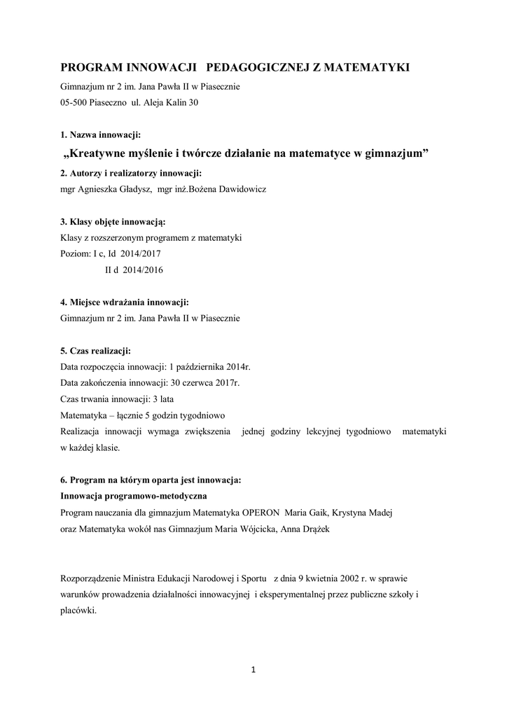 PROGRAM INNOWACJI PEDAGOGICZNEJ Z MATEMATYKI Gimnazjum nr 2 im. Jana Pawła II w Piasecznie 05-500 Piaseczno ul. Aleja Kalin 30 1. Nazwa innowacji: „Kreatywne myślenie i twórcze działanie na matematyce w gimnazjum” 2. Autorzy i realizatorzy innowacji: mgr Agnieszka Gładysz, mgr inż.Bożena Dawidowicz 3. Klasy objęte innowacją: Klasy z rozszerzonym programem z matematyki Poziom: I c, Id 2014/2017 II d 2014/2016 4. Miejsce wdrażania innowacji: Gimnazjum nr 2 im. Jana Pawła II w Piasecznie 5. Czas realizacji: Data rozpoczęcia innowacji: 1 października 2014r. Data zakończenia innowacji: 30 czerwca 2017r. Czas trwania innowacji: 3 lata Matematyka – łącznie 5 godzin tygodniowo Realizacja innowacji wymaga zwiększenia jednej godziny lekcyjnej tygodniowo matematyki w każdej klasie. 6. Program na którym oparta jest innowacja: Innowacja programowo-metodyczna Program nauczania dla gimnazjum Matematyka OPERON Maria Gaik, Krystyna Madej oraz Matematyka wokół nas Gimnazjum Maria Wójcicka, Anna Drążek Rozporządzenie Ministra Edukacji Narodowej i Sportu z dnia 9 kwietnia 2002 r. w sprawie warunków prowadzenia działalności innowacyjnej i eksperymentalnej przez publiczne szkoły i placówki. 1 7. Diagnoza wstępna : Matematyka to nauka, która ma ogromny wpływ na funkcjonowanie człowieka we współczesnym świecie . Wiele zawodów powiązanych jest ściśle z matematyką . Uznałyśmy więc, że już na etapie gimnazjalnym istnieje potrzeba rozwoju młodzieży w kierunku związanym właśnie z tym przedmiotem. Program nasz skierowany jest do młodzieży, która w klasach ze zwiększoną ilością godzin matematyki będzie mogła rozwijać swoje matematyczne zainteresowania a w przyszłości kontynuować je na dalszym etapie kształcenia. Innowacja zakłada rozwijanie umiejętności logicznego myślenia, intuicji, wyobraźni, rozumowania i wnioskowania przydatnych w nauce matematyki. Chcemy pokazać uczniom piękno matematyki przez pokazywanie jej logicznej struktury, zaskakujących pomysłów w poszczególnych zadaniach. Podstawowym elementem naszego programu rozszerzonego są zadania wykraczające poza te standardowe. Pragniemy rozwijać uczniów potrafiących myśleć logicznie, abstrakcyjnie i niestandardowo, posiadających umiejętność szybkiego uczenia, zapamiętywania oraz chęci do zmagania się z zadaniami wykraczającymi poza zakres materiału . Chciałybyśmy, aby dzięki tej innowacji uczniowie w przyszłości chętniej wybierali przedmioty ścisłe, aby nauka była dla nich łatwiejsza i dawała im dużo satysfakcji. 8. Cele programu: Program innowacji jest przeznaczony dla uczniów o zainteresowaniach matematycznych, którzy zadeklarowali chęć uczęszczania do takich klas. Celem innowacji jest: 1. Popularyzowanie wiedzy matematycznej. 2. Rozbudzanie i pogłębianie uzdolnień i zainteresowań matematycznych zdobytych na lekcji wzbogaconych elementami informatyki. 3. Wprowadzenie nowych zagadnień ważnych pojęć i ich własności, które będą przedmiotem nauczania w szkole średniej. 4. Kształtowanie rozumienia i posługiwania się językiem matematyki. 5. Doskonalenie umiejętności matematycznego i twórczego myślenia uczniów. 6. Rozwijanie wyobraźni, myślenia abstrakcyjnego i logicznego rozumowania. 7. Wdrażanie uczniów do samokształcenia i współzawodnictwa. 2 8. Poznanie problemów i zadań dotyczących ważnych pojęć i twierdzeń w matematyce, z którymi uczniowie nie zetkną się w normalnym toku nauki. 9. Kształtowanie umiejętności wykorzystywania zdobytej wiedzy w sytuacjach praktycznych. 10. Rozwijanie umiejętności rozwiązywania zagadnień z matematyki i innych dziedzin życia za pomocą komputera. 9.Zasady innowacji: Na realizację innowacji włączoną w proces nauki i przewidujemy jedną w tygodniu dodatkową godzinę matematyki pozwalającą na codzienne rozszerzanie i pogłębianie wiedzy oraz doskonalenie zdobywanych umiejętności. Zakres realizowanego materiału zostanie poszerzony o treści, których nie ujęto w podstawie programowej, a które są bardzo ważne w dalszej edukacji. Uczniowie będą przyzwyczajani do systematycznej pracy przez codzienne wykonywanie dodatkowych zadań wykraczających poza zakres materiału, przy których otrzymają dużą samodzielność w poszukiwaniu rozwiązań. Rolą nauczyciela będzie ukierunkowanie uczniów na szukanie rozwiązań najprostszych i najbardziej optymalnych oraz bycie przewodnikiem przy spornych interpretacjach. W celu uatrakcyjnienia zajęcia będą wspomagane poprzez wykorzystanie tablicy multimedialnej, komputerów z wykorzystaniem programu GeoGebra - oprogramowania matematycznego do samodzielnego uczenia się i nauczania, z wykorzystaniem interaktywnej grafiki, algebry i arkusza kalkulacyjnego. 10. Zagadnienia z matematyki w poszczególnych klasach realizowane będą zgodnie z programem nauczania dla gimnazjum Matematyka OPERON orazMatematyka wokół nas. Kl I 1. Liczby wymierne Sudoku Tworzenie wzorów (z ułamkami) Ułamki piętrowe Zadania tekstowe bez równań NWD, NWW, algorytm Euklidesa 2. Wyrażenia algebraiczne Wzory skróconego mnożenia Rozkładanie sum algebraicznych na czynniki 3 Trójkąt Pascala Dowodzenie tożsamości i nierówności algebraicznych 3. Równania i nierówności Przedziały i zaznaczanie ich na osi liczbowej Równania i nierówności z wartością bezwzględna Dowodzenie nierówności 4. Geometria Geometria trójkąta Dowodzenie podstawowych twierdzeń Wektory- długość wektora Przesunięcie o dany wektor Kl I I 1.Potęgi i pierwiastki Usuwanie niewymierności z mianownika z zastosowaniem wzorów skróconego mnożenia Rozwiązywanie złożonych zadań tekstowych z zastosowaniem twierdzeń dotyczących potęgowania i pierwiastkowania 2.Równania i układy równań Równania diofantyczne Rozwiązywanie układów równań metodą wyznacznikową Graficzne rozwiązywanie układów równań pierwszego stopnia z dwiema niewiadomymi Grafic
