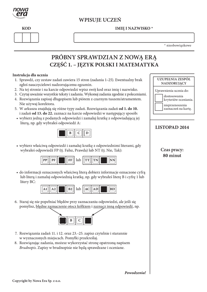 WPISUJE UCZEŃ KOD IMIĘ I NAZWISKO * * nieobowiązkowe PRÓBNY SPRAWDZIAN Z NOWĄ ERĄ CZĘŚĆ 1. – JĘZYK POLSKI I MATEMATYKA Instrukcja dla ucznia 1. Sprawdź, czy zestaw zadań zawiera 15 stron (zadania 1–25). Ewentualny brak zgłoś nauczycielowi nadzorującemu egzamin. 2. Na tej stronie i na karcie odpowiedzi wpisz swój kod oraz imię i nazwisko. 3. Czytaj uważnie wszystkie teksty i zadania. Wykonuj zadania zgodnie z poleceniami. 4. Rozwiązania zapisuj długopisem lub piórem z czarnym tuszem/atramentem. Nie używaj korektora. 5. W arkuszu znajdują się różne typy zadań. Rozwiązania zadań od 1. do 10. i zadań od 13. do 22. zaznacz na karcie odpowiedzi w następujący sposób: • wybierz jedną z podanych odpowiedzi i zamaluj kratkę z odpowiadającą jej literą, np. gdy wybrałeś odpowiedź A: B C D • wybierz właściwą odpowiedź i zamaluj kratkę z odpowiednimi literami, gdy wybrałeś odpowiedź FP (tj. Fałsz, Prawda) lub NT (tj. Nie, Tak): PP PF FF lub TT TN NN • do informacji oznaczonych właściwą literą dobierz informacje oznaczone cyfrą lub literą i zamaluj odpowiednią kratkę, np. gdy wybrałeś literę B i cyfrę 1 lub litery BC: A1 A2 B2 lub AC AD BD 6. Staraj się nie popełniać błędów przy zaznaczaniu odpowiedzi, ale jeśli się pomylisz, błędne zaznaczenie otocz kółkiem i zaznacz inną odpowiedź, np. B C 7. Rozwiązania zadań 11. i 12. oraz 23.–25. zapisz czytelnie i starannie w wyznaczonych miejscach. Pomyłki przekreślaj. 8. Rozwiązując zadania, możesz wykorzystać stronę opatrzoną napisem Brudnopis. Zapisy w brudnopisie nie będą sprawdzane i oceniane. Powodzenia! Copyright by Nowa Era Sp. z o.o. UZUPEŁNIA ZESPÓŁ NADZORUJĄCY Uprawnienia ucznia do: dostosowania kryteriów oceniania. nieprzenoszenia zaznaczeń na kartę. LISTOPAD 2014 Czas pracy: 80 minut Próbny sprawdzian z Nową Erą Część 1. – Język polski i matematyka Olimp – siedziba bogów W poezji greckiej domem bogów jest zawsze Olimp, nie wiadomo jednak do końca, jak wyobrażano sobie to miejsce. Według Iliady1 bogowie mieli tam siedziby wzniesione przez Hefajstosa. Wydaje się, że Olimp był górą, miał bowiem szczyty i granie2, czasami bywał też ośnieżony. Jednakże Odyseja3 opowiada o Otosie i Efialtesie, gigantach będących synami Posejdona, którzy zagrozili, że wydadzą wojnę bogom i umieszczą góry Ossa i Pelion na szczycie Olimpu, aby móc dosięgnąć nieba. Sugeruje to, że bogowie przebywali gdzieś wyżej, w niebie rozpiętym ponad górami. Przyglądając się krajobrazowi Grecji, łatwo pojąć, w jaki sposób jej mieszkańcy wpadli na pomysł, że bogowie mieszkają na szczycie wysokiej i niedostępnej góry. Nazwę Olimp nosi w Grecji kilka masywów – na samym Peloponezie są trzy góry o tej nazwie. Najlepszym kandydatem na mieszkanie bogów jest jednak Olimp położony na granicy Tesalii i Macedonii. Starożytne cywilizacje, pod red. Grega Woolfa, Warszawa 2007. 1Iliada – tytuł starożytnego poematu Homera. 2 Grań – ostry, skalisty grzbiet górski. 3 Odyseja – tytuł starożytnego poematu Homera. Zadanie 1. (0–1) Który tytuł określa główną myśl pierwszego akapitu? Wybierz odpowiedź spośród podanych. A.Olimp w poezji greckiej B. Wyobrażenia o Olimpie C.Opis Olimpu w „Iliadzie” D.Olimp – ośnieżona góra Zadanie 2. (0–1) Oceń, które z poniższych zdań jest fałszywe. Zaznacz F przy zdaniu fałszywym. 1. Ossa i Pelion to synowie Posejdona, którzy zagrozili bogom wojną. F 2. Według Iliady Olimp był górą, na której Hefajstos urządził siedziby bogom. F 3. Istnieje kilka teorii na temat wyglądu i położenia Olimpu – domu bogów. F Zadanie 3. (0–1) Wskaż związek wyrazowy, którym nie można zastąpić nazwy Olimp. Wybierz odpowiedź spośród podanych. A.ośnieżony szczyt B. niedostępna góra C.mieszkanie bogów D.siedziba gigantów PRZENIEŚ ROZWIĄZANIA NA KARTĘ ODPOWIEDZI! 2 z 15 Próbny sprawdzian z Nową Erą Część 1. – Język polski i matematyka Zadanie 4. (0–1) Dokończ zdanie. Wybierz odpowiedź A albo B i jej uzasadnienie spośród 1–2. W zdaniu Przyglądając się krajobrazowi Grecji, łatwo pojąć, w jaki sposób jej mieszkańcy wpadli na pomysł, że bogowie mieszkają na szczycie wysokiej i niedostępnej góry wyraz jej jest A. zaimkiem B. spójnikiem użytym w celu 1. zachowania spójności wypowiedzi. 2. zastąpienia wyrazu Grecja. Zadanie 5. (0–1) Dokończ poniższe zdanie – wybierz odpowiedź spośród podanych. Zdanie Najlepszym kandydatem na mieszkanie bogów jest jednak Olimp położony na granicy Tesalii i Macedonii to A.zdanie pojedyncze rozwinięte. B. zdanie pojedyncze nierozwinięte. C.zdanie złożone podrzędnie. D.zdanie złożone współrzędnie. PRZENIEŚ ROZWIĄZANIA NA KARTĘ ODPOWIEDZI! Jan Brzechwa Konik polny i boża krówka1 Konik polny z bożą krówką Poszli raz ku Kalatówkom2. Patrzą w górę – a tu góra Cała szczytem tonie w chmurach. Konik polny rzekł, pobladłszy: „Popatrz, góra jak się patrzy!” Boża krówka aż struchlała: „Idzie na nas góra cała!” Co tu robić? Konik polny, Do decyzji szybkich zdolny, Rzecze: „Mam ja wyjście proste: Trzeba jej dorównać wzrostem, W walce z górą ten coś wskóra, Kto się stanie sam jak góra!” Szybko wzięli się do dzieła, Boża krówka się nadęła, Rosła, rosła i pęczniała, Wkrótce miała metr bez mała. 3 z 15 Próbny sprawdzian z Nową Erą Część 1. – Język polski i matematyka Rósł też dzielnie jej towarzysz I wciąż pytał: „Ile ważysz?” Bo im przecież z każdą chwilą Przybywało po pięć kilo. Tak więc rośli, rośli, rośli, Aż wyrośli znad zarośli, Aż się stali, daję słowo, Jedno koniem, drugie krową. Jan Brzechwa, Konik polny i boża krówka, [w:] tenże, Zwierzyniec, Katowice 1985. 1Boża krówka – inaczej biedronka. 2 Kalatówki – polana w Tatrach Zachodnich, położona na wysokości ok. 1200 m n.p.m. 