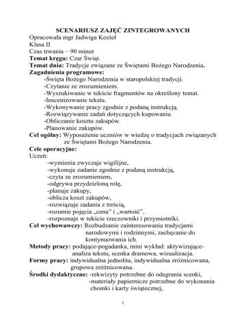 SCENARIUSZ ZAJĘĆ ZINTEGROWANYCH Opracowała mgr Jadwiga Kozieł Klasa II Czas trwania – 90 minut Temat kręgu: Czar Świąt. Temat dnia: Tradycje związane ze Świętami Bożego Narodzenia. Zagadnienia programowe: -Święta Bożego Narodzenia w staropolskiej tradycji. -Czytanie ze zrozumieniem. -Wyszukiwanie w tekście fragmentów na określony temat. -Inscenizowanie tekstu. -Wykonywanie pracy zgodnie z podaną instrukcją. -Rozwiązywanie zadań dotyczących kupowania. -Obliczanie kosztu zakupów. -Planowanie zakupów. Cel ogólny: Wyposażenie uczniów w wiedzę o tradycjach związanych ze Świętami Bożego Narodzenia. Cele operacyjne: Uczeń: -wymienia zwyczaje wigilijne, -wykonuje zadanie zgodnie z podaną instrukcją, -czyta ze zrozumieniem, -odgrywa przydzieloną rolę, -planuje zakupy, -oblicza koszt zakupów, -rozwiązuje zadania z treścią, -rozumie pojęcia „cena” i „wartość”, -rozpoznaje w tekście rzeczowniki i przymiotniki. Cel wychowawczy: Rozbudzanie zainteresowania tradycjami narodowymi i rodzinnymi, zachęcanie do kontynuowania ich. Metody pracy: podające-pogadanka, mini wykład: aktywizująceanaliza tekstu, scenka dramowa, wizualizacja. Formy pracy: indywidualna jednolita, indywidualna zróżnicowana, grupowa zróżnicowana. Środki dydaktyczne: -rekwizyty potrzebne do odegrania scenki, -materiały papiernicze potrzebne do wykonania choinki i karty świątecznej, 1 -instrukcje dla grup, -tekst wiersza „Wieczór wigilijny”, -tekst z lukami, -kartoniki z nazwami i cenami produktów spożywczych, -karty pracy z zadaniami matematycznymi. Umiejętności kluczowe kształtowane w trakcie pracy grupowej: -Komunikacja na płaszczyźnie nauczyciel-uczeń i nauczyciel-grupa. -Wewnętrzna organizacja grupy. -Organizacja i planowanie pracy. -Współpraca w zespole. -Skuteczna komunikacja uczeń-uczeń. -Wysłuchiwanie innych i branie pod uwagę ich punktów widzenia. -Porządkowanie wiedzy. -Komunikacja na płaszczyźnie uczeń-klasa i uczeń-uczeń. PRZEBIEG ZAJĘĆ 1.Podanie grupom tematów i celów zadań oraz instrukcji do ich wykonania. Grupa I (najsłabsi uczniowie) Temat: Ozdabianie choinki zgodnie z opisem. Cele: Uczeń-czyta ze zrozumieniem, -nazywa ozdoby choinkowe, -wybiera elementy potrzebne do wykonania zadania, -porównuje wykonaną przez siebie choinkę z jej opisem. Grupa II i III (średnio zdolni uczniowie) Temat: Uzupełnianie tekstu z lukami na podstawie samodzielnie przeczytanego wiersza pt. ”Wieczór wigilijny”. Cele: Uczeń-czyta ze zrozumieniem, -wyszukuje w tekście wskazane wyrażenia, -wymienia zwyczaje wigilijne, -uzupełnia tekst z lukami, -odczytuje uzupełniony tekst. Grupa IV (najzdolniejsi uczniowie) Temat: „Wigilia w naszym domu”- scenka dramowa. Cele: Uczeń-czyta ze zrozumieniem, -wyszukuje w tekście wskazany fragment, 2 -planuje scenkę dramową, -wybiera potrzebne rekwizyty, -odgrywa przydzieloną rolę. Nauczyciel rozdaje grupom instrukcje i upewnia się, że zostały one właściwie zrozumiane(instrukcje i teksty dołączono do scenariusza). 2.Badanie i przekształcanie problemu. Uczniowie organizują pracę, planują pracę i wykonują zadanie. Nauczyciel dba o sprawny przebieg pracy i wykorzystanie czasu. Udziela wskazówek, ale nie proponuje rozwiązań. 3.Prezentacja. Każda grupa zgodnie z instrukcją prezentuje wykonane zadanie na forum klasy. Nauczyciel obserwuje przebieg prezentacji i jej zgodność z instrukcją. 4.Refleksja. Nauczyciel poprzez pytania zbiera od uczniów informację zwrotną dotyczącą łatwości i trudności zadań, samopoczucia w grupie, wrażeń i refleksji, samooceny. Udziela informacji zwrotnej będącej diagnozą i wsparciem. 5.Śpiewanie i inscenizowanie ruchem piosenki „Prośba do chmury”. 6.Planowanie zakupów-utrwalanie rozumienia pojęć „cena” i wartość”. Na tablicy znajdują się kartoniki z nazwami produktów spożywczych i ich cenami. Uczniowie otrzymują zróżnicowane pod względem trudności karty pracy (karty pracy dołączono do scenariusza). Nauczyciel poleca uczniom przeczytać treść zadań i podaje czas na wykonanie zadania-10 minut. Sprawdzenie odbywa się poprzez odczytanie jednej pracy z każdej grupy. 7.Wykonanie kartki świątecznej zgodnie z podaną instrukcją. Uczniowie otrzymują materiały i ustną instrukcję do pracy: a) Z zielonego papieru wytnij trójkąty różnej wielkości. b) Na pierwszej stronie przygotowanej kartki naklej je tak, żeby 3 powstała choinka. c) Z kolorowego papieru wytnij kółka. d) Ozdób choinkę papierowymi bombkami, brokatem lub mazakiem narysuj łańcuch. e) Wykonaj napis „Wesołych Świąt” lub „Świąteczne Życzenia”. 8.Podsumowanie i zadanie pracy domowej. Uczniowie otrzymują kartki z pracą domową (polecenie i tekst pracy dołączono do scenariusza). W zeszytach do rachunków zapisują: „Liczę” zadanie 1 i 2 strona 61. Zadanie domowe Przepisz tekst do zeszytu, podkreśl w tekście rzeczowniki wraz z określającymi je przymiotnikami. W wigilijny wieczór czeka na dzieci ustrojona choinka. Na jej gałązkach wiszą kolorowe bombki, długie łańcuchy I trochę sztucznych ogni. W całym domu pachnie lasem. 4 WIECZÓR WIGILIJNY Z tego lasu, co za rzeką, przyszła dzisiaj do nas wyzłocona, wysrebrzona pięknie przystrojona. Aż zapada nagle wieczór za tym lasem, rzeką. Pierwsza gwiazdka się zapala w niebie gdzieś daleko. Biały obrus lśni na stole. pod obrusem siano. Płoną świeczki na choince, co tu przyszła na noc. Na talerzu kluski z makiem, karp, jak księżyc srebrny. Zasiadają wokół stołu dziadek z babcią, krewni. Już się z sobą podzielili opłatkiem rodzice. Już złożyli wszyscy wszystkim moc serdecznych życzeń. Kiedy mama się dzieliła ze mną tym opłatkiem, miała w oczach łzy, widziałem, otarła ukradkiem. Nie wiem, co też mama chciała szepnąć mi do ucha: bym na drzewach nie darł spodni, pani w szkole słuchał. Niedojrzałych jabłek nie jadł, butów te