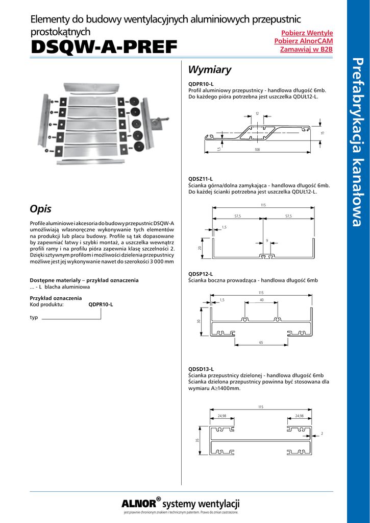 Elementy do budowy wentylacyjnych aluminiowych przepustnic Pobierz Wentyle prostokątnych DSQW-A-PREF Pobierz AlnorCAM Zamawiaj w B2B QDPR10-L Profil aluminiowy przepustnicy - handlowa długość 6mb. Do każdego pióra potrzebna jest uszczelka QDUŁ12-L. 15 12 1,5 108 QDSZ11-L Ścianka górna/dolna zamykająca - handlowa długość 6mb. Do każdej ścianki potrzebna jest uszczelka QDUŁ12-L. Opis 115 57,5 Dostępne materiały – przykład oznaczenia ... - L blacha aluminiowa Przykład oznaczenia Kod produktu: 57,5 1,5 9 20 Profile aluminiowe i akcesoria do budowy przepustnic DSQW-A umożliwiają własnoręczne wykonywanie tych elementów na produkcji lub placu budowy. Profile są tak dopasowane by zapewniać łatwy i szybki montaż, a uszczelka wewnątrz profili ramy i na profilu pióra zapewnia klasę szczelności 2. Dzięki sztywnym profilom i możliwości dzielenia przepustnicy możliwe jest jej wykonywanie nawet do szerokości 3 000 mm QDSP12-L Ścianka boczna prowadząca - handlowa długość 6mb 115 1,5 QDPR10-L 30 typ 40 65 QDSD13-L Ścianka przepustnicy dzielonej - handlowa długość 6mb Ścianka dzielona przepustnicy powinna być stosowana dla wymiaru A≥1400mm. 115 24,98 24,98 35 2 http://www.alnor.com.pl/produkty_pl/budowa-kanalow.html ALNOR® systemy wentylacji jest prawnie chronionym znakiem i technicznym patentem. Prawo do zmian zastrzeżone. Prefabrykacja kanałowa Wymiary Elementy do budowy wentylacyjnych aluminiowych przepustnic prostokątnych Pobierz Wentyle Pobierz AlnorCAM Zamawiaj w B2B Wymiary Wymiary QDUŁ12 Uszczelka gumowa do pióra QDPR10-L i ścianki QDSZ11-L QDZK06 Podkładka dystansująca. Potrzebna jest w przypadku, gdy wymiar przepustnicy wielopłaszczyznowej jest nietypowy np. 530x530. 9,5 �6,5 4 QDPMS80 Aluminiowa podstawka pod siłownik. Montowana jest do ścianki bocznej QDSP12-L. Potrzebna długość: 150-200mm w zależności o typu siłownika. QDMPS93-L Mechanizm przepustnicy 3 22,35 90 43,8 QDCPS93 Kompletny zestaw elementów wykonany jest z poliamidu i włókna szklanego i zawiera następujące elementy: - jedno koło zębate - jedna panewka łożyska - dwa trzpienie - lewa i prawa wsuwka 12 pod mechanizm ręczny 12 12 15 0 Pręt ciągniony o wymiarach 12x12mm PRET-A-12-12-100PRET-A-12-12-150 10 0 Prefabrykacja kanałowa DSQW-A-PREF 12 pod siłownik http://www.alnor.com.pl/produkty_pl/budowa-kanalow.html ALNOR® systemy wentylacji jest prawnie chronionym znakiem i technicznym patentem. Prawo do zmian zastrzeżone.