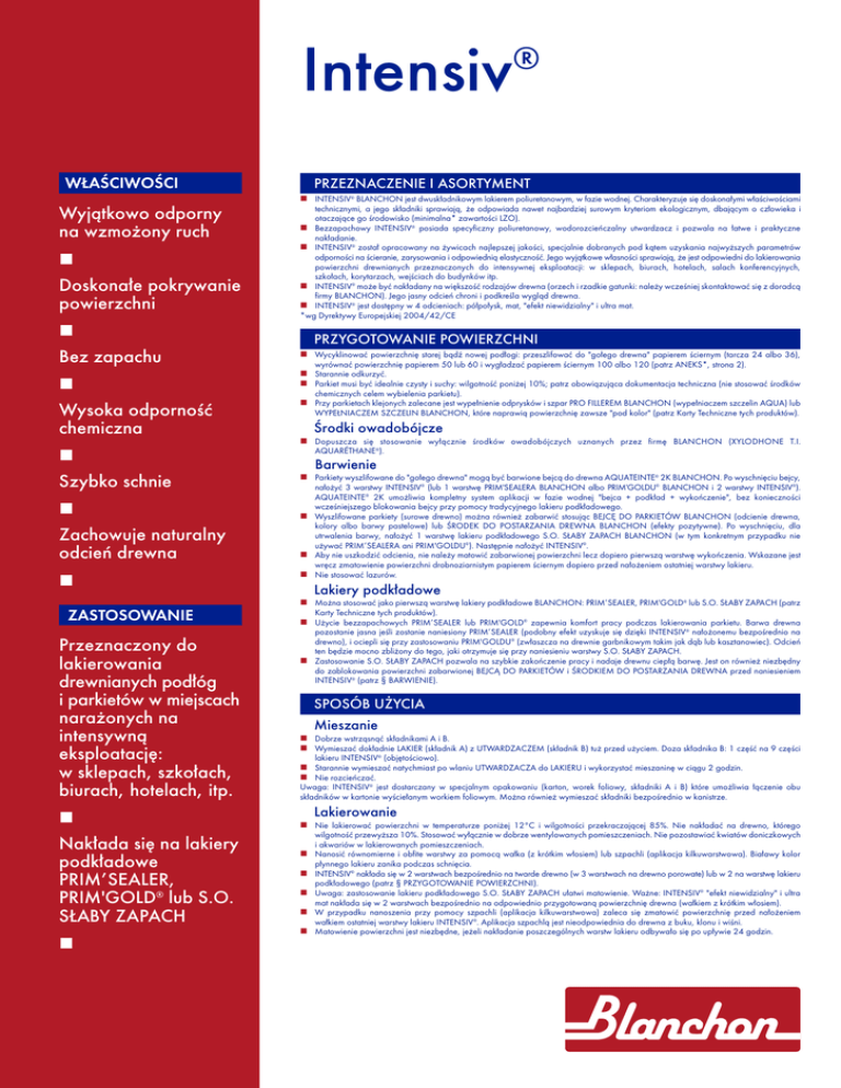 Intensiv WŁAŚCIWOŚCI Wyjątkowo odporny na wzmożony ruch n Doskonałe pokrywanie powierzchni n Bez zapachu n Wysoka odporność chemiczna n Szybko schnie n Zachowuje naturalny odcień drewna n ZASTOSOWANIE Przeznaczony do lakierowania drewnianych podłóg i parkietów w miejscach narażonych na intensywną eksploatację: w sklepach, szkołach, biurach, hotelach, itp. n Nakłada się na lakiery podkładowe PRIM’SEALER, PRIM'GOLD® lub S.O. SŁABY ZAPACH n ® PRZEZNACZENIE I ASORTYMENT n INTENSIV® BLANCHON jest dwuskładnikowym lakierem poliuretanowym, w fazie wodnej. Charakteryzuje się doskonałymi właściwościami technicznymi, a jego składniki sprawiają, że odpowiada nawet najbardziej surowym kryteriom ekologicznym, dbającym o człowieka i otaczające go środowisko (minimalna* zawartości LZO). n Bezzapachowy INTENSIV® posiada specyficzny poliuretanowy, wodorozcieńczalny utwardzacz i pozwala na łatwe i praktyczne nakładanie. n INTENSIV® został opracowany na żywicach najlepszej jakości, specjalnie dobranych pod kątem uzyskania najwyższych parametrów odporności na ścieranie, zarysowania i odpowiednią elastyczność. Jego wyjątkowe własności sprawiają, że jest odpowiedni do lakierowania powierzchni drewnianych przeznaczonych do intensywnej eksploatacji: w sklepach, biurach, hotelach, salach konferencyjnych, szkołach, korytarzach, wejściach do budynków itp. n INTENSIV® może być nakładany na większość rodzajów drewna (orzech i rzadkie gatunki: należy wcześniej skontaktować się z doradcą firmy BLANCHON). Jego jasny odcień chroni i podkreśla wygląd drewna. n INTENSIV® jest dostępny w 4 odcieniach: półpołysk, mat, "efekt niewidzialny" i ultra mat. *wg Dyrektywy Europejskiej 2004/42/CE PRZYGOTOWANIE POWIERZCHNI n Wycyklinować powierzchnię starej bądź nowej podłogi: przeszlifować do "gołego drewna" papierem ściernym (tarcza 24 albo 36), n Starannie odkurzyć. n Parkiet musi być idealnie czysty i suchy: wilgotność poniżej 10%; patrz obowiązująca dokumentacja techniczna (nie stosować środków wyrównać powierzchnię papierem 50 lub 60 i wygładzać papierem ściernym 100 albo 120 (patrz ANEKS*, strona 2). n Przy parkietach klejonych zalecane jest wypełnienie odprysków i szpar PRO FILLEREM BLANCHON (wypełniaczem szczelin AQUA) lub chemicznych celem wybielenia parkietu). WYPEŁNIACZEM SZCZELIN BLANCHON, które naprawią powierzchnię zawsze "pod kolor" (patrz Karty Techniczne tych produktów). Środki owadobójcze n Dopuszcza się stosowanie wyłącznie środków owadobójczych uznanych przez firmę BLANCHON (XYLODHONE T.I. AQUARÉTHANE®). Barwienie n Parkiety wyszlifowane do "gołego drewna" mogą być barwione bejcą do drewna AQUATEINTE® 2K BLANCHON. Po wyschnięciu bejcy, nałożyć 3 warstwy INTENSIV® (lub 1 warstwę PRIM'SEALERA BLANCHON albo PRIM'GOLDU® BLANCHON i 2 warstwy INTENSIV®). AQUATEINTE® 2K umożliwia kompletny system aplikacji w fazie wodnej "bejca + podkład + wykończenie", bez konieczności wcześniejszego blokowania bejcy przy pomocy tradycyjnego lakieru podkładowego. n Wyszlifowane parkiety (surowe drewno) można również zabarwić stosując BEJCĘ DO PARKIETÓW BLANCHON (odcienie drewna, kolory albo barwy pastelowe) lub ŚRODEK DO POSTARZANIA DREWNA BLANCHON (efekty pozytywne). Po wyschnięciu, dla utrwalenia barwy, nałożyć 1 warstwę lakieru podkładowego S.O. SŁABY ZAPACH BLANCHON (w tym konkretnym przypadku nie używać PRIM’SEALERA ani PRIM'GOLDU®). Następnie nałożyć INTENSIV®. n Aby nie uszkodzić odcienia, nie należy matowić zabarwionej powierzchni lecz dopiero pierwszą warstwę wykończenia. Wskazane jest wręcz zmatowienie powierzchni drobnoziarnistym papierem ściernym dopiero przed nałożeniem ostatniej warstwy lakieru. n Nie stosować lazurów. Lakiery podkładowe n Można stosować jako pierwszą warstwę lakiery podkładowe BLANCHON: PRIM’SEALER, PRIM'GOLD® lub S.O. SŁABY ZAPACH (patrz n Użycie bezzapachowych PRIM’SEALER lub PRIM'GOLD® zapewnia komfort pracy podczas lakierowania parkietu. Barwa drewna Karty Techniczne tych produktów). pozostanie jasna jeśli zostanie naniesiony PRIM’SEALER (podobny efekt uzyskuje się dzięki INTENSIV® nałożonemu bezpośrednio na drewno), i ociepli się przy zastosowaniu PRIM'GOLDU® (zwłaszcza na drewnie garbnikowym takim jak dąb lub kasztanowiec). Odcień ten będzie mocno zbliżony do tego, jaki otrzymuje się przy naniesieniu warstwy S.O. SŁABY ZAPACH. n Zastosowanie S.O. SŁABY ZAPACH pozwala na szybkie zakończenie pracy i nadaje drewnu ciepłą barwę. Jest on również niezbędny do zablokowania powierzchni zabarwionej BEJCĄ DO PARKIETÓW i ŚRODKIEM DO POSTARZANIA DREWNA przed naniesieniem INTENSIV® (patrz § BARWIENIE). SPOSÓB UŻYCIA Mieszanie n Dobrze wstrząsnąć składnikami A i B. n Wymieszać dokładnie LAKIER (składnik A) z UTWARDZACZEM (składnik B) tuż przed użyciem. Doza składnika B: 1 część na 9 części n Starannie wymieszać natychmiast po wlaniu UTWARDZACZA do LAKIERU i wykorzystać mieszaninę w ciągu 2 godzin. n Nie rozcieńczać. lakieru INTENSIV® (objętościowo). Uwaga: INTENSIV® jest dostarczany w specjalnym opakowaniu (karton, worek foliowy, składniki A i B) które umożliwia łączenie obu składników w kartonie wyściełanym workiem foliowym. Można również wymieszać składniki bezpośrednio w kanistrze. Lakierowanie n Nie lakierować powierzchni w temperaturze poniżej 12°C i wilgotności przekraczającej 85%. Nie nakładać na drewno, którego wilgotność przewyższa 10%. Stosować wyłącznie w dobrze wentylowanych pomieszczeniach. Nie pozostawiać kwiatów doniczkowych i akwariów w lakierowanych pomieszczeniach. n Nanosić równomierne i obfite warstwy za pomocą wałka (z krótkim włosiem) lub szpachli (aplikacja kilkuwarstwowa). Białawy kolor n INTENSIV® nakłada się w 2 warstwach bezpośrednio na twarde drewno (w 3 warstwach na drewno porowate) lub w