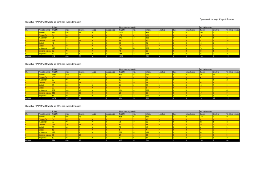 Opracował: mł. ogn. Krzysztof Jacak Statystyki KP PSP w Otwocku za 2016 rok- względem gmin Pożary Miejscowe zagrożenia Alarmy fałszywe LP. Powiat / gmina RAZEM małe średnie duże bardzo duże RAZEM małe lokalne średnie duże gigantyczne Razem Złośliwe W dobrej wierze 1 otwocki 662 626 36 0 0 1002 122 872 8 0 0 290 7 157 2 Celestynów 84 78 6 0 0 137 6 130 1 0 0 16 2 14 3 m. Józefów 76 68 8 0 0 140 17 122 1 0 0 81 1 32 4 Karczew 148 137 11 0 0 94 11 80 3 0 0 31 1 20 5 Kołbiel 41 41 0 0 0 77 6 71 0 0 0 12 1 11 6 Osieck 10 10 0 0 0 24 4 20 0 0 0 3 0 3 7 m. Otwock 179 174 5 0 0 321 56 265 0 0 0 79 1 36 8 Sobienie-Jeziory 82 79 3 0 0 41 4 36 1 0 0 25 1 15 9 Wiązowna 42 39 3 0 0 168 18 148 2 0 0 43 0 26 662 626 36 0 0 1002 122 872 8 0 0 290 7 157 RAZEM: Statystyki KP PSP w Otwocku za 2015 rok- względem gmin Pożary Miejscowe zagrożenia Alarmy fałszywe LP. Powiat / gmina RAZEM małe średnie duże bardzo duże RAZEM małe lokalne średnie duże gigantyczne Razem Złośliwe W dobrej wierze 1 otwocki 1157 1075 79 3 0 801 76 720 5 0 0 291 17 157 2 Celestynów 133 124 8 1 0 87 3 84 0 0 0 6 0 6 3 m. Józefów 93 88 4 1 0 92 11 80 1 0 0 55 1 25 4 Karczew 328 293 34 1 0 91 10 79 2 0 0 43 4 27 5 Kołbiel 89 84 5 0 0 81 3 78 0 0 0 14 3 11 6 Osieck 32 31 1 0 0 9 1 8 0 0 0 1 0 1 7 m. Otwock 282 269 13 0 0 291 33 256 2 0 0 122 5 62 8 Sobienie-Jeziory 116 106 10 0 0 28 3 25 0 0 0 19 3 7 9 Wiązowna 84 80 4 0 0 122 12 110 0 0 0 31 1 18 1157 1075 79 3 0 801 76 720 5 0 0 291 17 157 RAZEM: Statystyki KP PSP w Otwocku za 2014 rok- względem gmin Pożary Miejscowe zagrożenia Alarmy fałszywe LP. Powiat / gmina RAZEM małe średnie duże bardzo duże RAZEM małe lokalne średnie duże gigantyczne Razem Złośliwe W dobrej wierze 1 otwocki 771 698 72 1 0 608 95 511 1 1 0 150 7 86 2 Celestynów 54 45 9 0 0 53 7 46 0 0 0 4 1 3 3 m. Józefów 72 70 2 0 0 76 10 66 0 0 0 22 1 15 4 Karczew 247 214 33 0 0 63 8 55 0 0 0 34 2 18 5 Kołbiel 39 36 3 0 0 57 9 47 1 0 0 3 0 3 6 Osieck 18 16 2 0 0 5 1 4 0 0 0 3 0 3 7 m. Otwock 179 172 7 0 0 228 45 183 0 0 0 53 2 21 8 Sobienie-Jeziory 80 69 10 1 0 29 6 23 0 0 0 5 0 5 9 Wiązowna 82 76 6 0 0 97 9 87 0 1 0 26 1 18 771 698 72 1 0 608 95 511 1 1 0 150 7 86 RAZEM: OGÓŁEM ZDARZEŃ Z inst. wykr. Ogółem zdarzeń 126 1954 0 237 48 297 10 273 0 130 0 37 42 579 9 148 17 253 126 1954 OGÓŁEM ZDARZEŃ Z inst. wykr. Ogółem zdarzeń 117 2249 0 226 29 240 12 462 0 184 0 42 55 695 9 163 12 237 117 2249 OGÓŁEM ZDARZEŃ Z inst. wykr. Ogółem zdarzeń 57 1529 0 111 6 170 14 344 0 99 0 26 30 460 0 114 7 205 57 1529